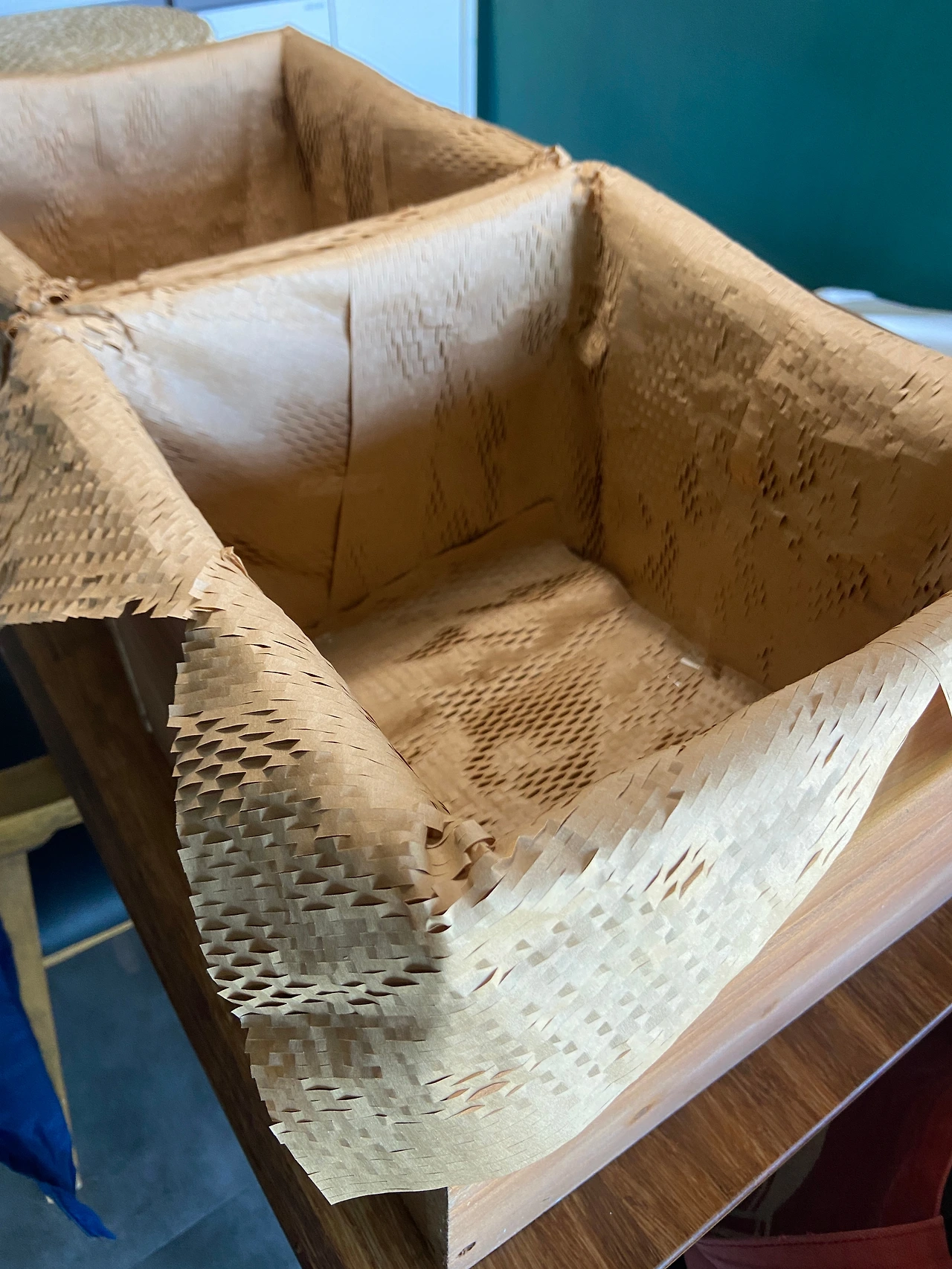 그런데 어느날, 집 안을 둘러보던 중 우드박스와 라탄바구니가 눈에 들어왔다. 이걸 활용해서 여기에 종이 완충재나 천을 구겨 넣고 그 위에 다과를 담으면, 따로 무언가를 새로 구입할 필요도 없이, 오히려 자연스럽고 빈티지한 무드를 연출할 수 있을 것 같았다.