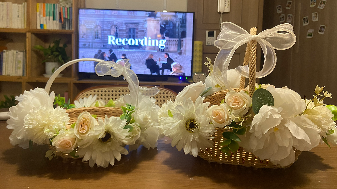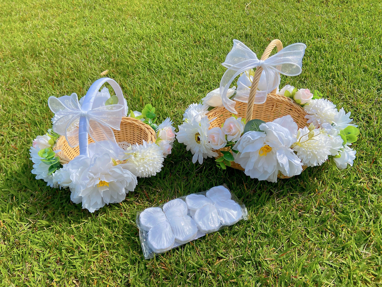 과거 취미로 만들었던 라탄 바구니 두 개에 조화 꽃잎을 글루건으로 하나씩 붙이고, 손잡이엔 리본끈을 둘러 예쁘게 마무리했다. 손잡이가 없는 바구니엔 머리띠를 손잡이 대용으로 붙이고, 리본으로 감싸 마치 처음부터 그런 디자인인 냥 완성했다.