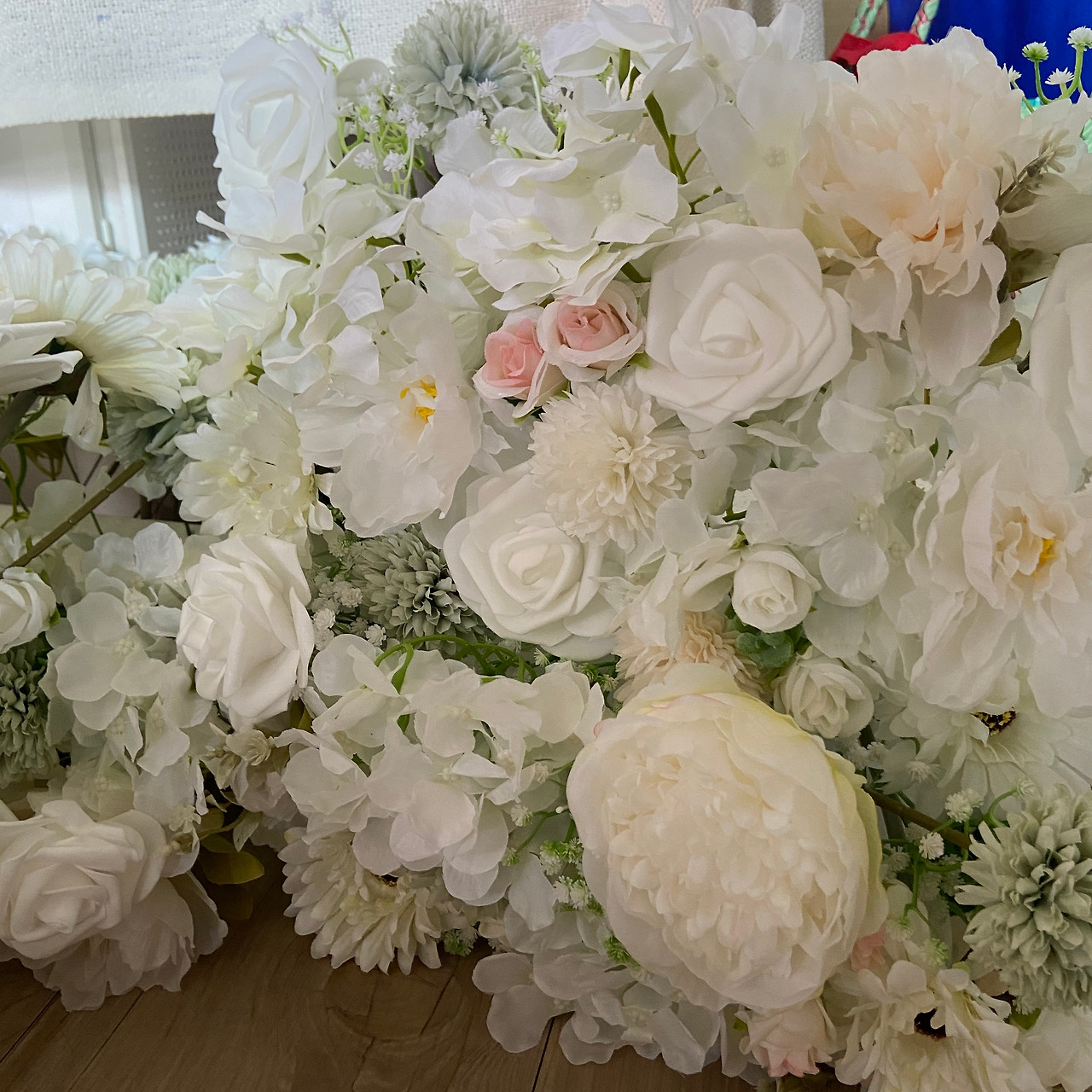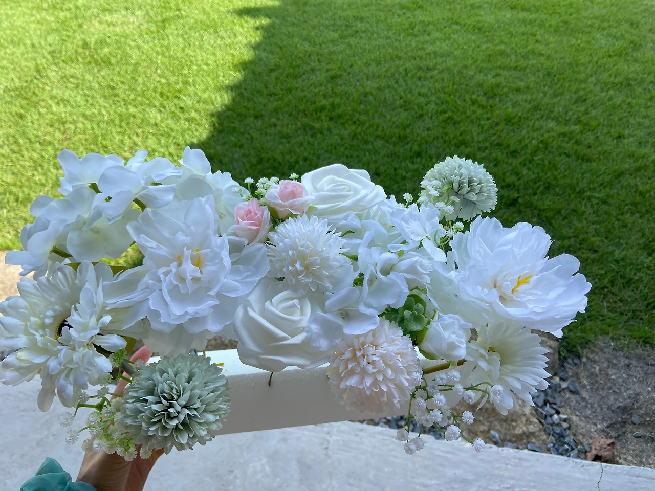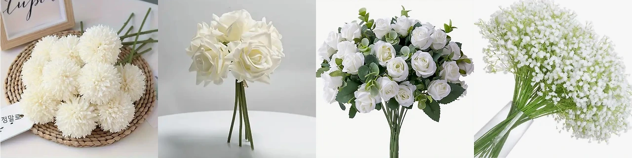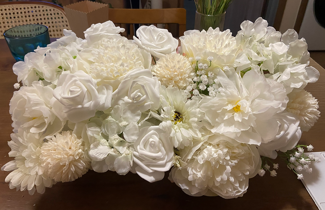 테무의 도움으로 한 송이당 평균 500원대의 조화들 중, 상대적으로 퀄리티가 나은 것들을 골라 담았다. 저렴한 건 300~400원대, 비싼 건 800~900원대까지 — 데이지, 모란, 수국, 장미, 민들레 등 다양한 종류를 ‘화이트’ 계열 중심으로, 약간의 그린톤과 살구빛, 분홍빛을 포인트로 구입했다.
