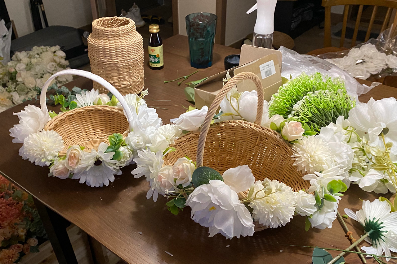 여기서 멈추지 않고, 화동바구니도 직접 만들었다. 처음에는 인터넷 쇼핑몰을 둘러봤지만, 사진을 보니 “이 정도라면 내가 만들 수도 있겠는데?”— 라는 생각이 들었다.