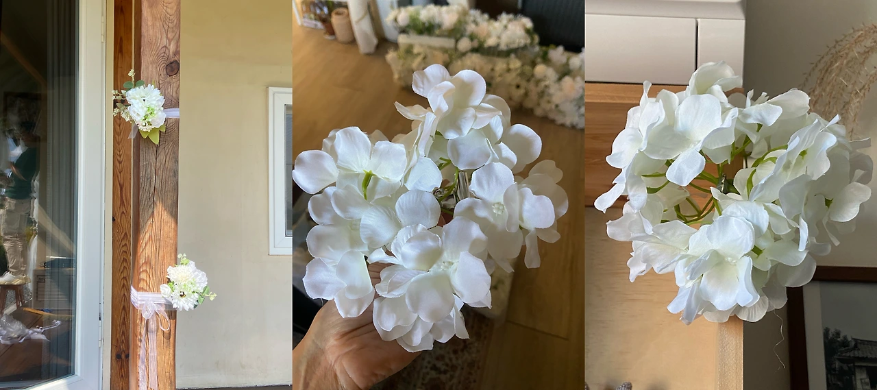 그렇게 남은 꽃들을 조합해 만든 미니 꽃다발로 혼주석과 툇마루 기둥 등을 꾸미고 숙소로 들어오는 골목길의 기와 위에도 수국 장식을 달기로 했다. 어떻게 고정할 수 있을지 고민하던 중 배우자가 ‘집게’ 아이디어를 냈고, 조화 수국 두 송이를 글루건으로 집게에 붙여 기와에 간단히 고정하는 방식으로 완성했다.
