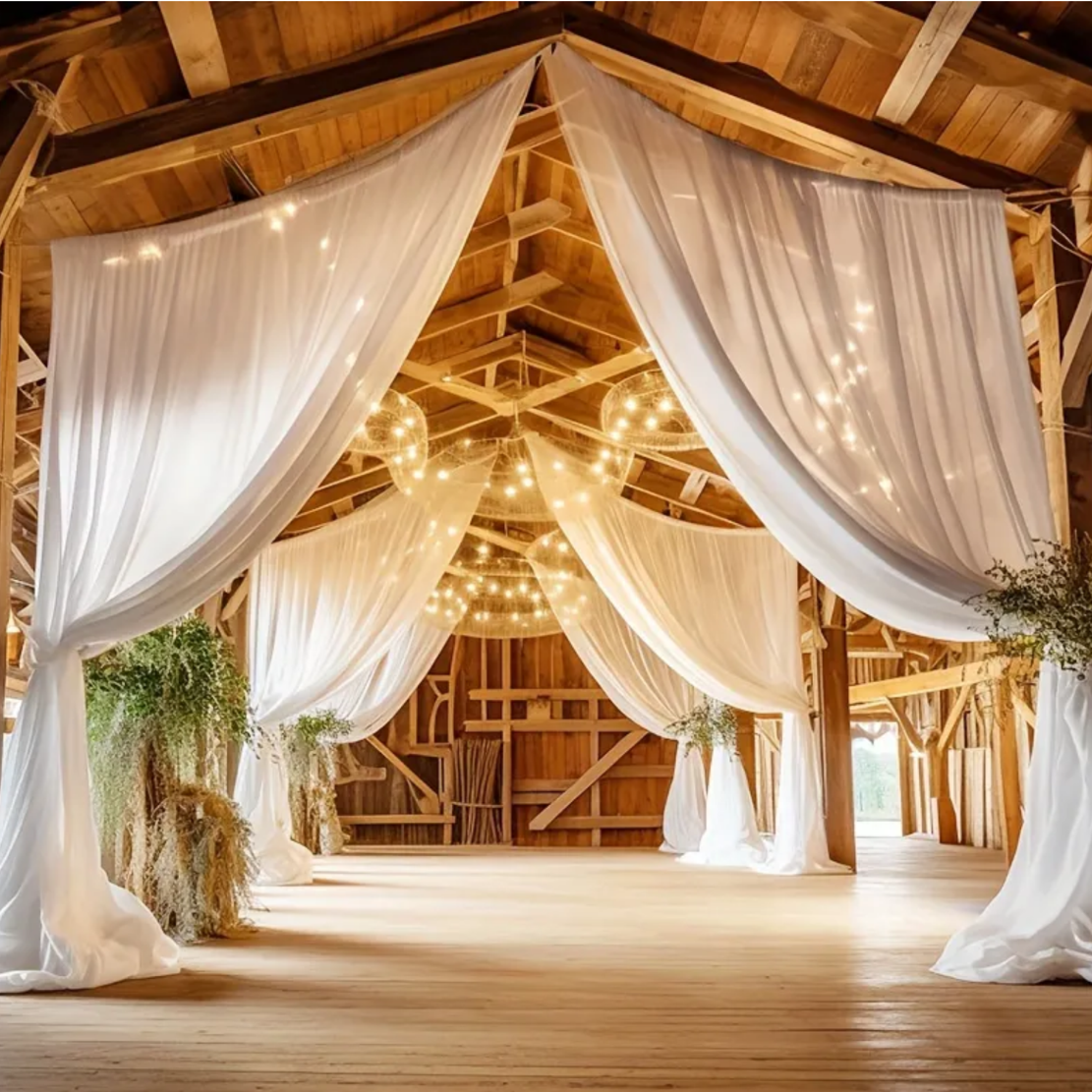 한옥의 처마에 무언가 하늘하늘한 장식을 더하면, 자연과 조화를 이루는 고즈넉한 분위기를 연출할 수 있을 것 같았다. 처음엔 한지 같은 무언가를 생각했지만, 우연히 인터넷에서 본 야외 결혼식 사진 속 아치에 매단 하얀 천이 인상 깊었고 이 천을 처마에 매달면 참 멋스러울 것 같았다.