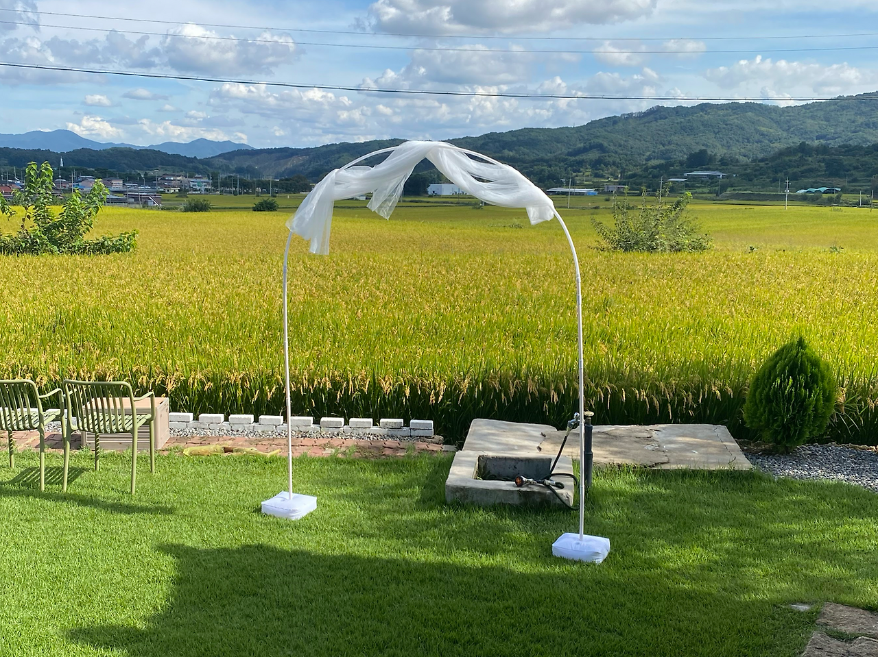 처음에는 긴 나무를 구해 논에 박아 아치처럼 직접 만들어볼까도 생각했지만, 테무를 살펴보던 중 다양한 철제 아치를 발견했다. 원형, 사각형, 아치형 등 여러 모양이 있었지만, 우리는 부드러운 곡선이 아름다운 아치형을 선택했다.