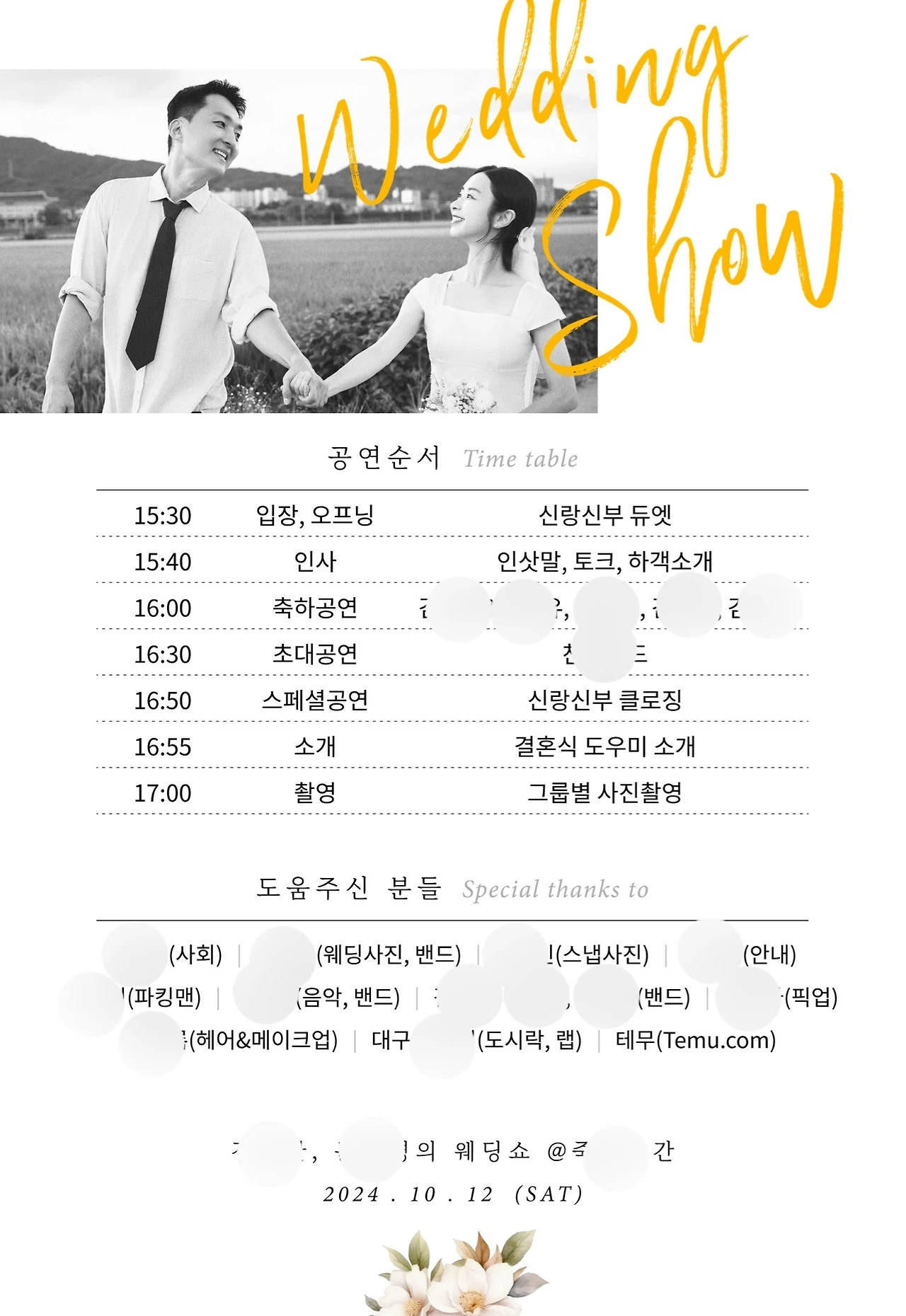 1부는 짧은 절차였기에 별도의 안내문은 필요 없었지만, 2부는 약 1시간 30분가량 진행되는 긴 예식이었기에 간단한 순서 안내가 있으면 좋겠다고 생각했다.