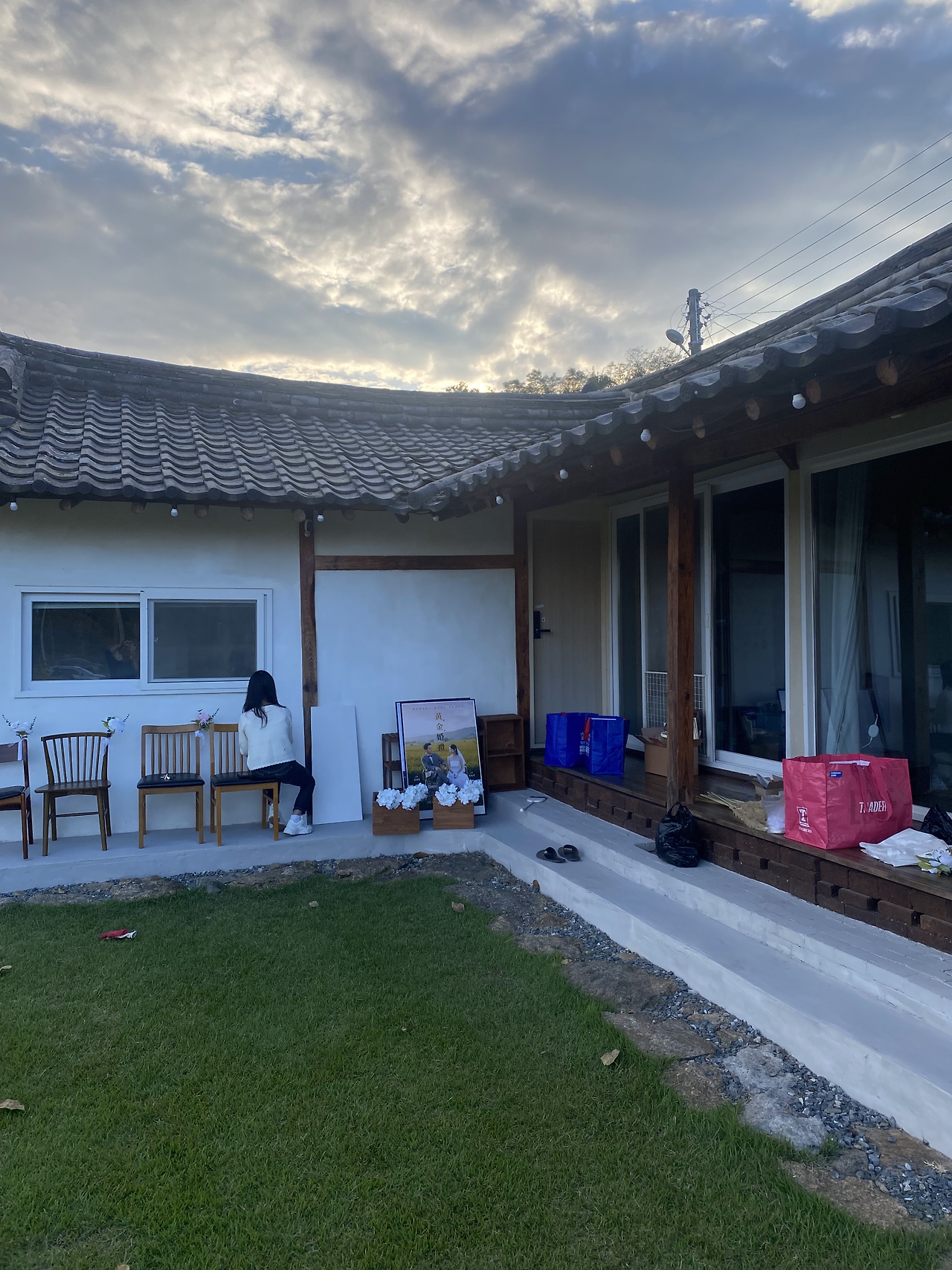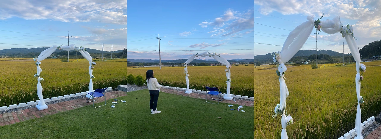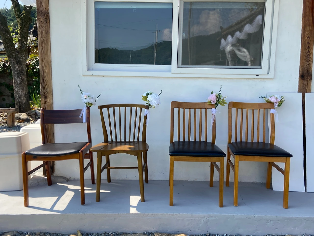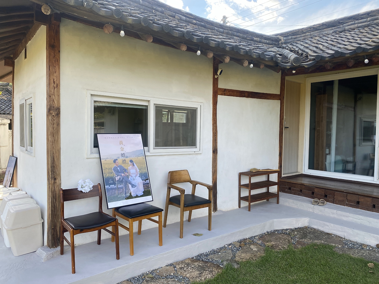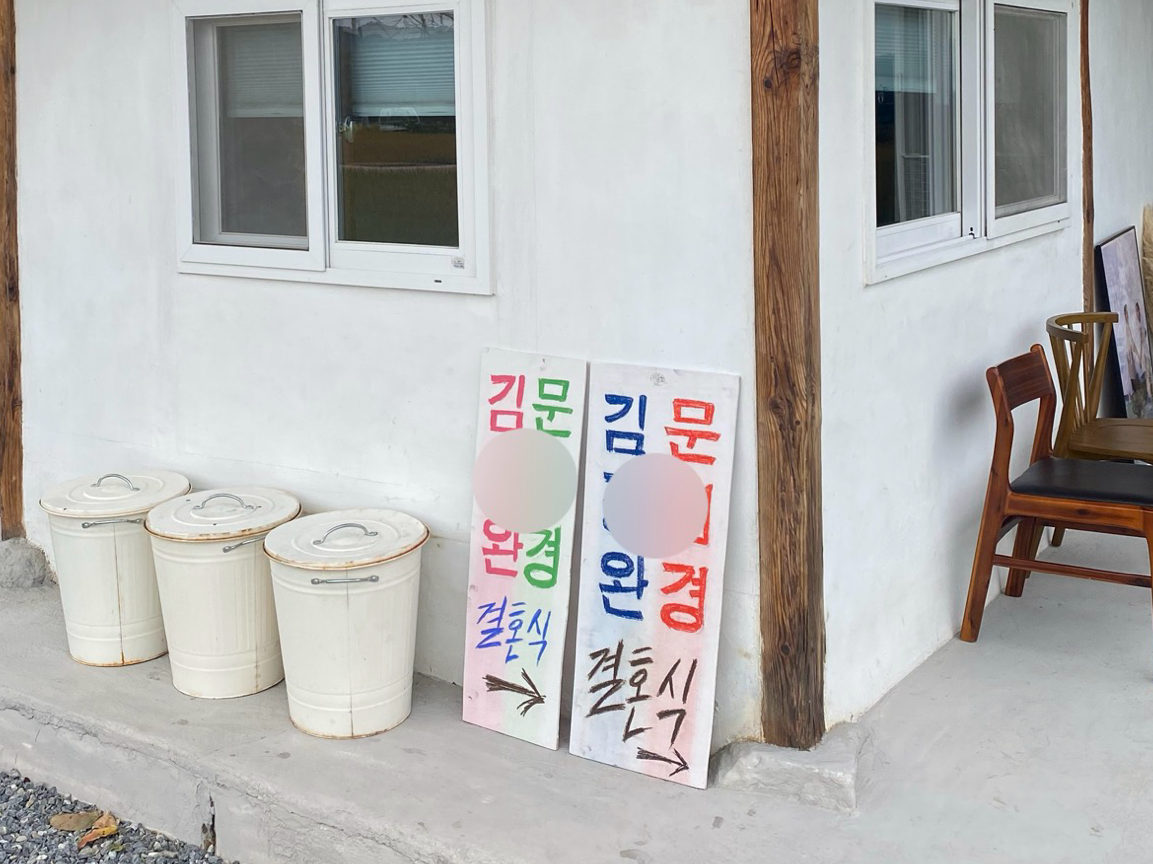 그날 오후에는 입구에 둘 결혼식 포스터 액자와 여분의 의자를 지인분께 빌려왔다. 포스터 액자는 외부에 뒀더니 사진 사이로 습기가 살짝 차는 것이 보여 실내에 보관하다가 당일에 꺼내기로 했고, 자갈마당에 놔둘 의자도 여유분으로 더 챙겨 왔다.