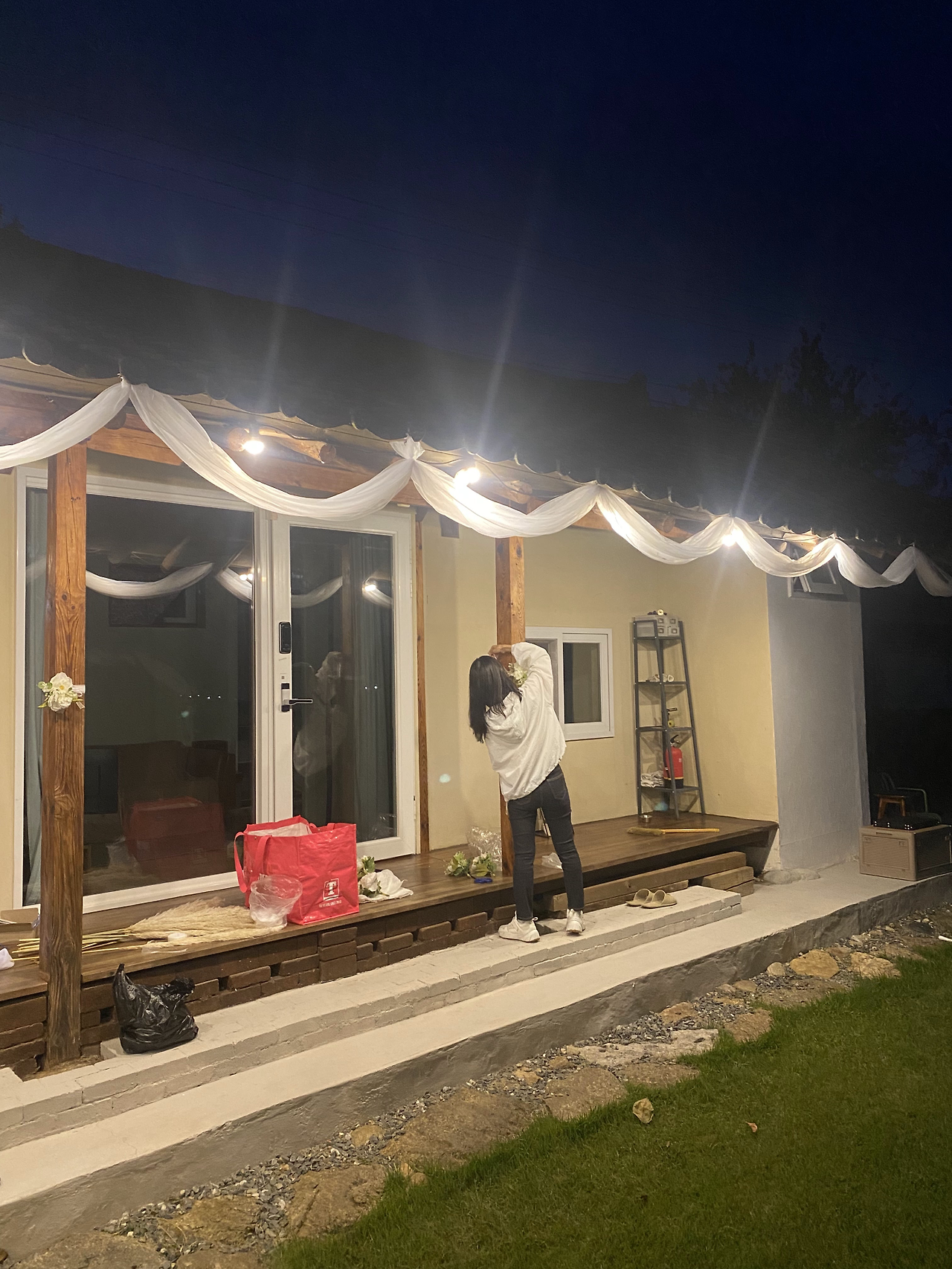 수제 예식장 꾸미기의 하이라이트, 처마 천 달기를 마침내 해냈다. 기존 처마에 걸려 있던 전구줄을 활용해 천을 구름 물결처럼 부드럽게 흐르도록 잡아 고정했다.