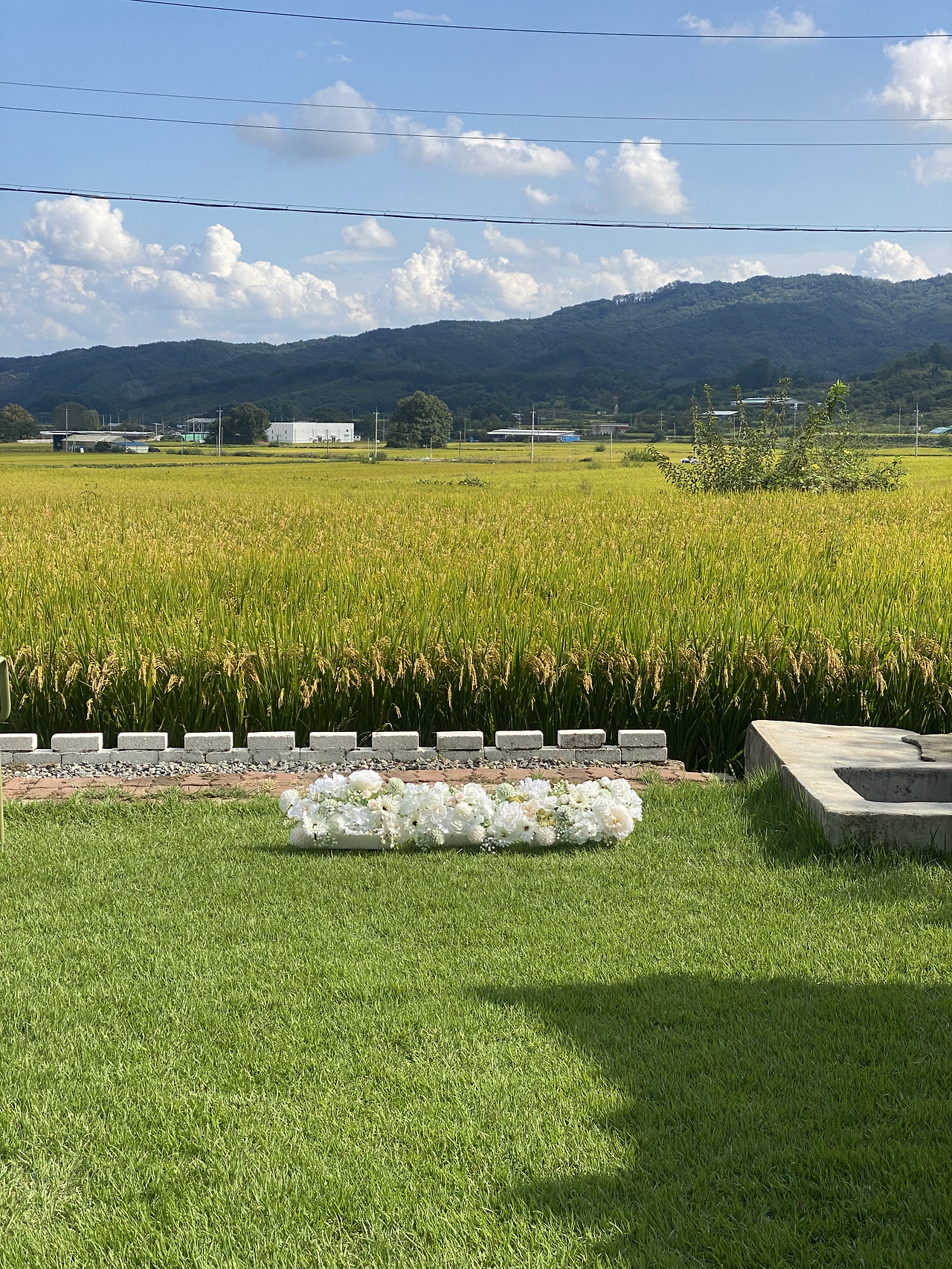 센터피스는 이미 완성해 두었지만 의자나 아치에 달 장식은 아직 손보아야 할 부분이 남아 있었기 때문이다. 완성된 조화 센터피스는 잔디 마당 위에 올려보았는데 그 모습이 제법 앙증맞게 어우러져 마음에 들었다.