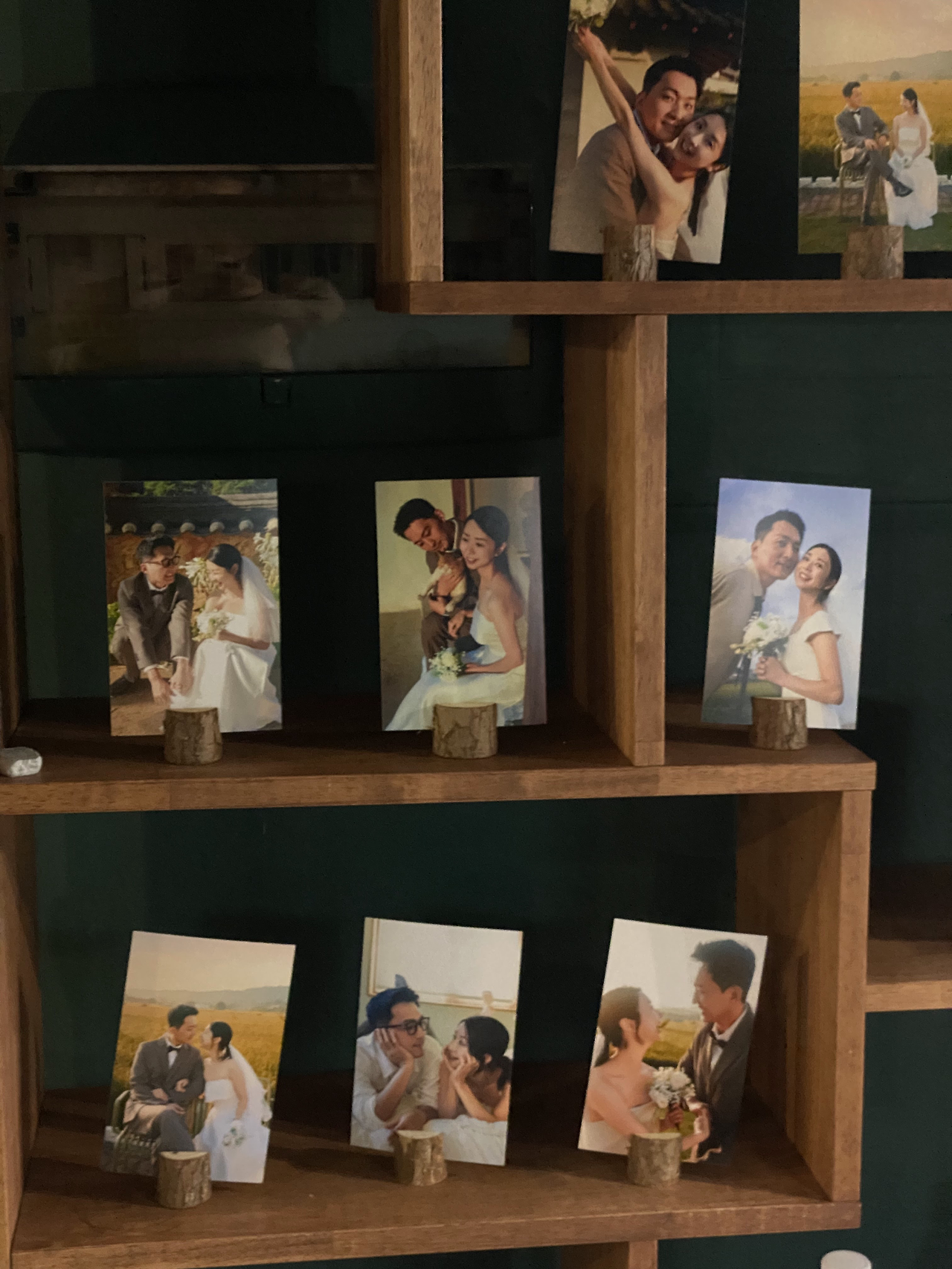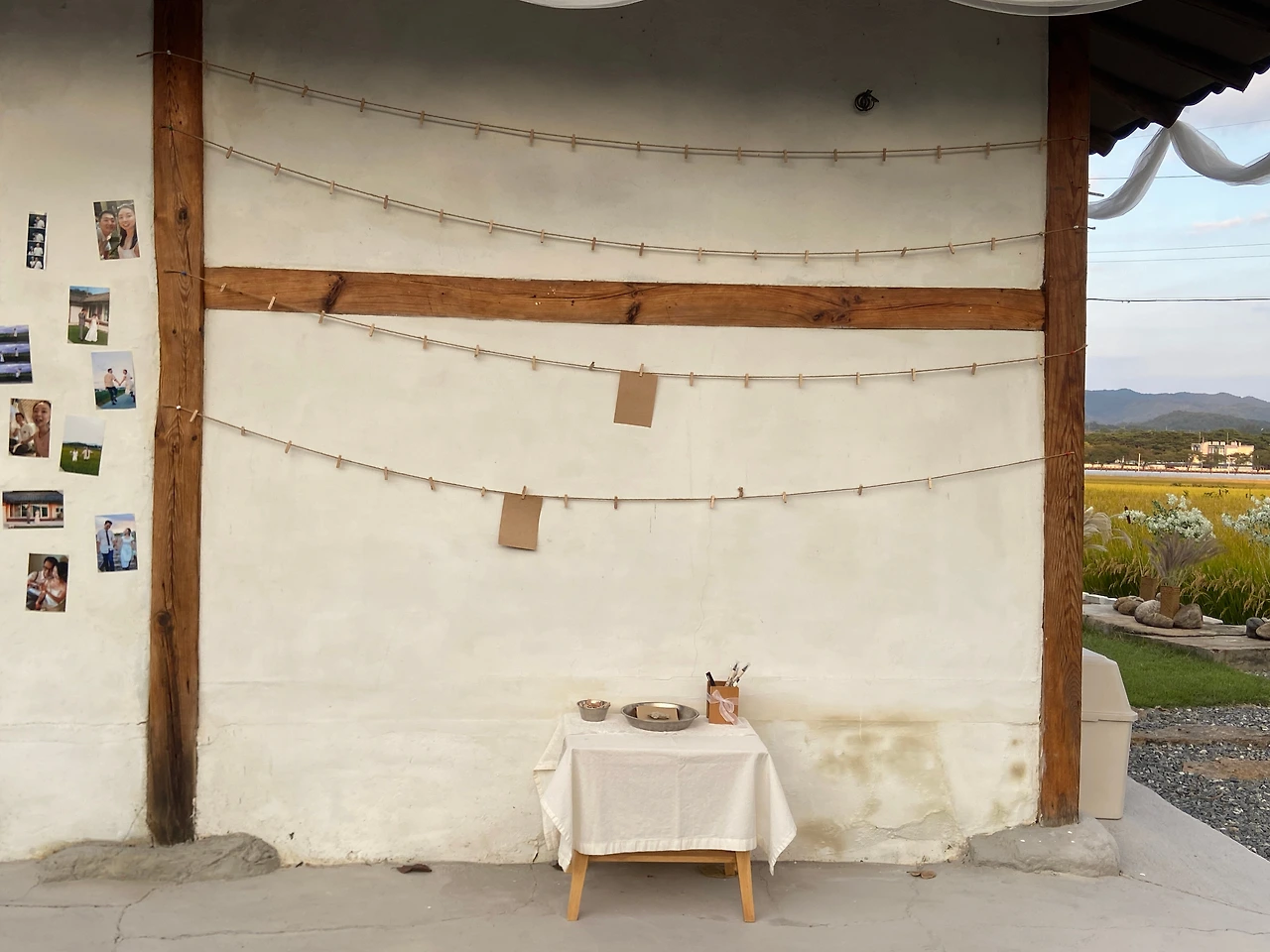 집에서 잘라온 크라프트지를 비치하고 벽에는 마끈과 나무집게를 걸어뒀다. 종이테이프로 해보니 잘 떨어져서 압정으로 끈을 고정시켰다. 그리고 그 옆의 또 다른 벽에는 우리의 웨딩 사진으로 마음껏 꾸며보았다.