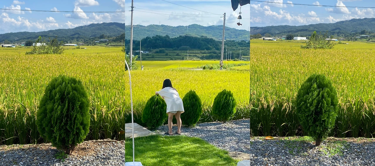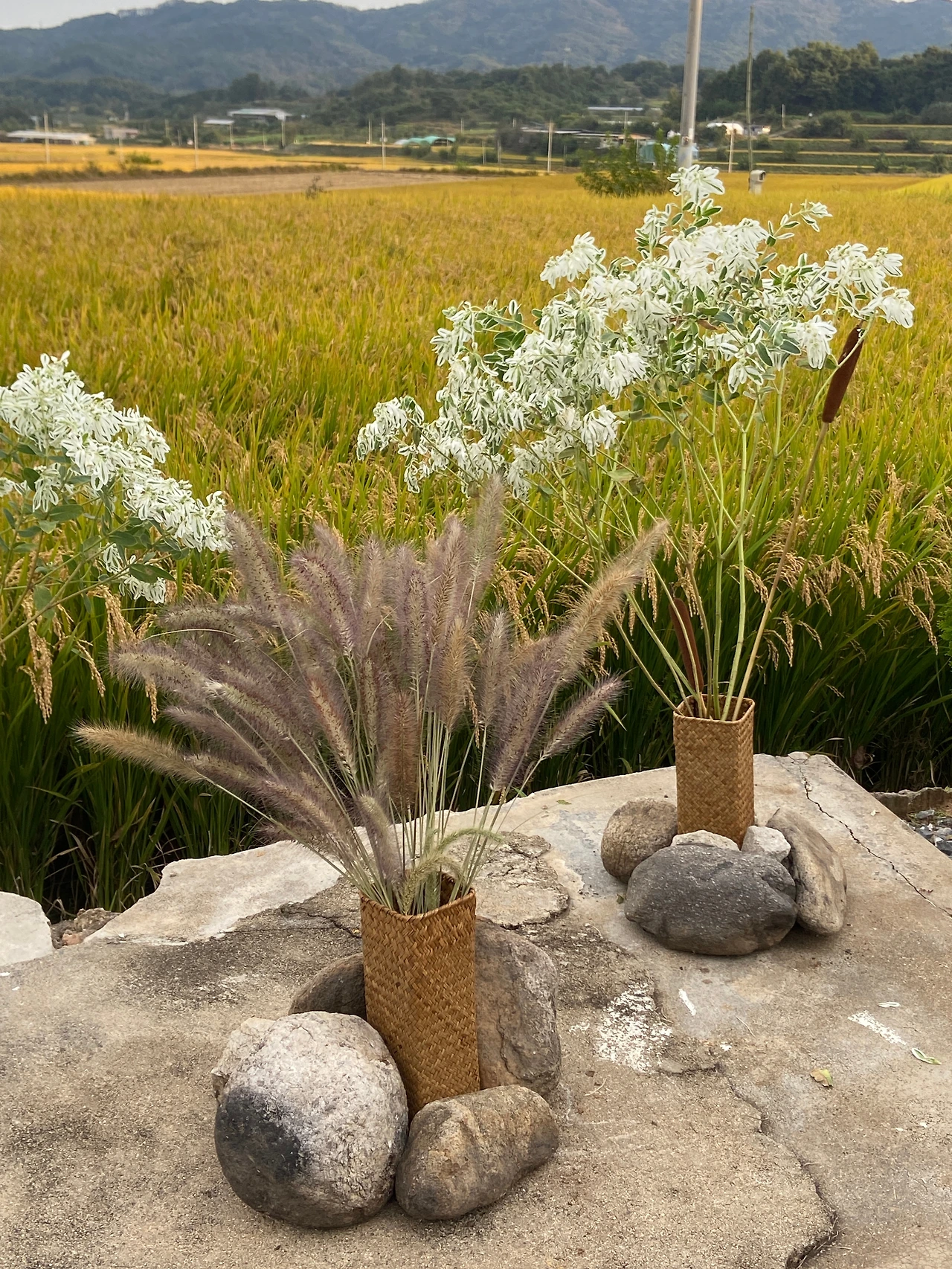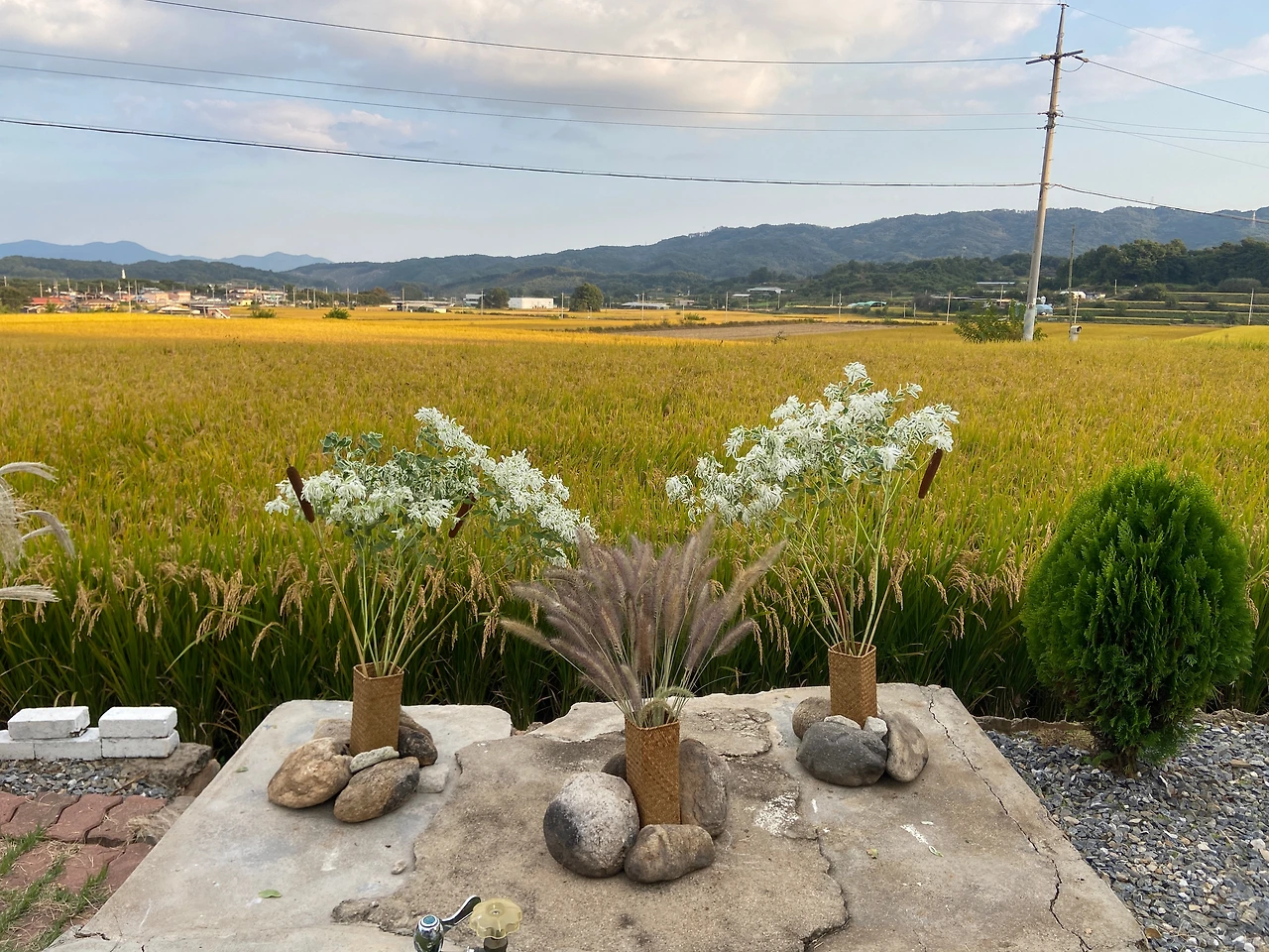 또한 미리 사둔 라탄 화병에는 강아지풀과 설악초, 부들을 꽂아 낡은 수돗가 위를 장식했고, 바람에 쓰러지지 않도록 감나무 아래에 있던 커다란 돌을 가져와 단단히 고정했다.