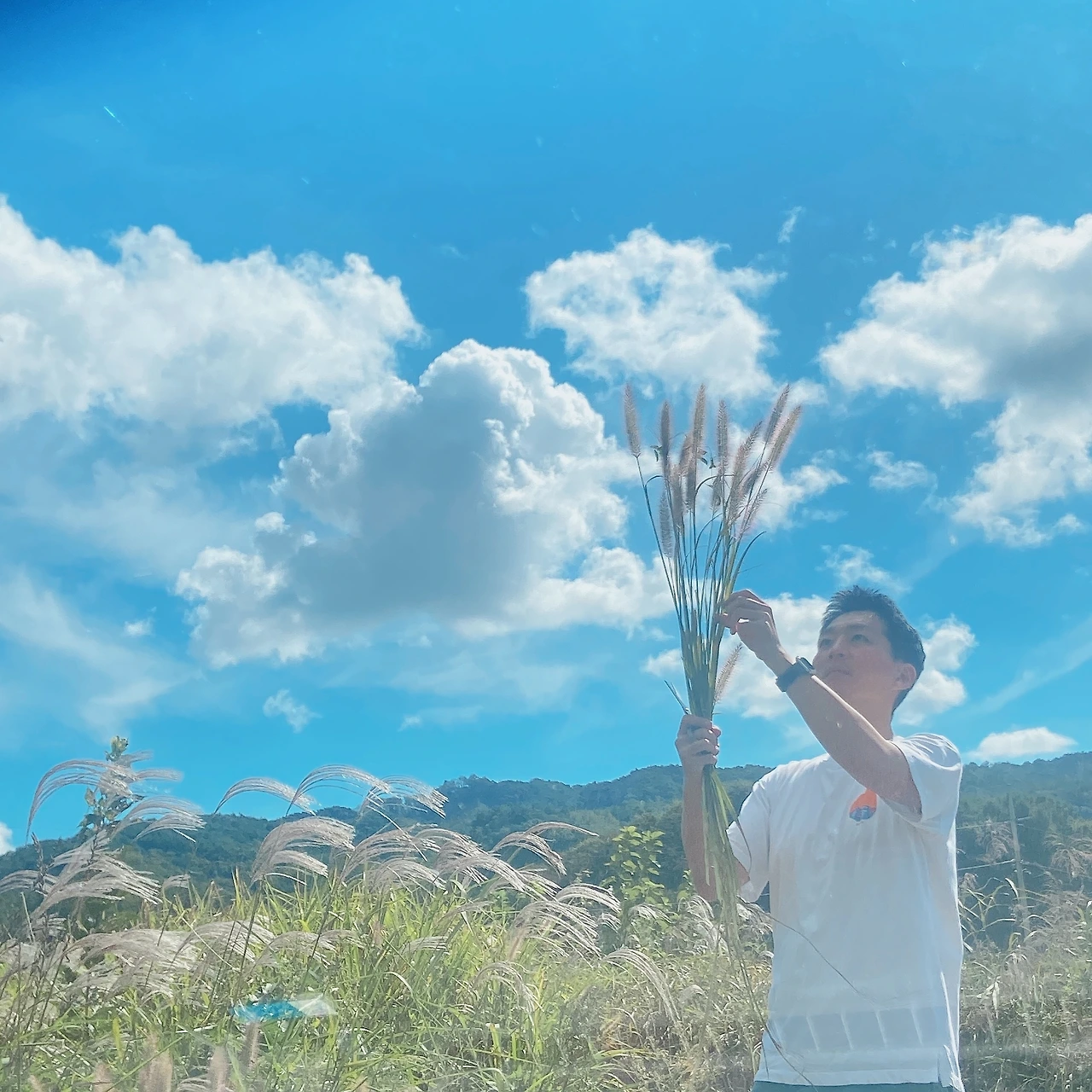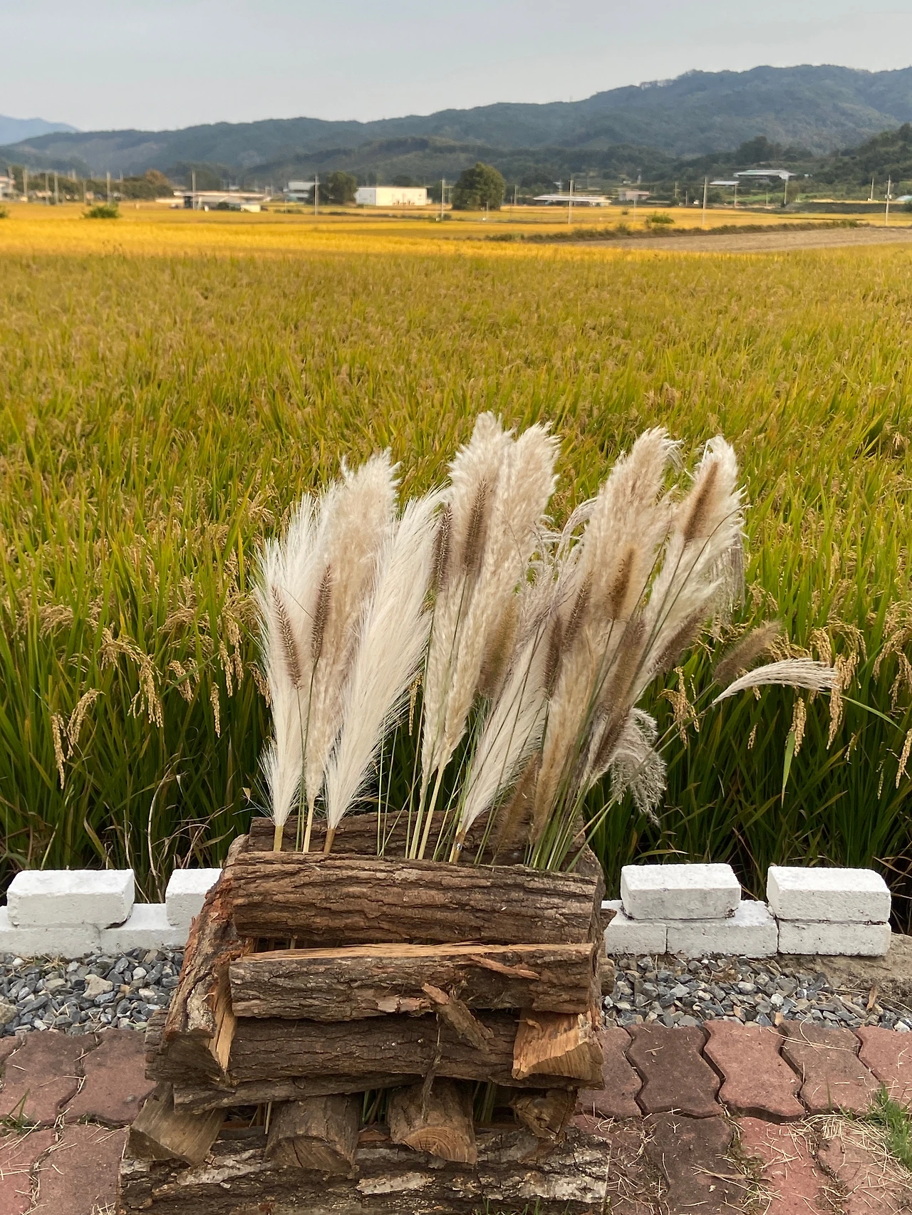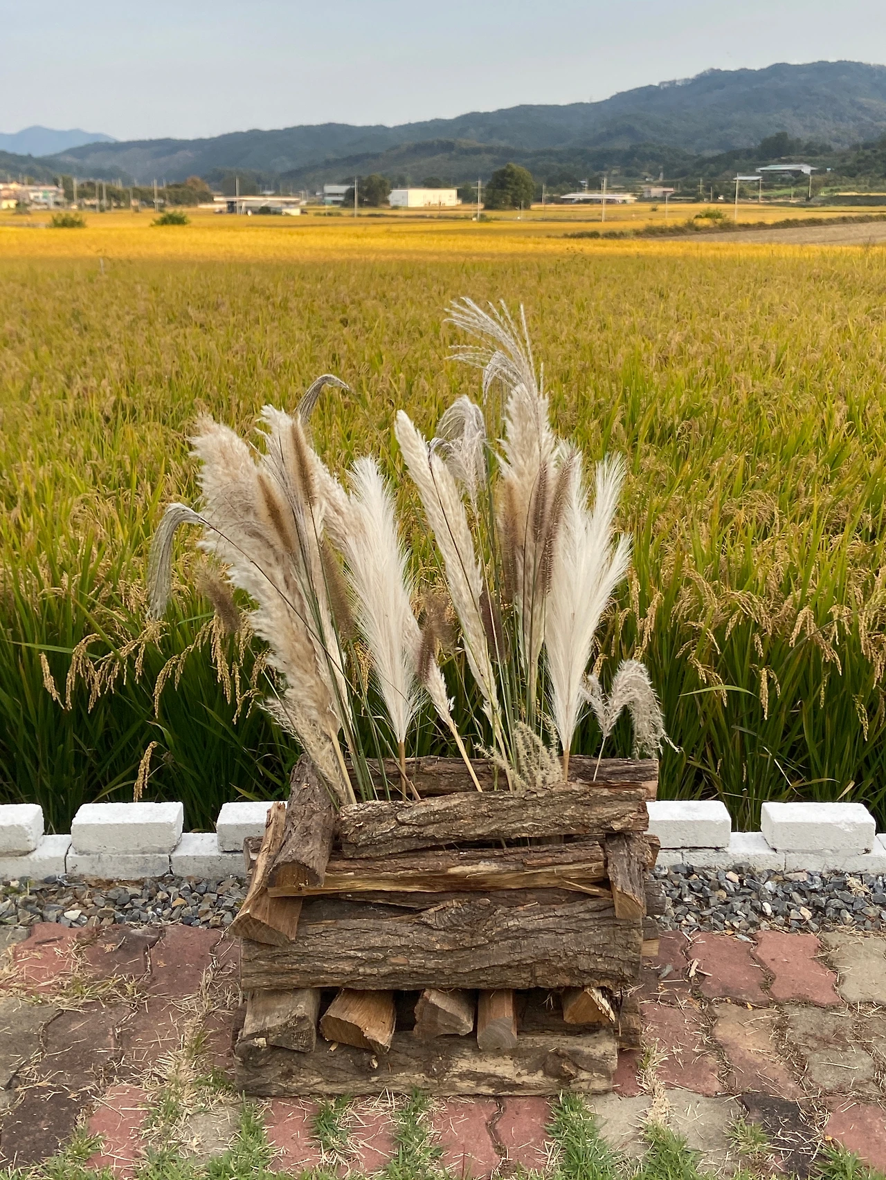 작업은 생각보다 더디고 고됐지만, 정성껏 쌓아낸 틈 사이로 몇 송이를 꽂아두자마자 그 투박한 나뭇결 사이로 초가을의 들녘이 은근하게 피어났다. 다만, 멋스러운 억새의 존재감을 살리기엔 양이 턱없이 부족해서 아쉽긴 했다. 하지만 다행히 그 빈틈은 미리 준비해 두었던 조화 팜파스가 은근히 잘 메워주었다.