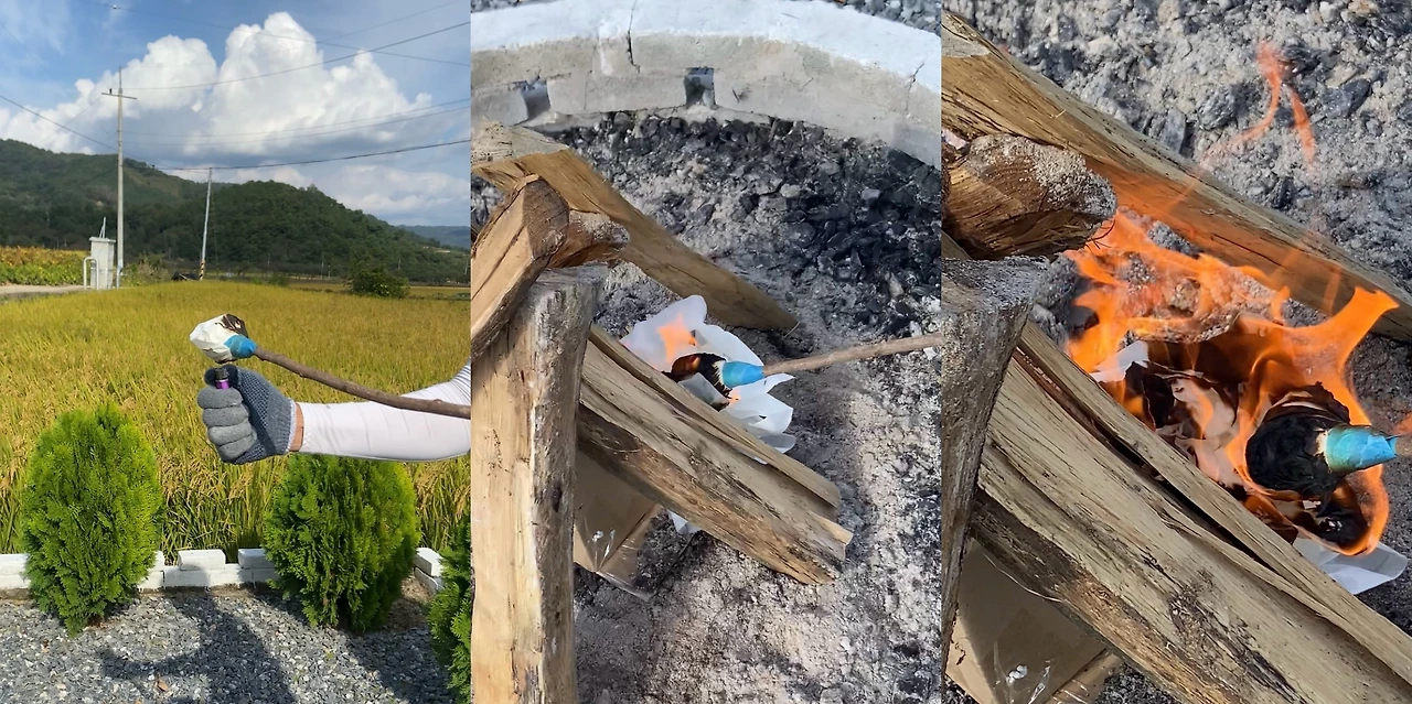 1부 예식의 첫 순서인 혼주 어머니들의 장작 점화를 미리 테스트해 보았다. 긴 막대 끝에 감은 휴지에 불을 붙여봤는데, 생각보다 느리게 타올라서 당일에는 더 원활한 점화를 위해 기름을 조금 묻혀두기로 했다.