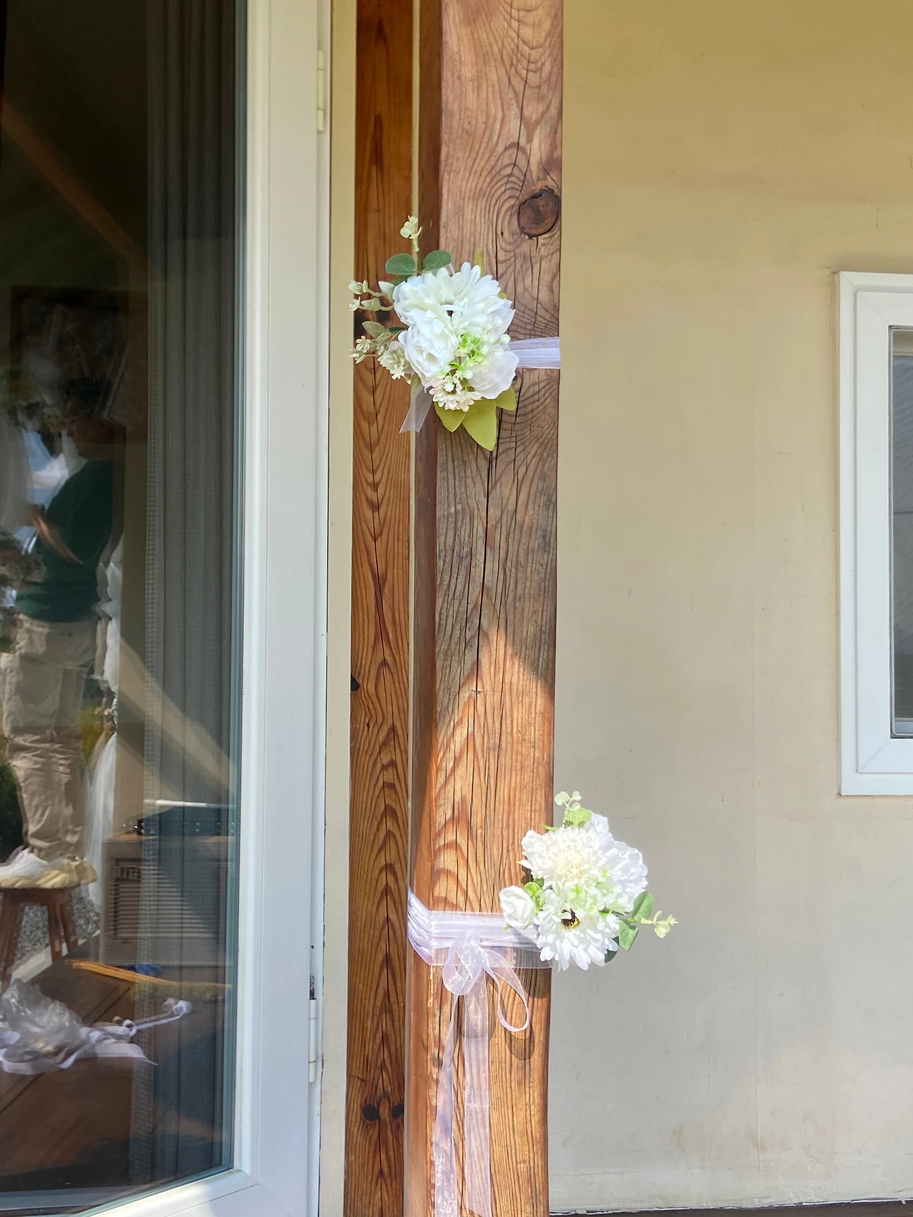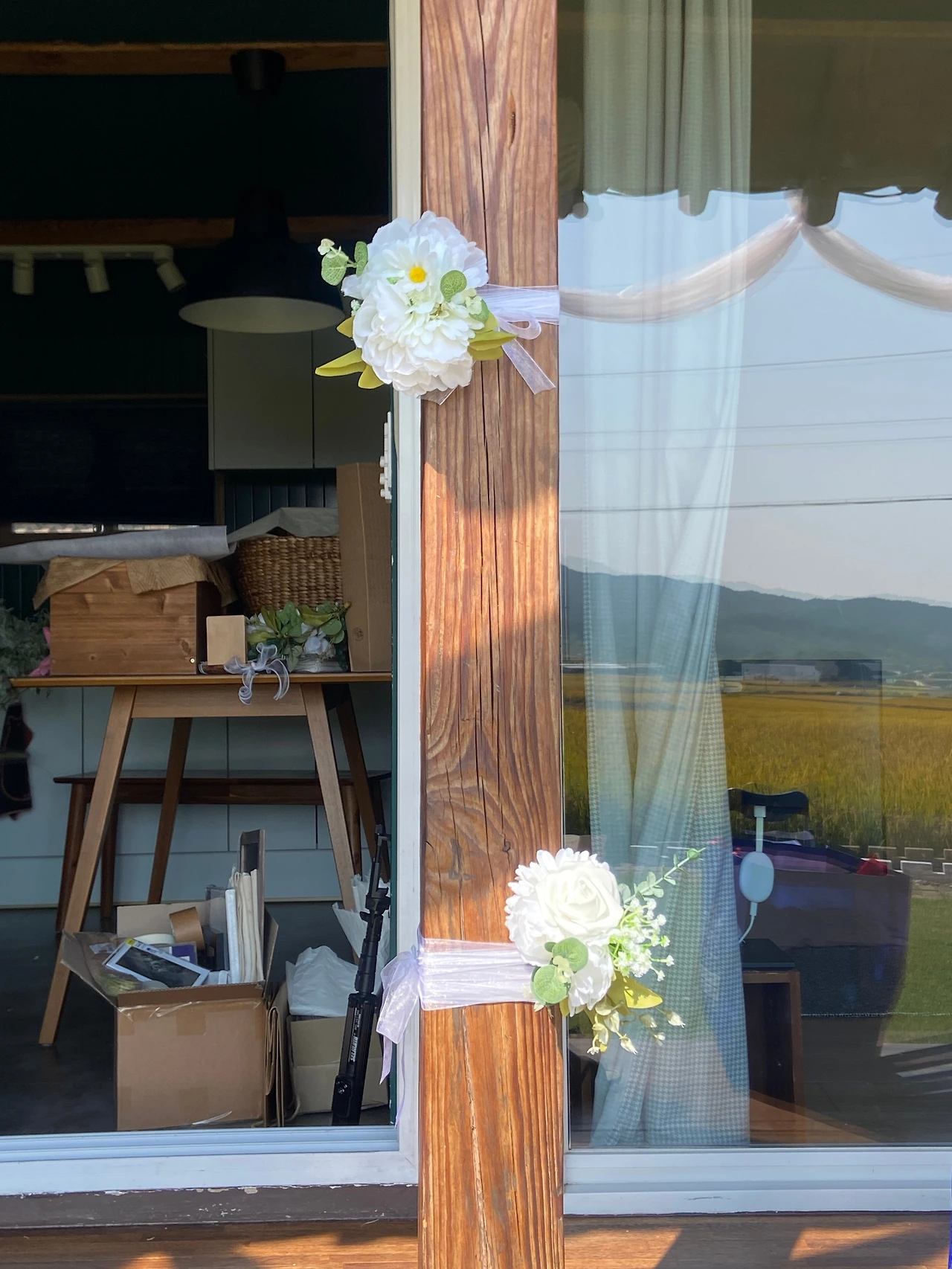 마지막으로 두 개의 큰 나무 기둥에는 조화를 세 개씩 매달아 예식 분위기를 완성했다. 리본끈으로 고정했는데 꽃잎이 앞으로 향하게끔 달아야 하다 보니 생각보다는 쉽지 않았다. 그래서 결국 밤까지 작업이 이어져 버렸다.