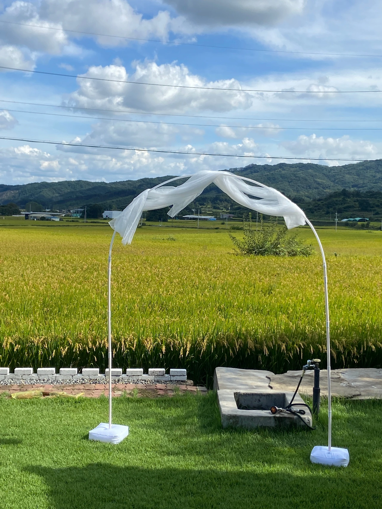 테무에서 주문한 아치를 직접 설치해 보았다. 제일 아래 물을 담아 무게중심을 잡고 봉에 천을 감아 집게로 고정했다.