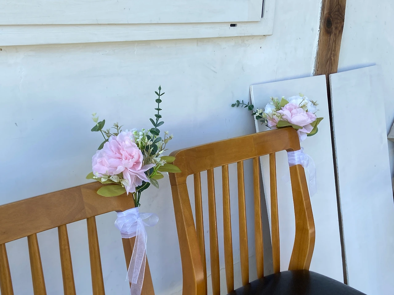 다음으로 혼주석 의자에도 꽃을 달아줬다. 원래 계획은 모든 하객의자에 나풀거리는 하얀 천을 달아 예식의자 분위기를 내는 것이었지만.. 아쉽게도 그건 시간관계상 포기하고 혼주석 의자에만 조화 꽃을 매달아 보았다.