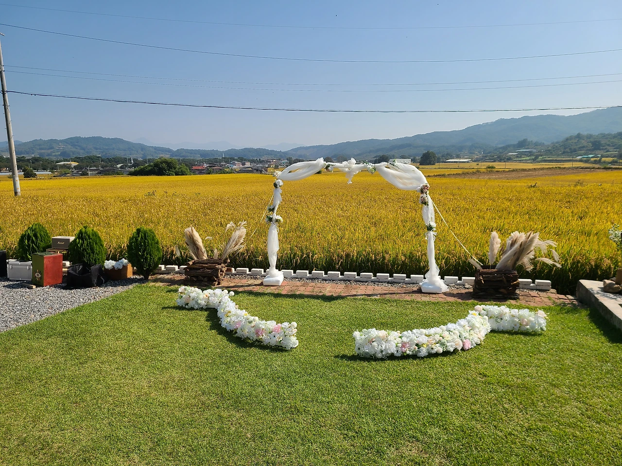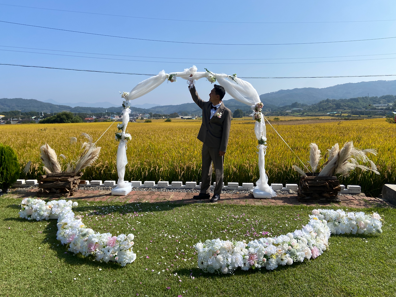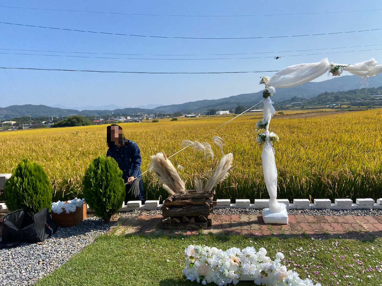예식장의 황금들판 뷰를 담고 싶어, 드론 촬영을 끝까지 고민했다.