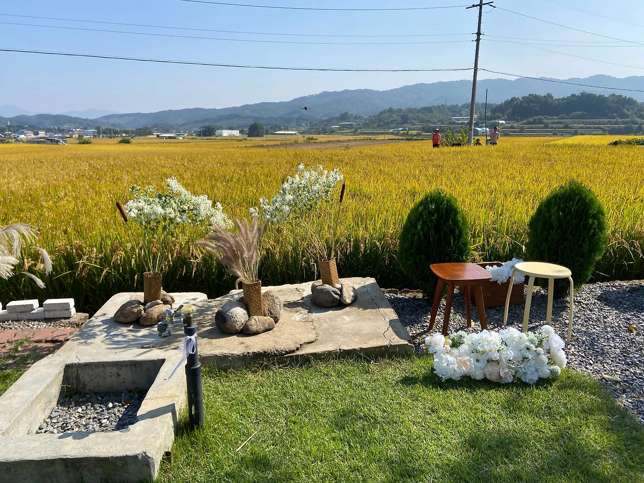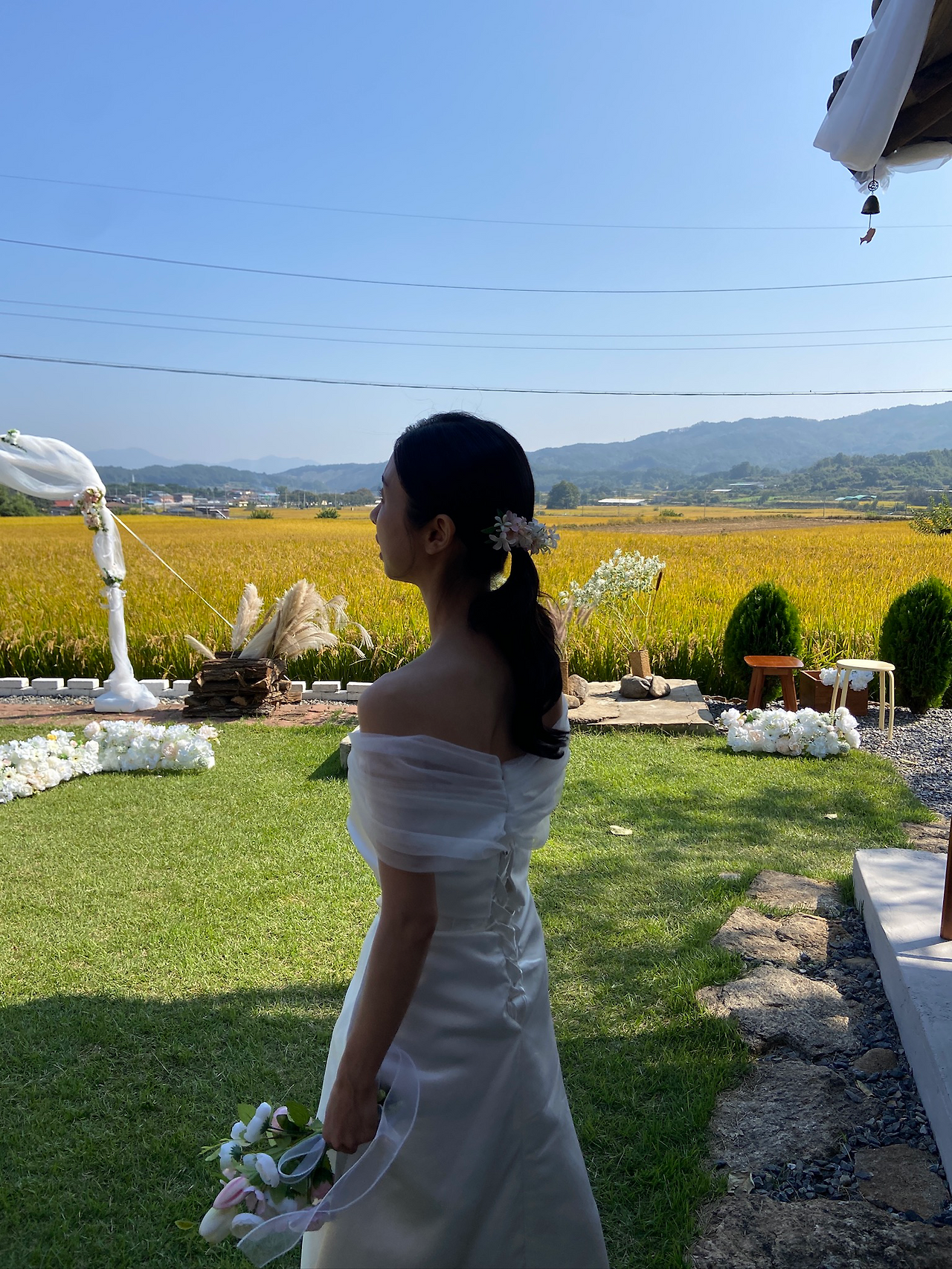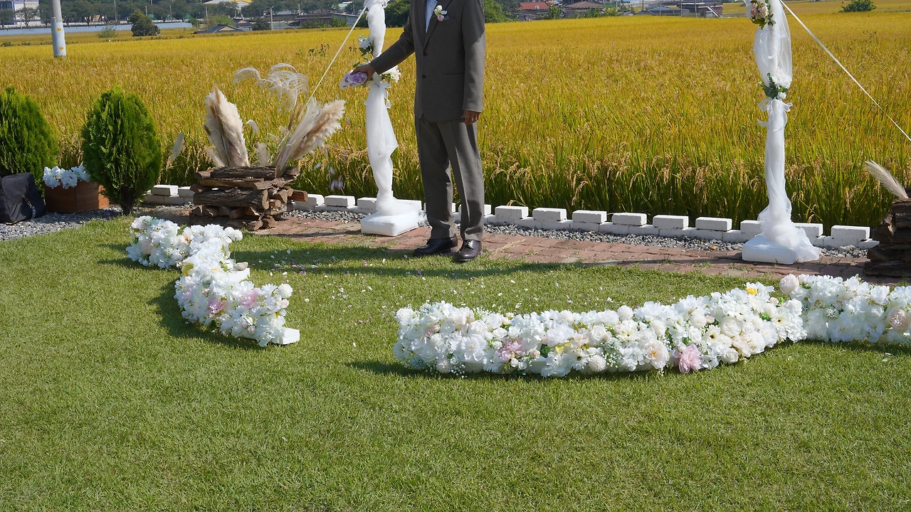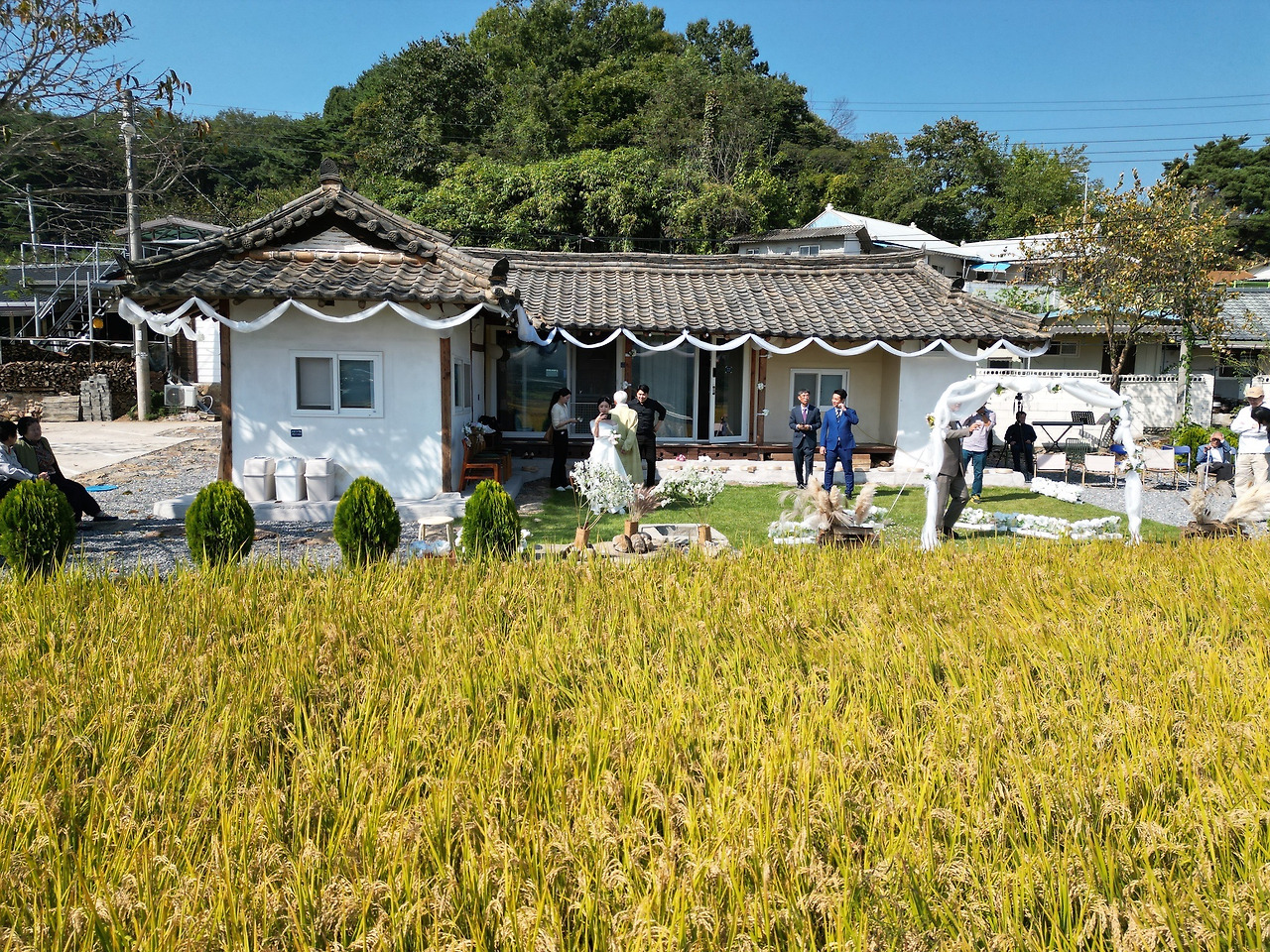 예식장의 황금들판 뷰를 담고 싶어, 드론 촬영을 끝까지 고민했다.