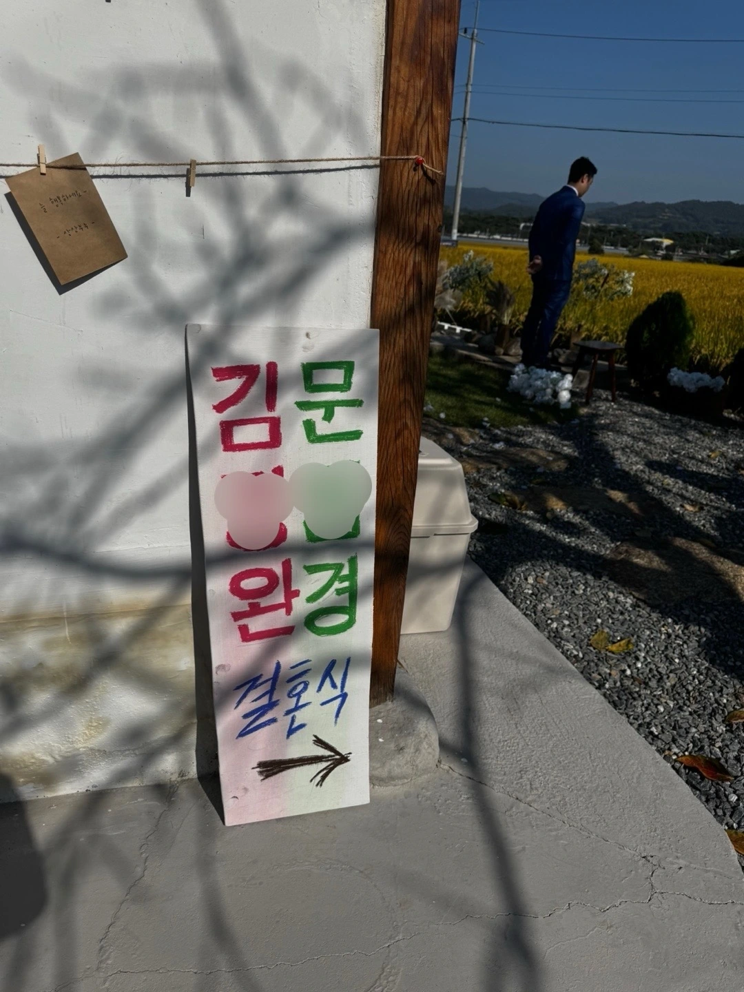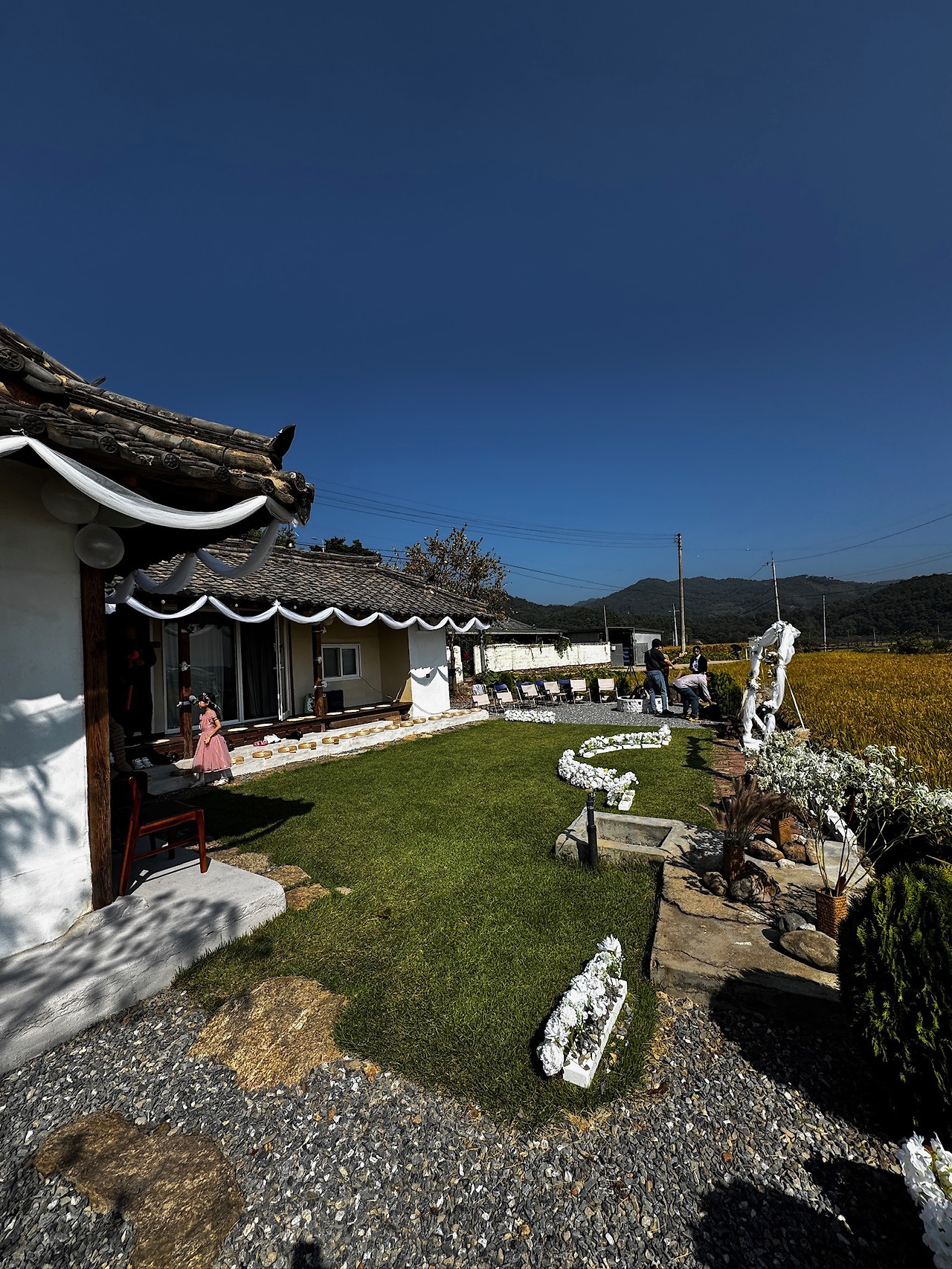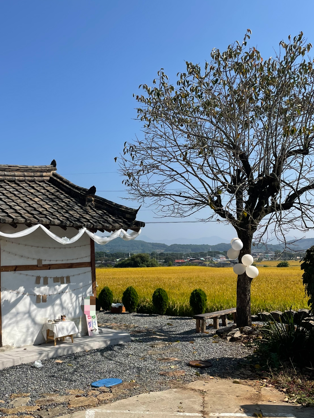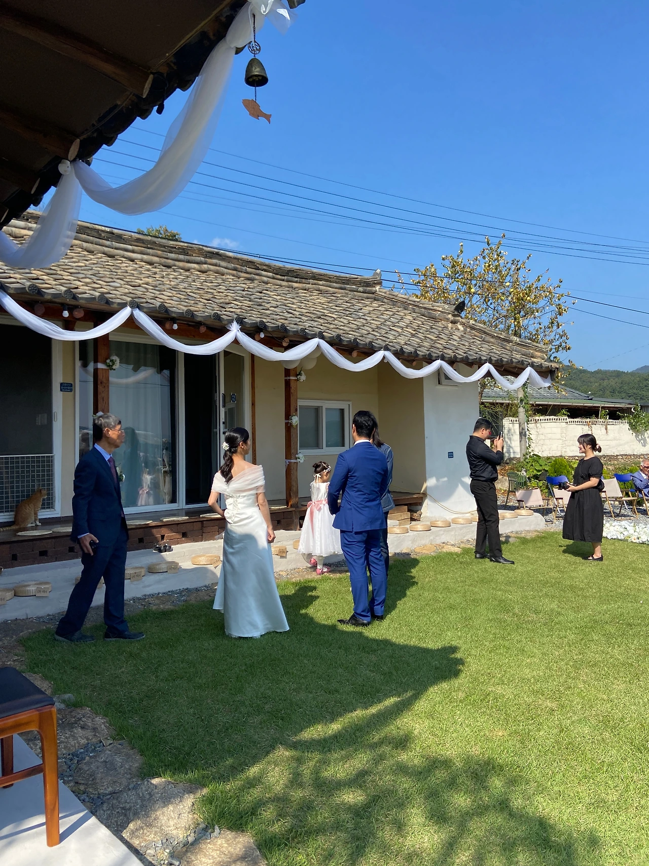 처마에 남은 하얀 천을 감나무에 둘러 장식할 계획이었지만, 당일 아침 준비가 꽤 분주해 결국 실행하지 못했다. 이것까지 했다면 훨씬 더 예식장 분위기가 살아났을 텐데, 하는 아쉬움이 있다.