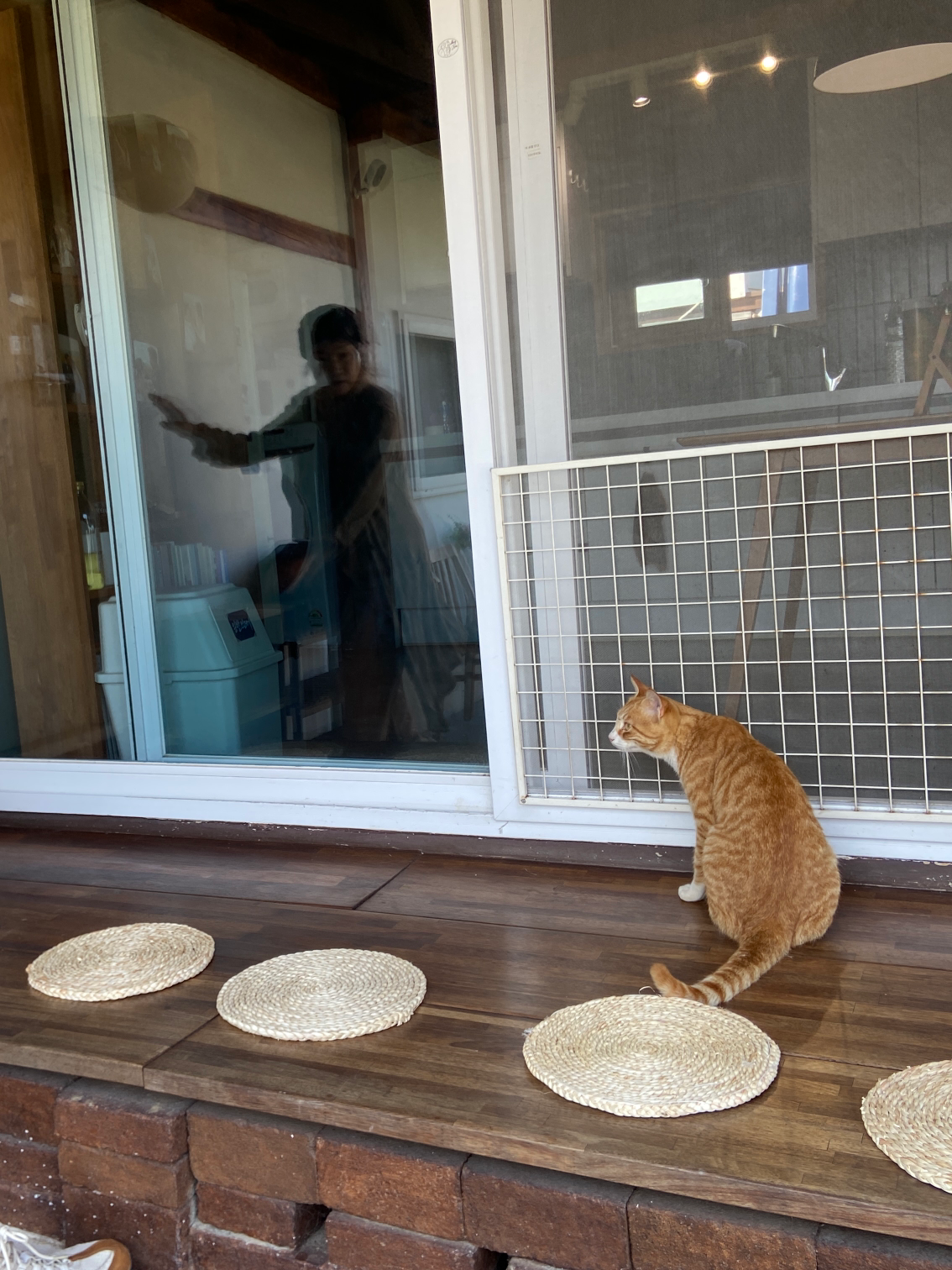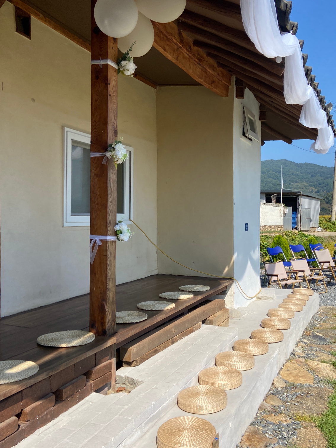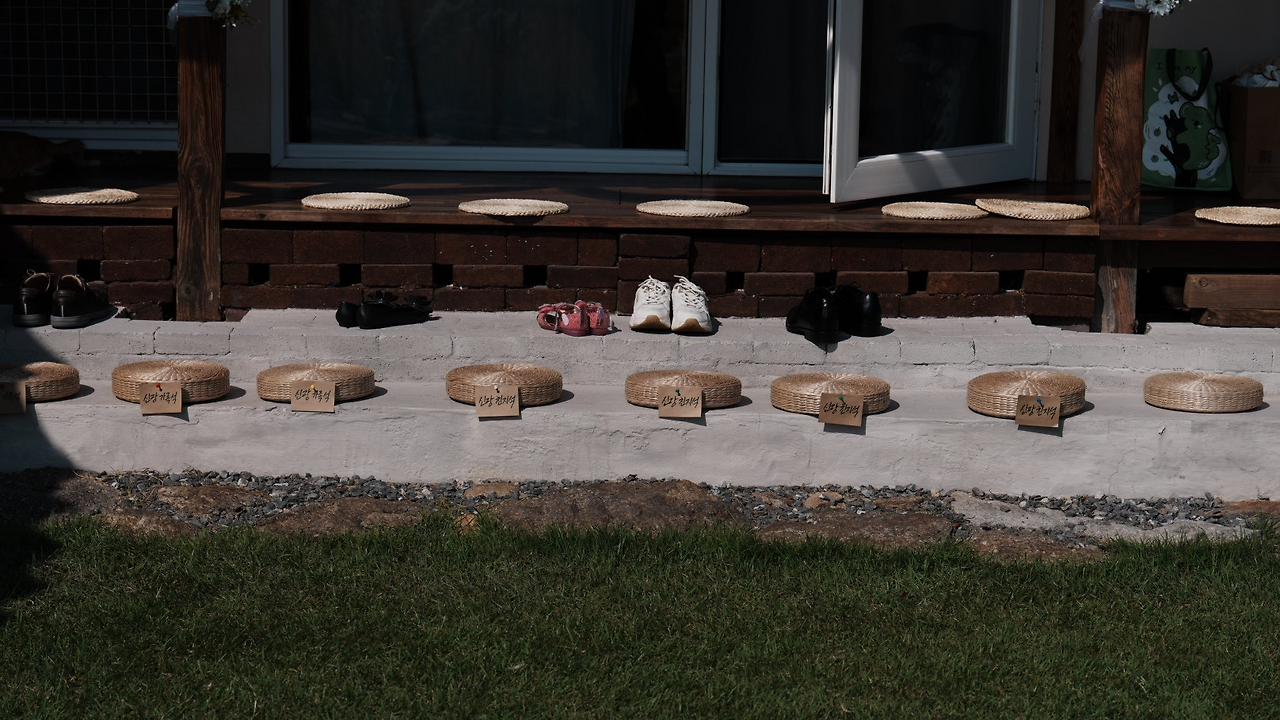 가장 먼저, 툇마루와 봉당 위에 미리 준비해 두었던 라탄 방석을 깔고, 가족석임을 표시하기 위해 좌석표를 배치했다. 하지만 그냥 올려두니 바람의 장난에 날아가버려, 방석 앞쪽에 압정을 박아 단단히 고정시켰다.