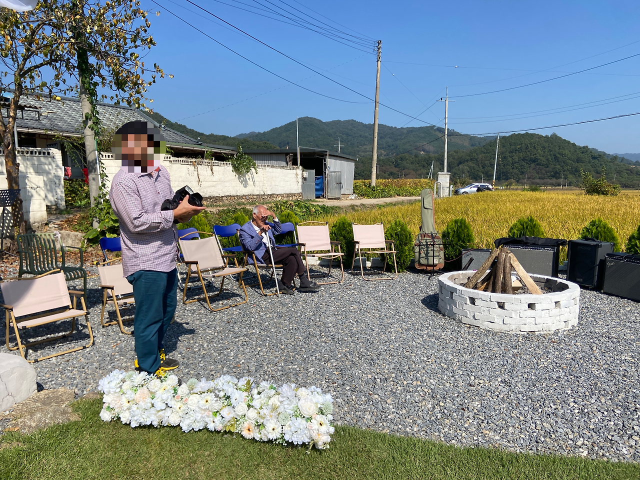 예식에 사용할 스피커와 마이크는 지인분께 빌렸는데, 야외에 설치할 전기가 필요해 방 내부에서 선을 밖으로 연결하는 작업도 추가로 진행했다.