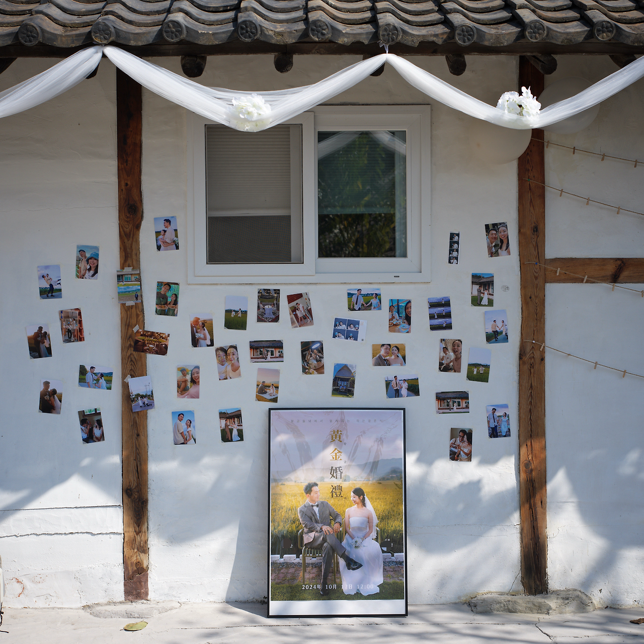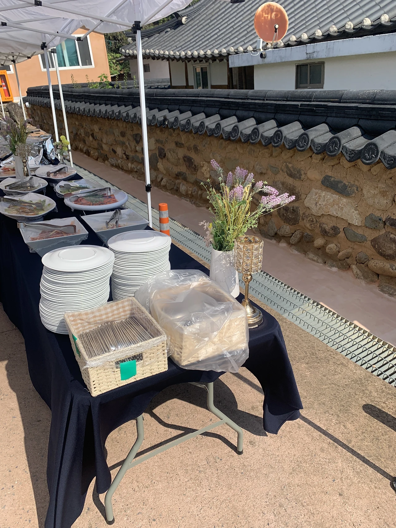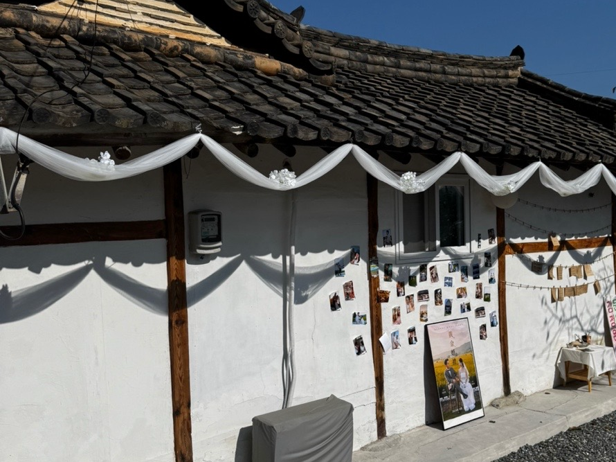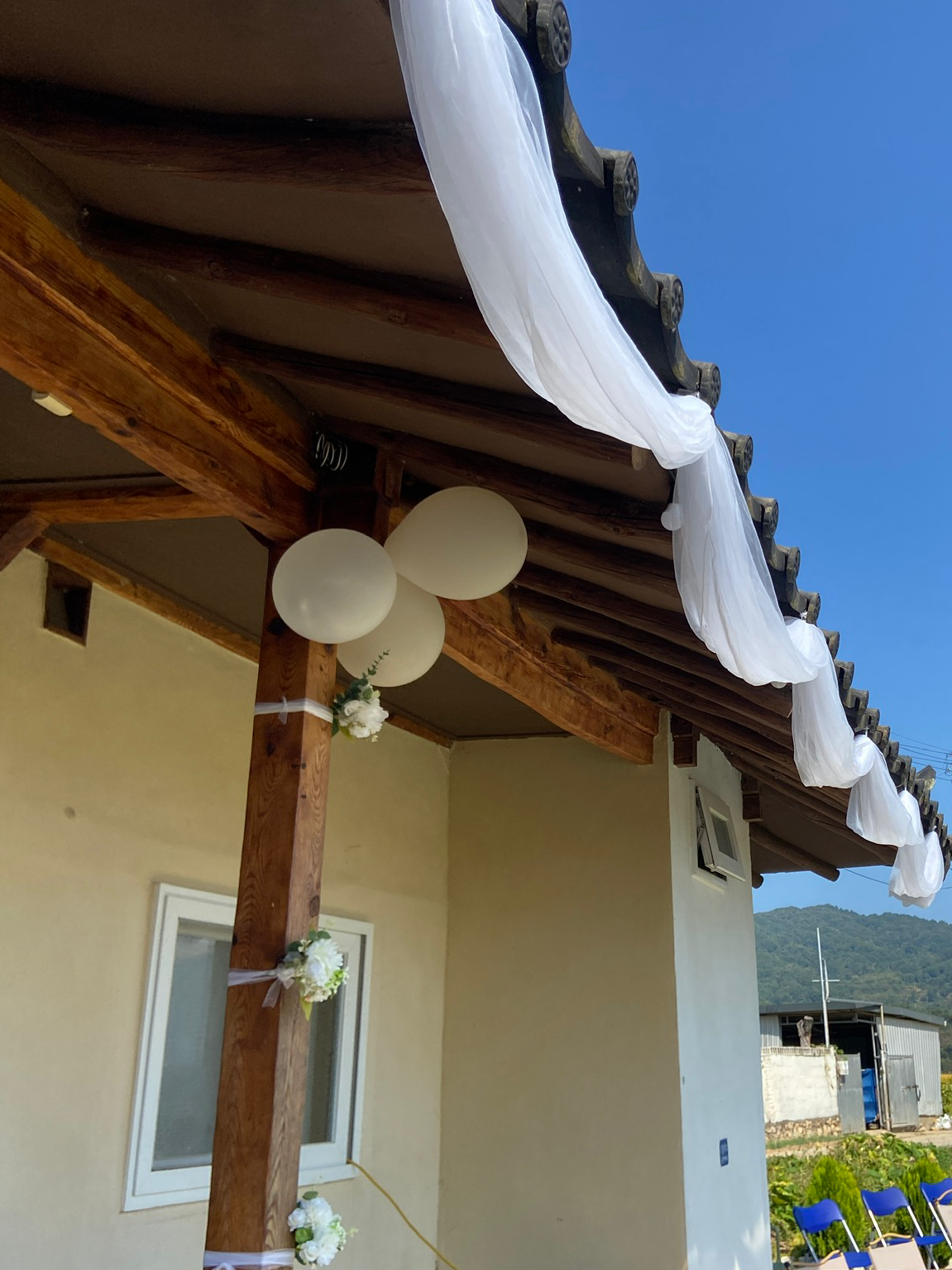 예식장 오는 길 기와 위에 장식해 두었던 수국도 여분으로 남아, 그건 흰 천이 드리워진 처마에 장식으로 더했다.