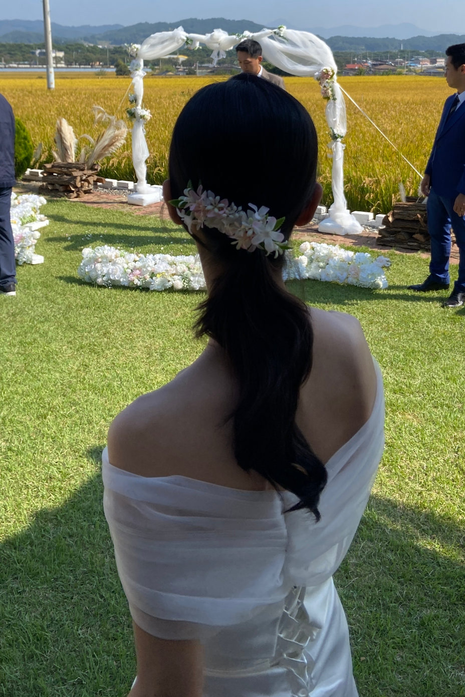1부는 어르신들이 함께하는 예식인 만큼 탑 드레스 위에 볼레로를 걸쳐 단정한 인상을 더했고, 머리는 롱 포니테일에 조화 헤어꽃핀을 살짝 꽂았다. 원래는 베일도 착용할 계획이었지만, 식사를 마치고 돌아오는 길에 깜빡하고 말았다. 귀걸이도 마찬가지로 말이다.