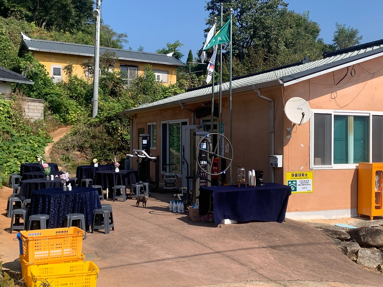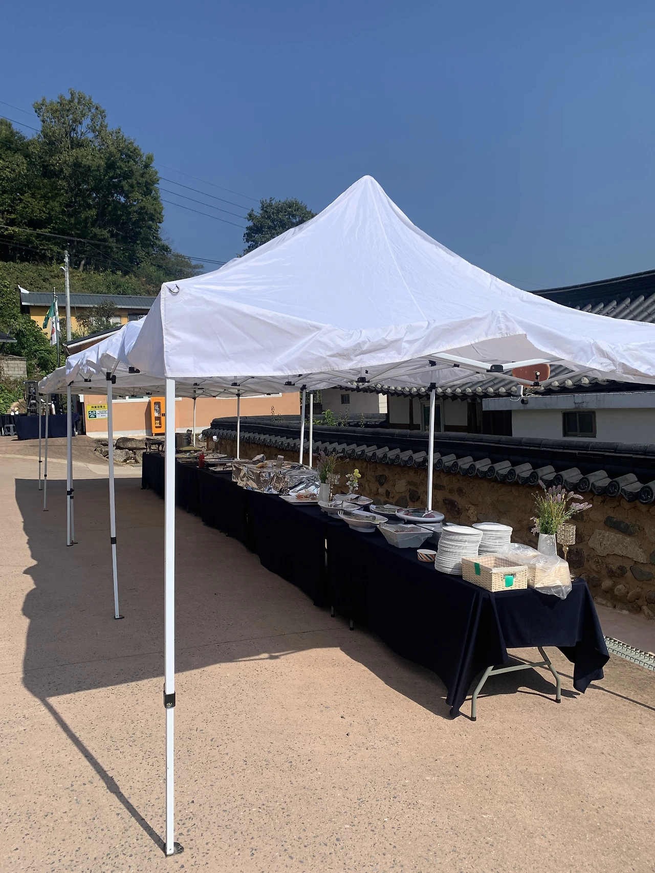 그들은 배우자와 함께 마을회관 바깥에 뷔페 테이블을 세팅하고 그 옆에는 손님들이 식사하실 수 있도록 야외 테이블과 의자들을 배치했다.