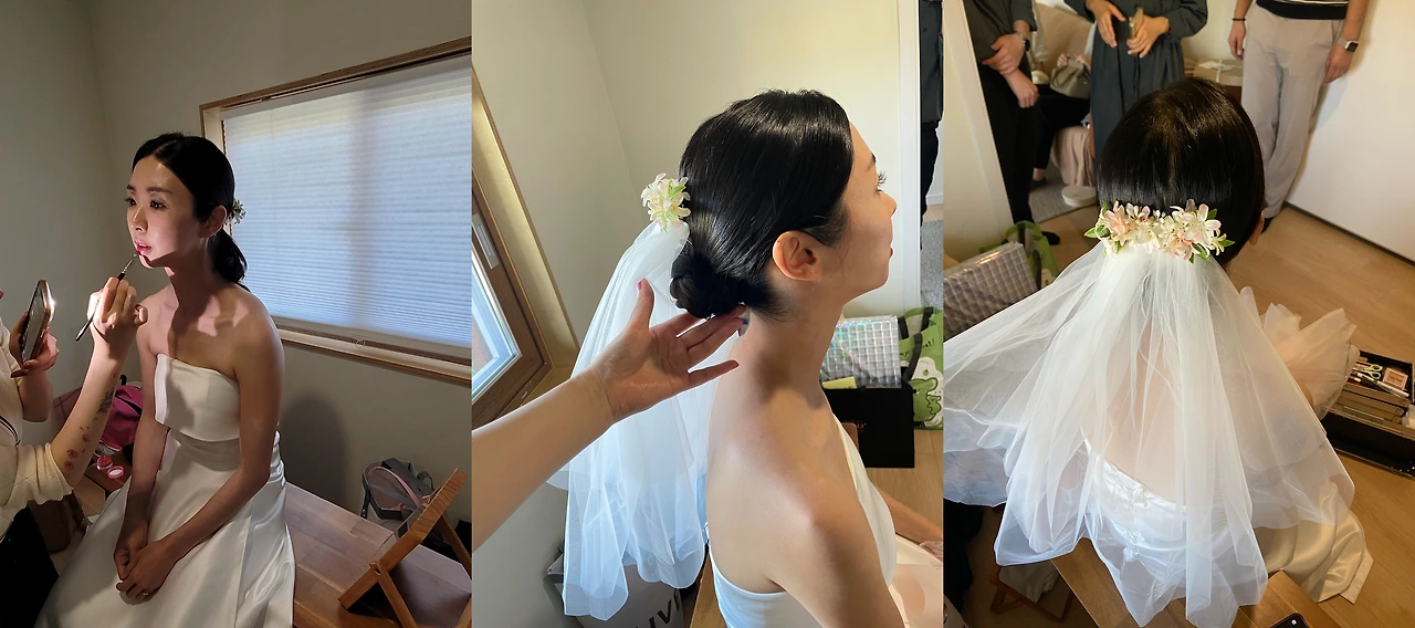 당일 알게 된 사실이지만 야외 결혼식의 경우 정식 헤어메이크업을 받기에 적합한 공간이 없는 경우가 많다는 게 메이크업하시는 분들께 큰 어려움이라고 했다.