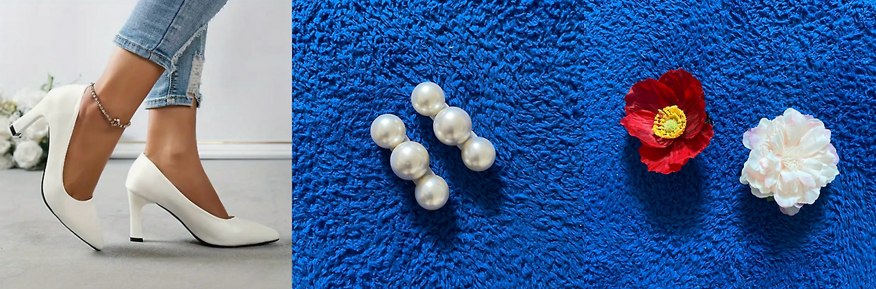 결국 셀프웨딩 촬영을 위해 샀던 심플한 흰 원피스를 그대로 입고, 대신 빨간 꽃핀 하나를 머리에 꽂기로 했다. 구두는 테무에서 검색한 기본 디자인의 흰 구두를 구입, 구두 장식도 추가로 구입해서 웨딩의 느낌을 더했다.