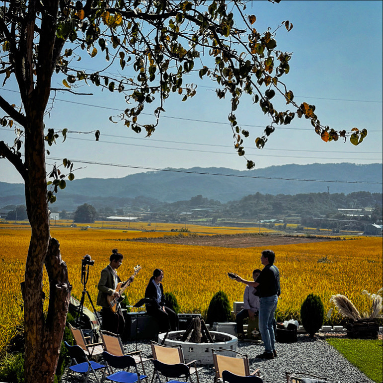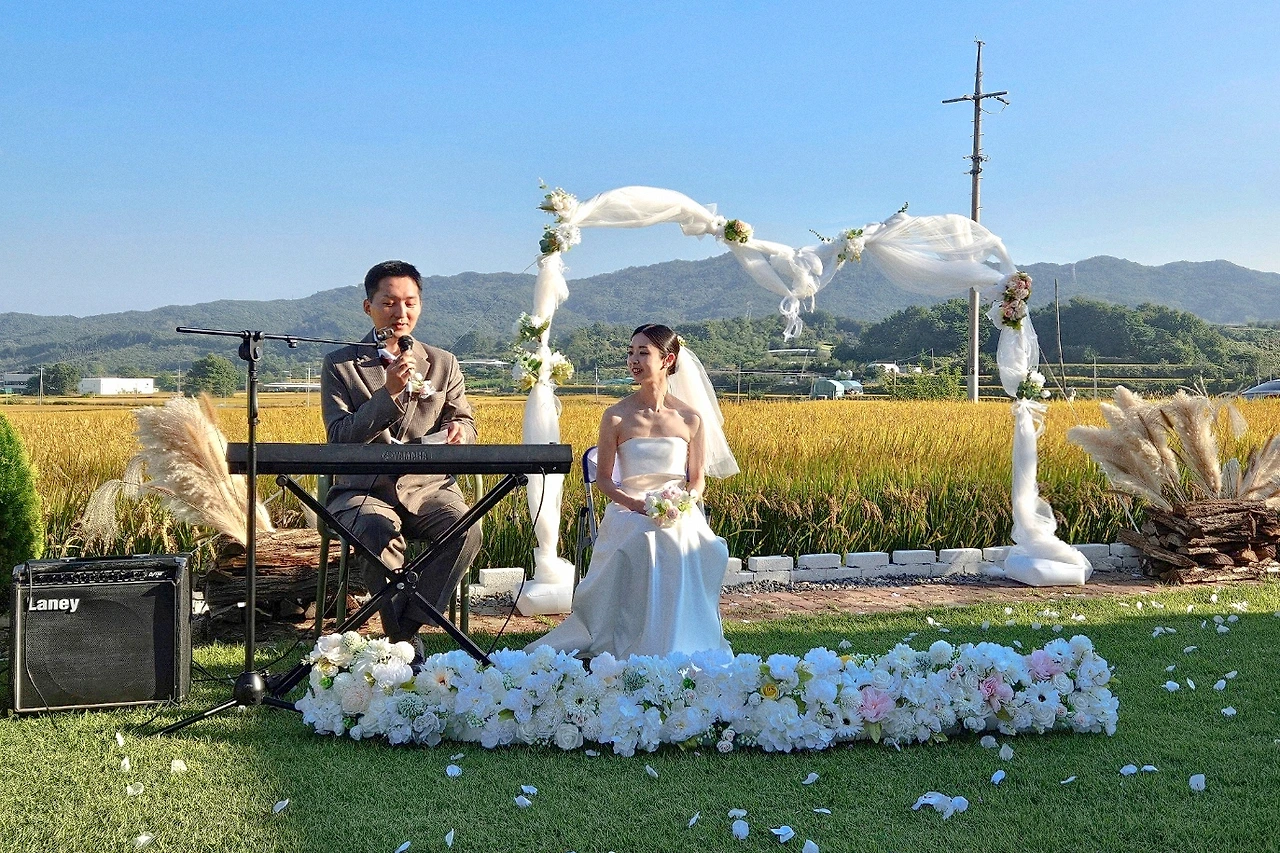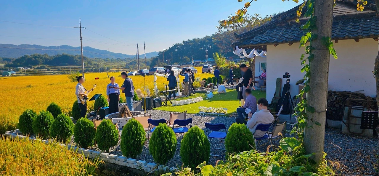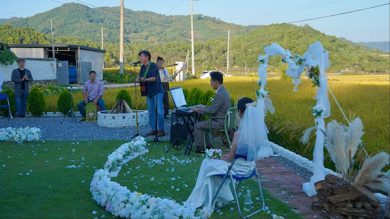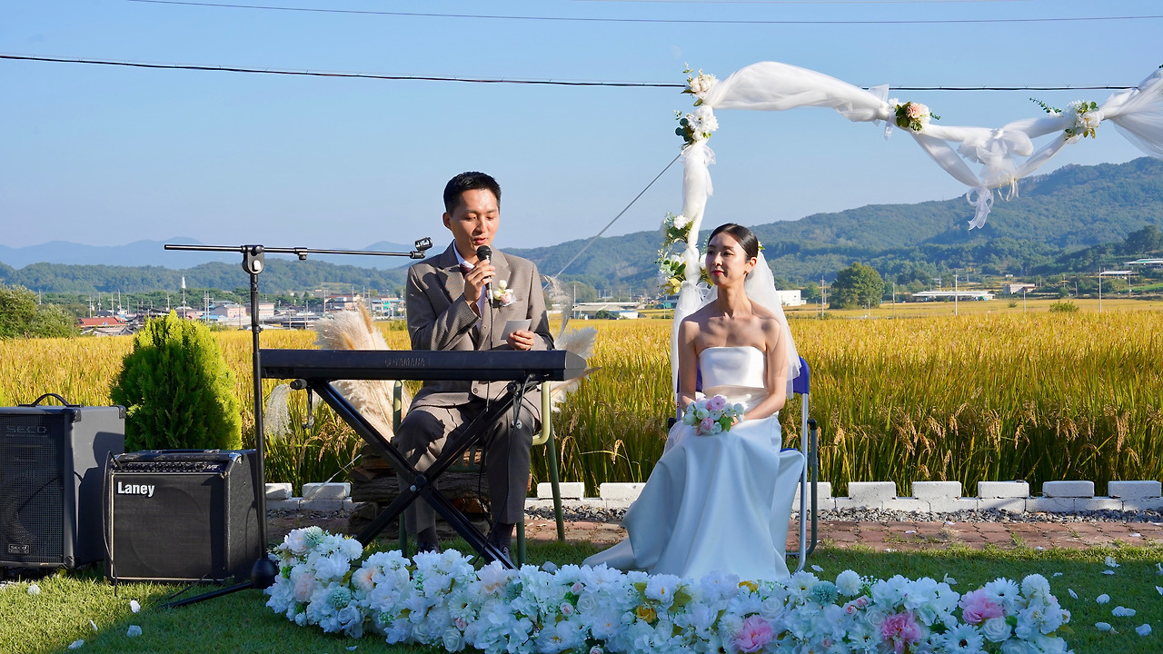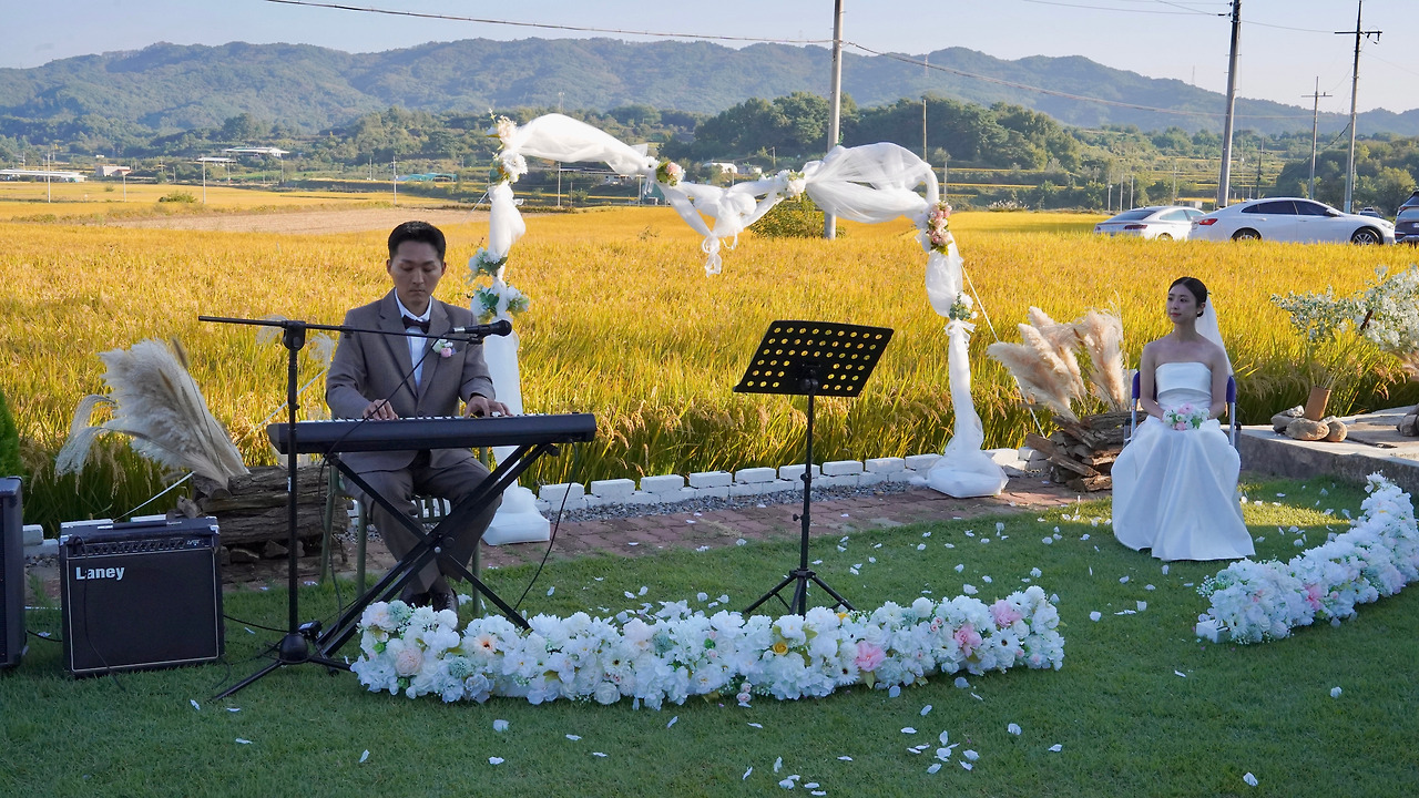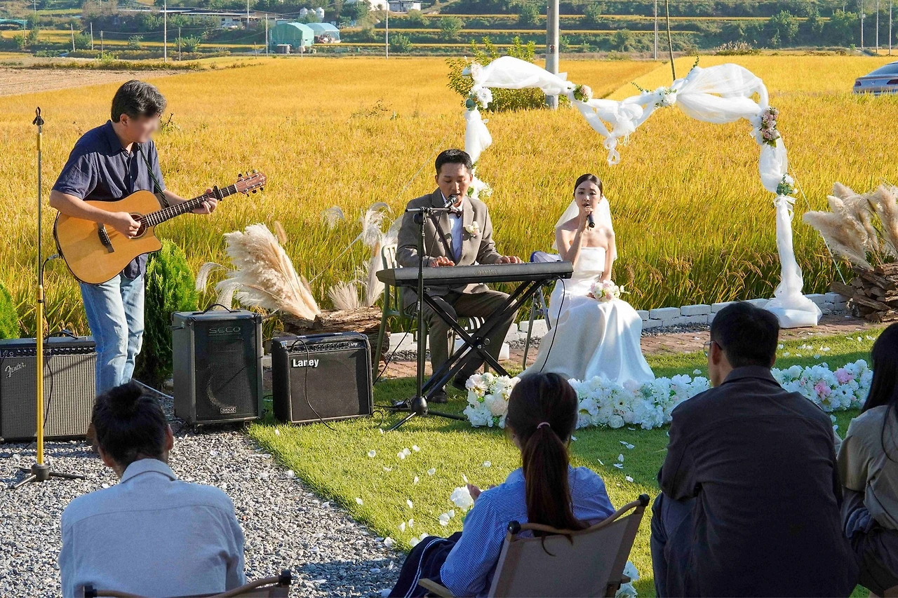 그사이 자갈마당 한편에서는 축가를 맡은 밴드팀이 리허설 중이었다. 황금들판을 배경으로 한 그들의 모습은 마치 영화 포스터의 한 장면처럼 인상 깊었다. 그 순간만큼은 스쳐 지나가는 바람결마저 음악이 된 듯했다.