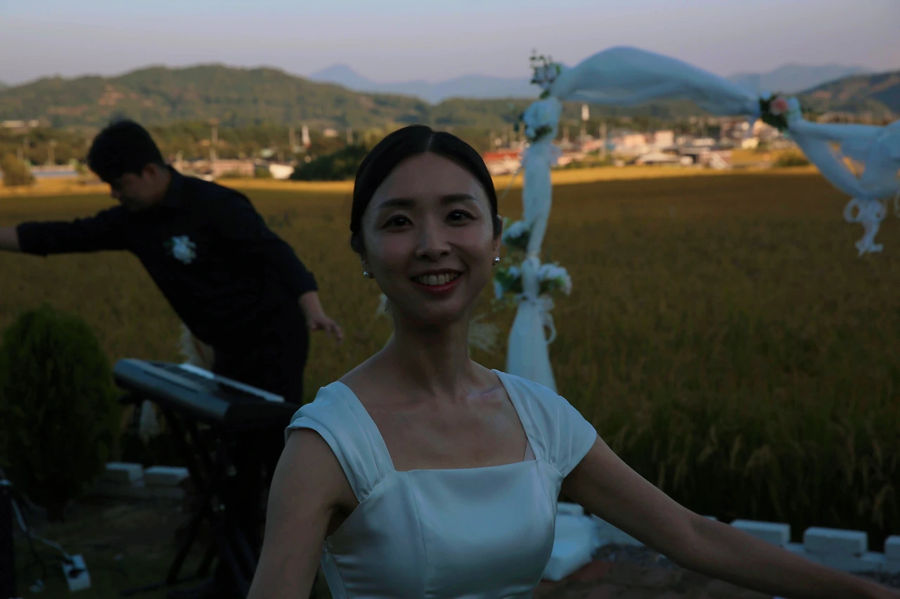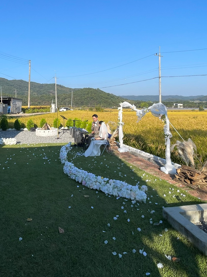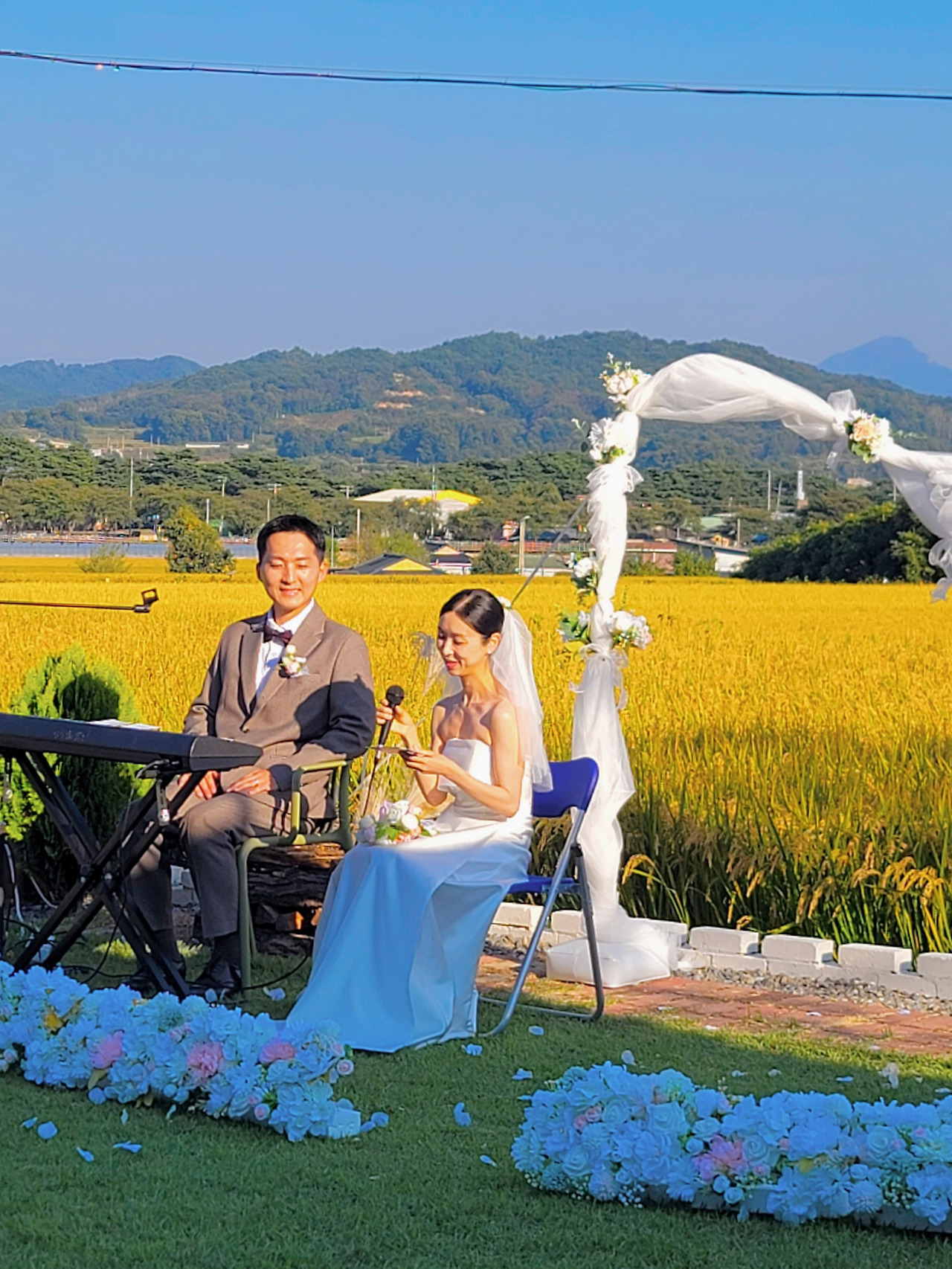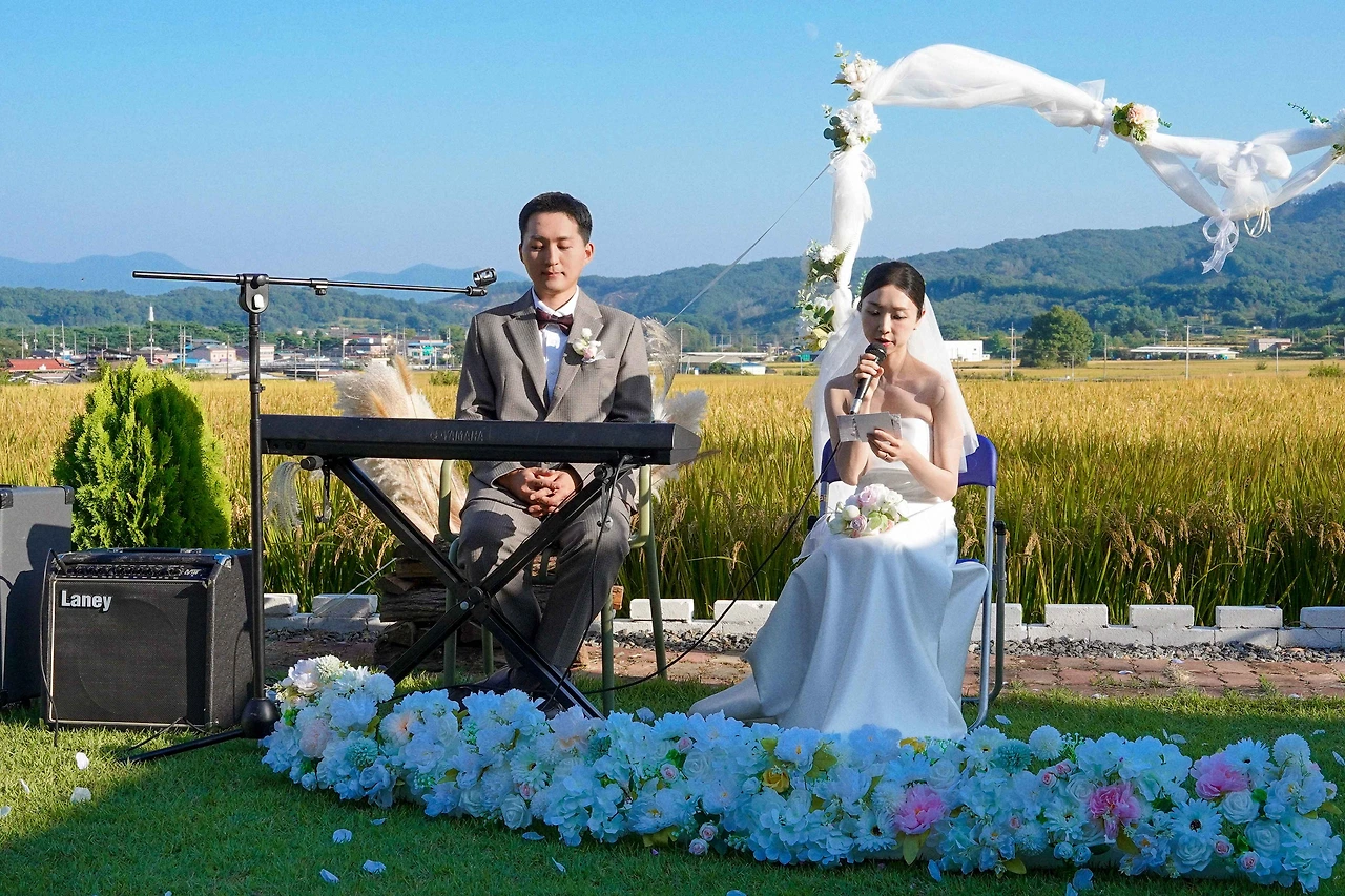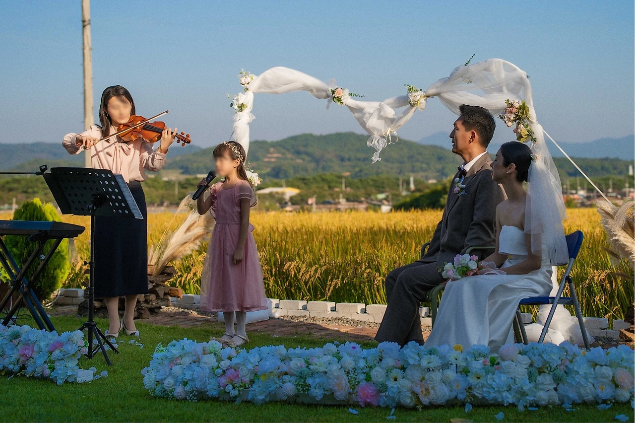 그사이 자갈마당 한편에서는 축가를 맡은 밴드팀이 리허설 중이었다. 황금들판을 배경으로 한 그들의 모습은 마치 영화 포스터의 한 장면처럼 인상 깊었다. 그 순간만큼은 스쳐 지나가는 바람결마저 음악이 된 듯했다.