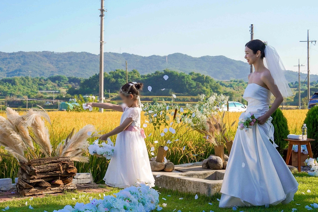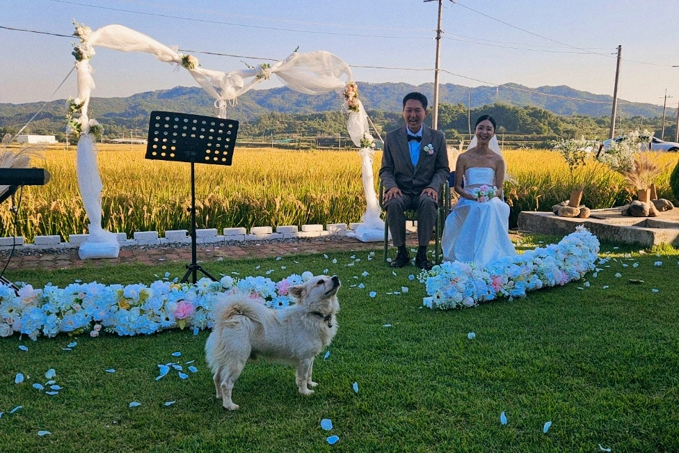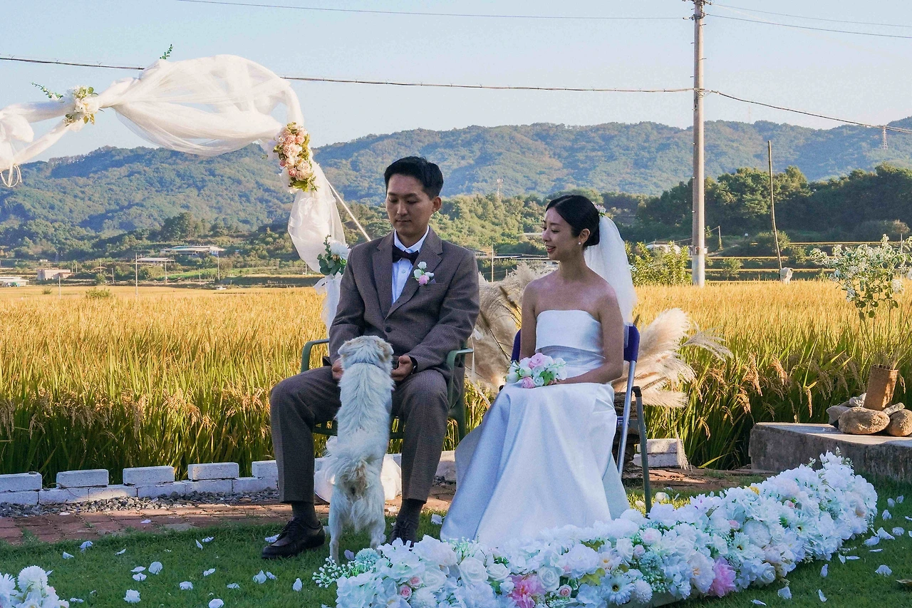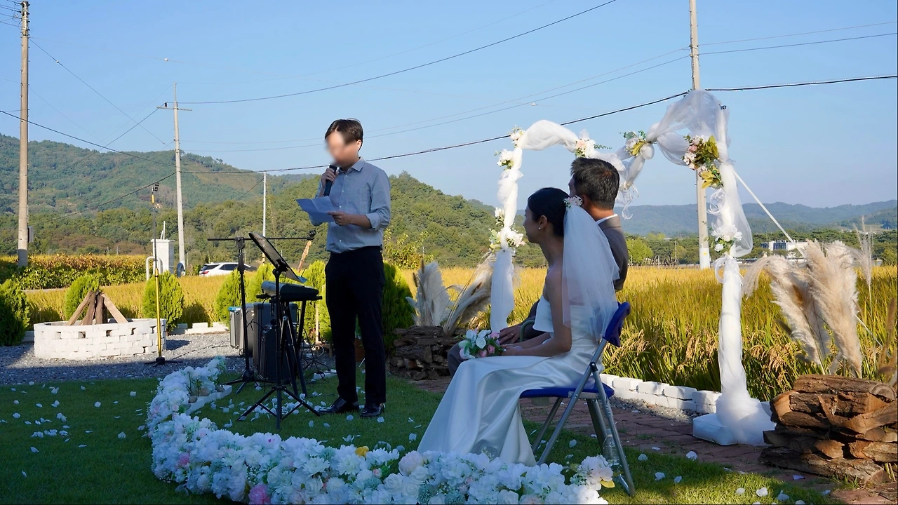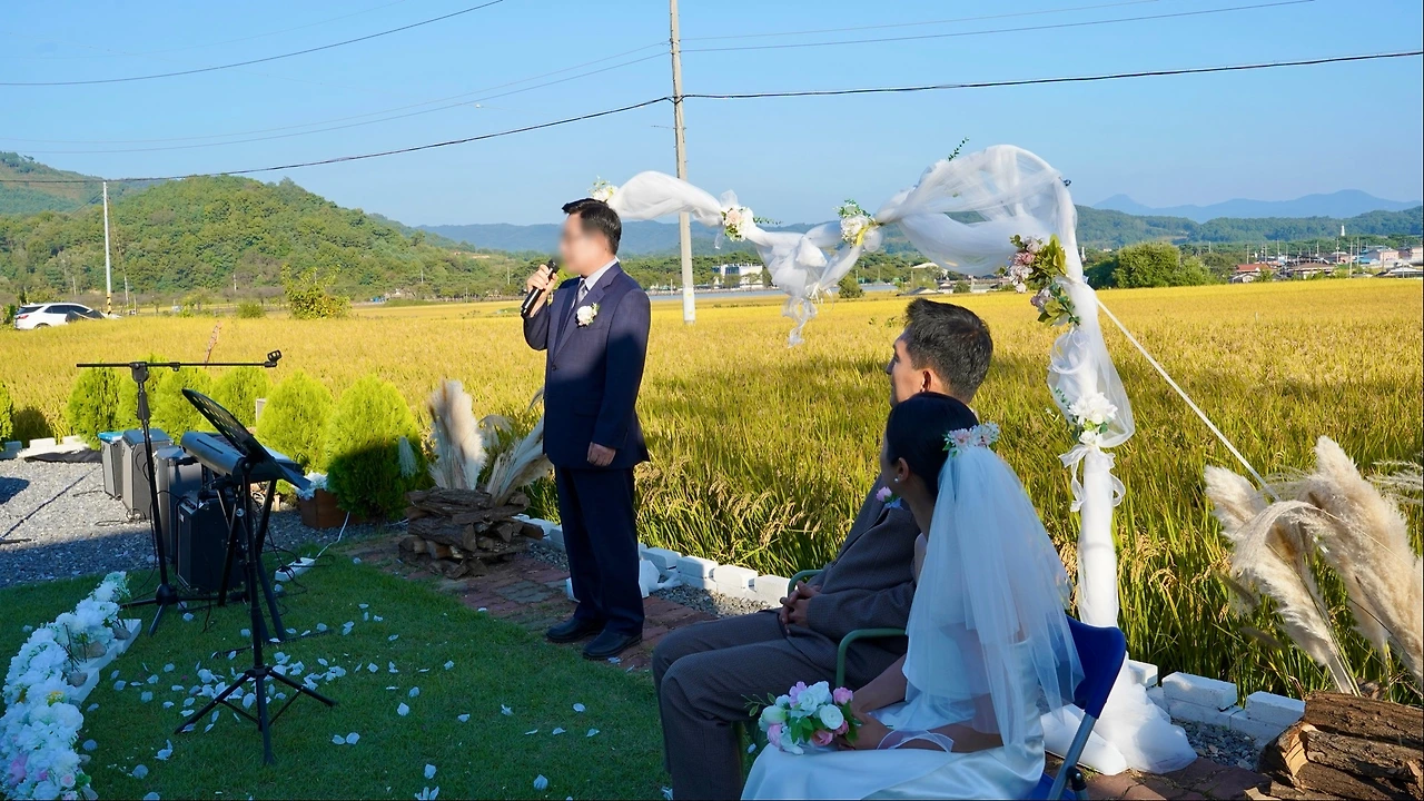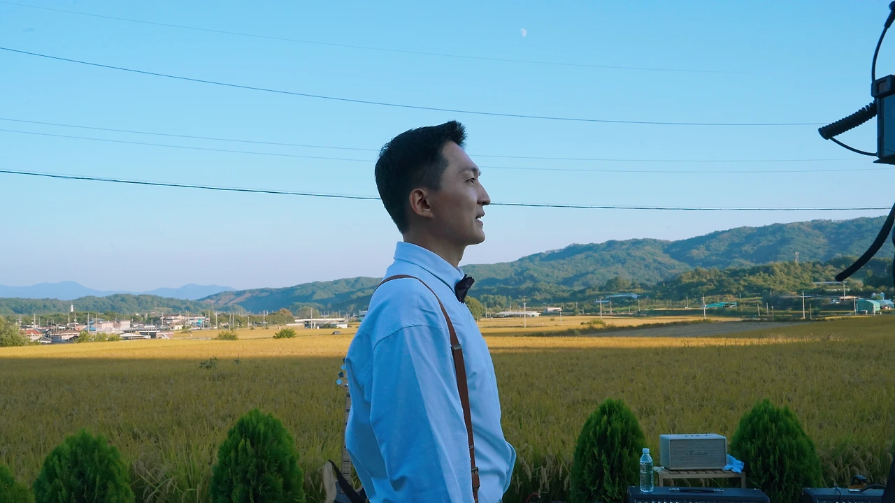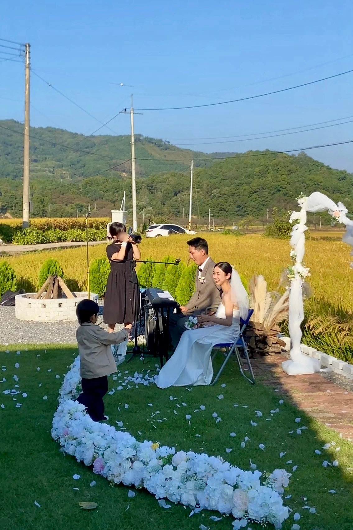 그사이 자갈마당 한편에서는 축가를 맡은 밴드팀이 리허설 중이었다. 황금들판을 배경으로 한 그들의 모습은 마치 영화 포스터의 한 장면처럼 인상 깊었다. 그 순간만큼은 스쳐 지나가는 바람결마저 음악이 된 듯했다.