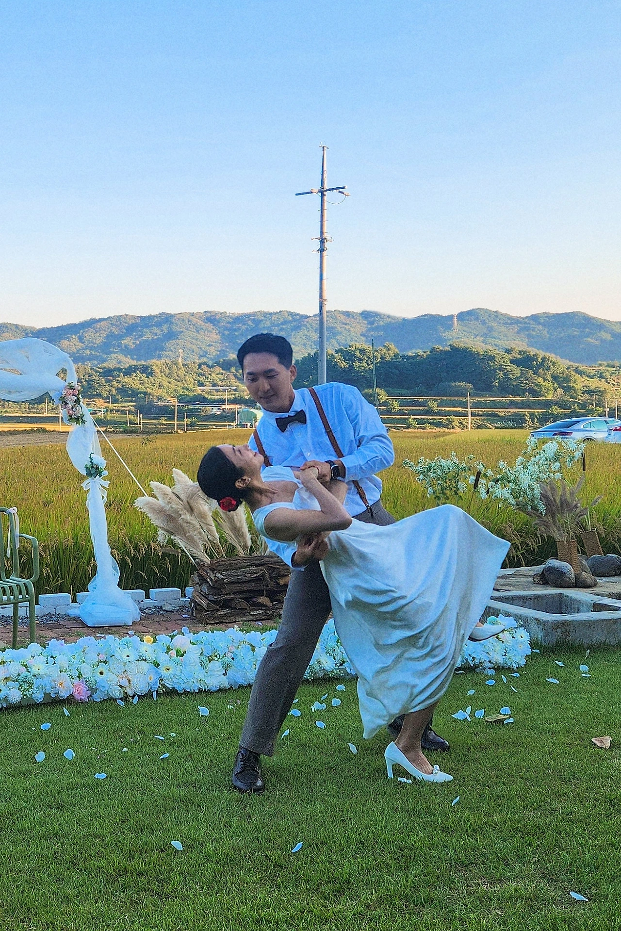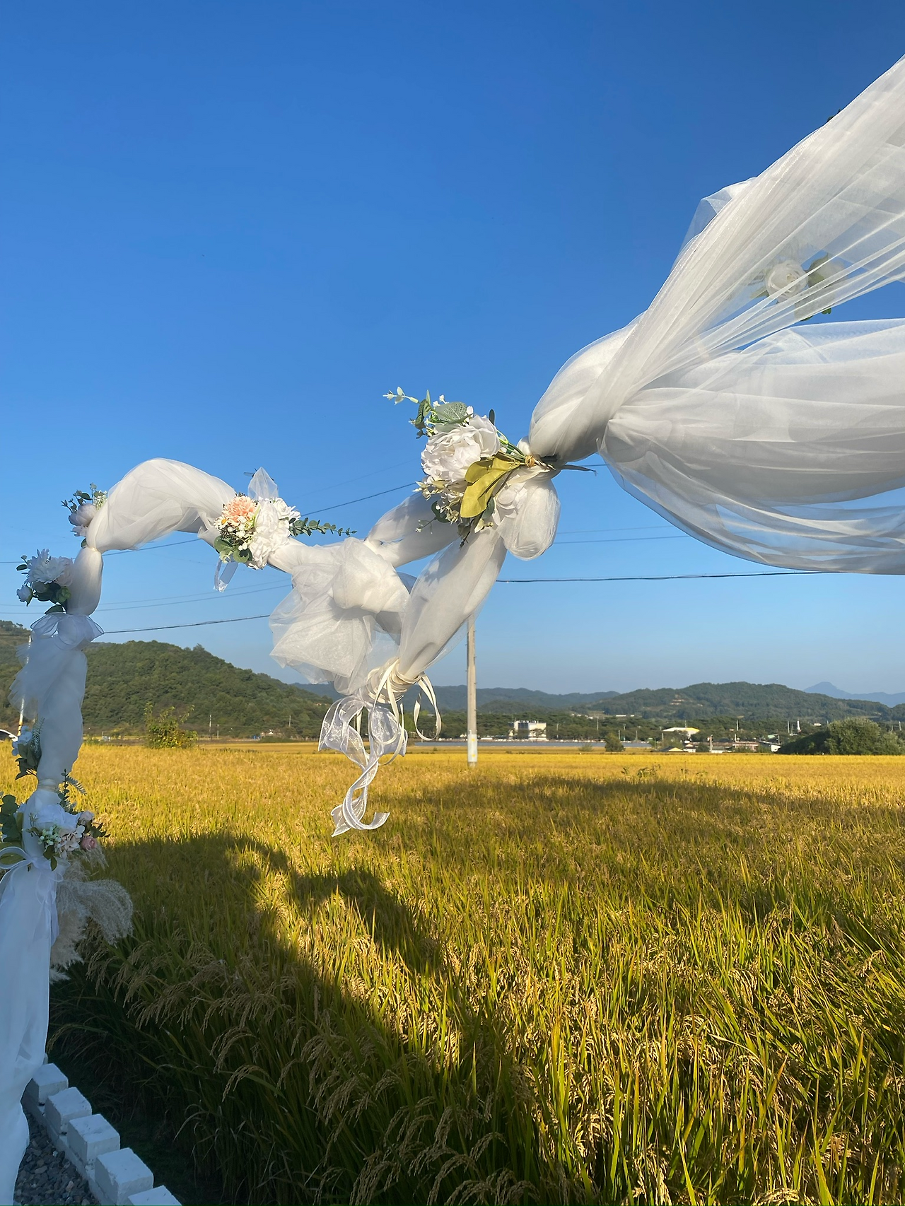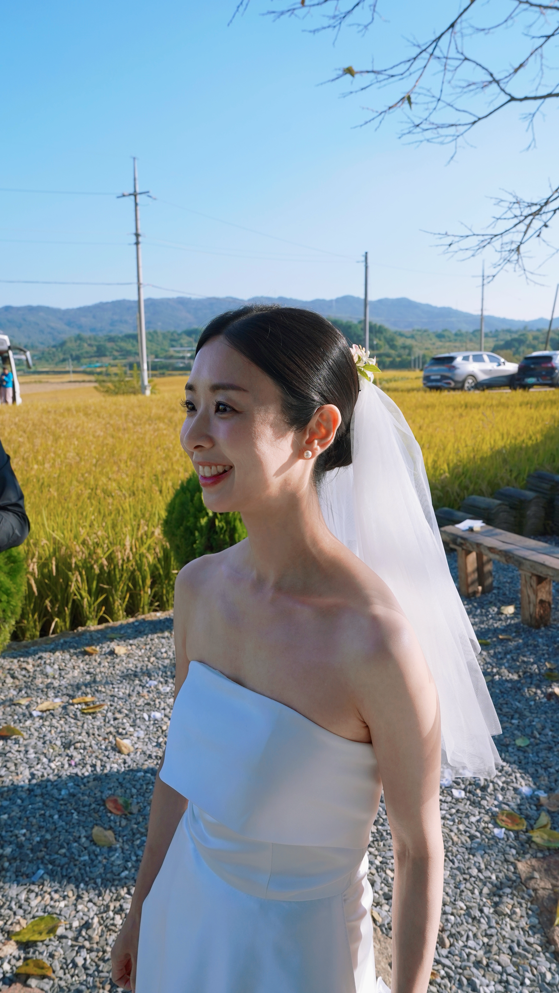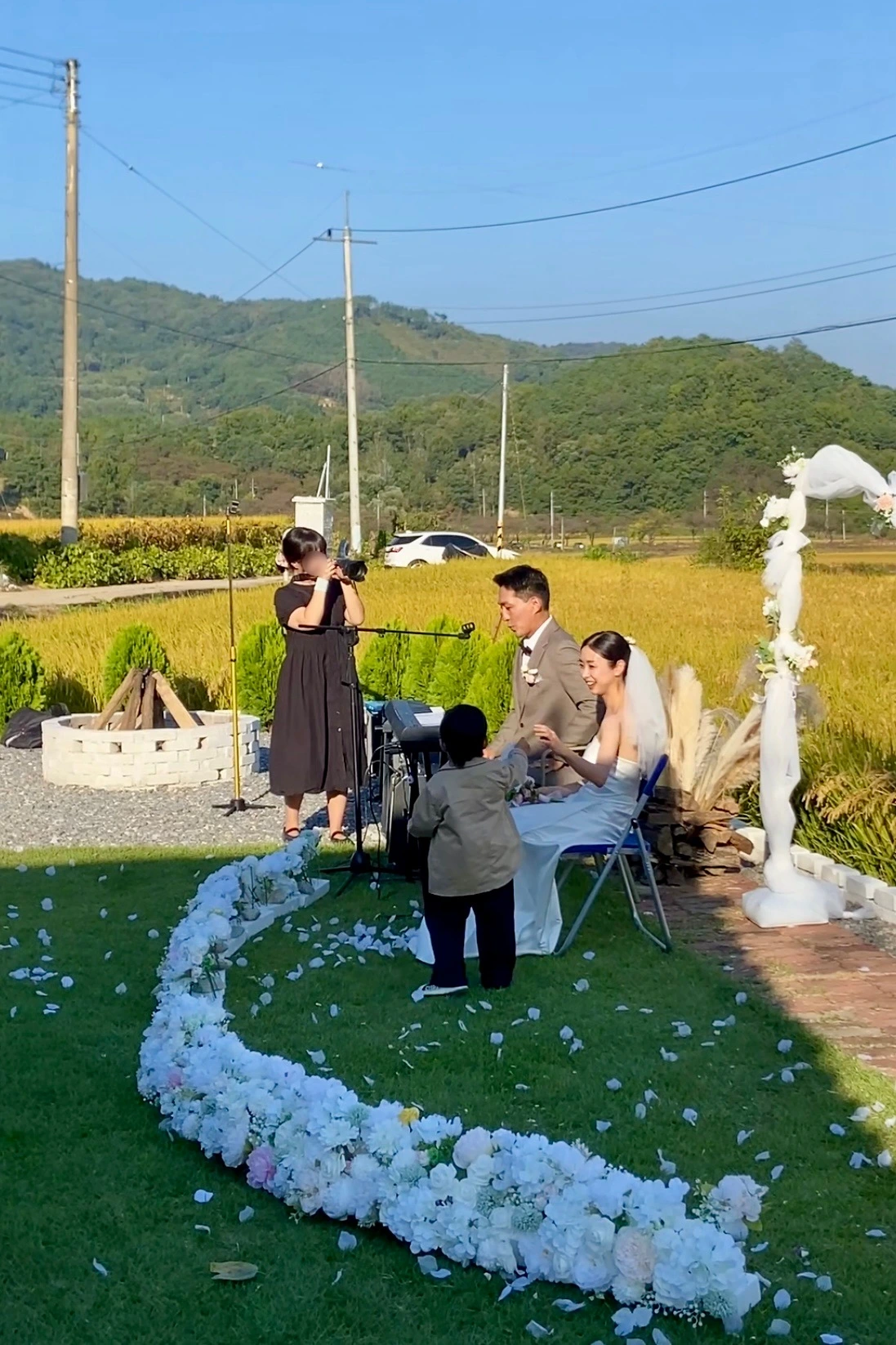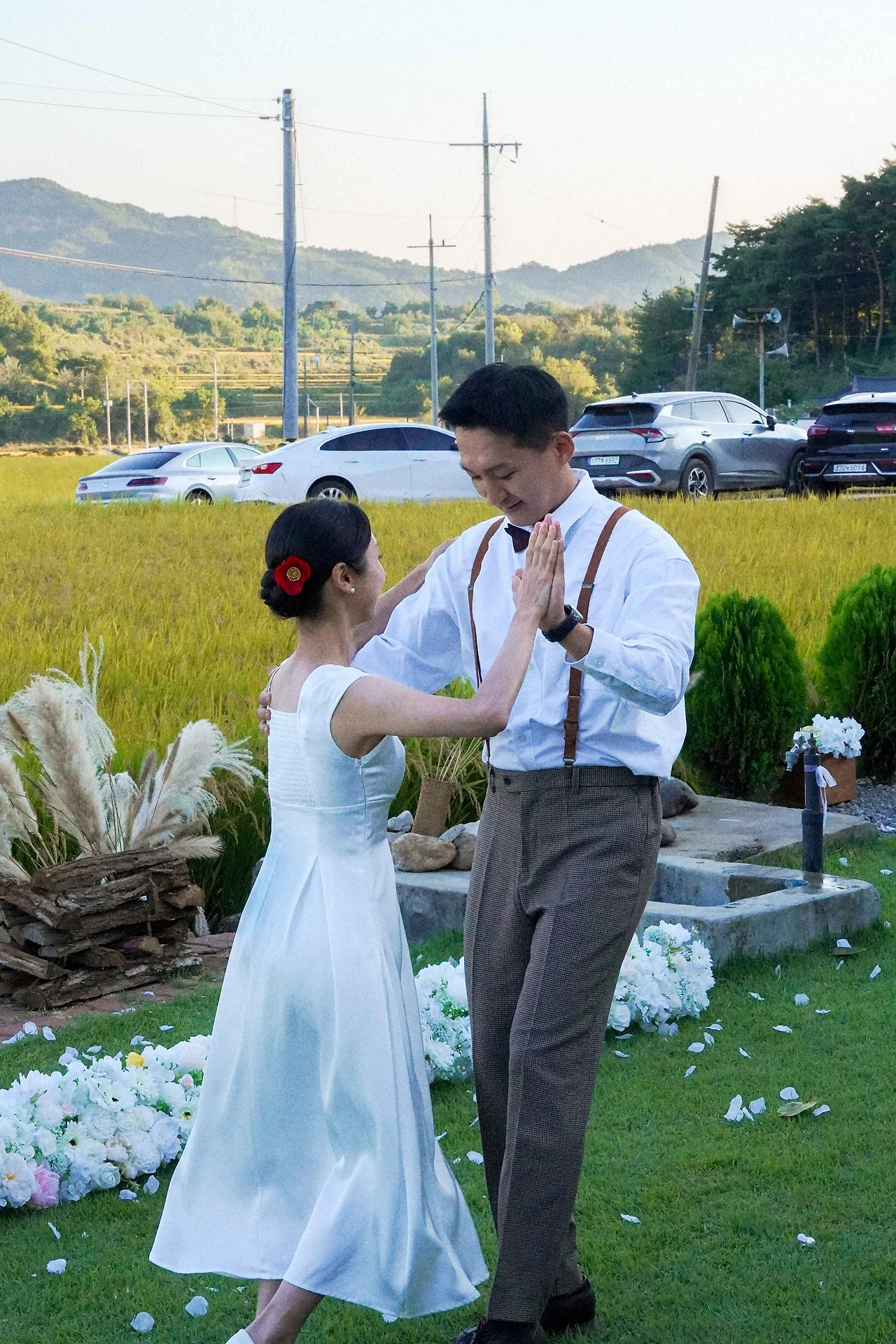 그사이 자갈마당 한편에서는 축가를 맡은 밴드팀이 리허설 중이었다. 황금들판을 배경으로 한 그들의 모습은 마치 영화 포스터의 한 장면처럼 인상 깊었다. 그 순간만큼은 스쳐 지나가는 바람결마저 음악이 된 듯했다.