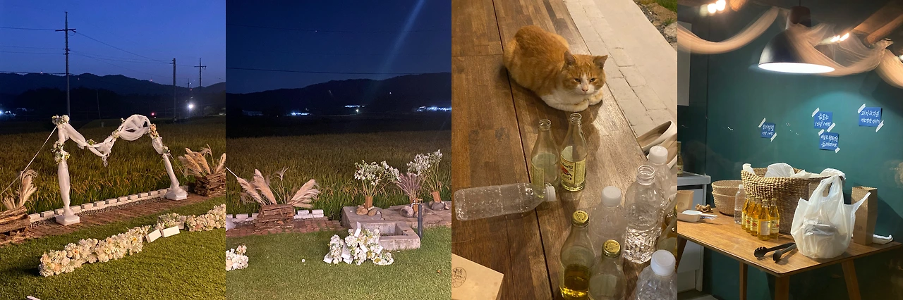 모두가 각자의 집으로 돌아가고 난 뒤 사람들로 북적이던 예식장은 어느새 조용한 잔해만이 남아 있었다. 그 풍경을 마주하자 뿌듯하면서도 오묘한 감정이 밀려왔다. 연극이 끝난 뒤 이런 기분일까? 분명 끝이 났지만 우리 둘의 마음속에선 여전히 그 시간이 이어지고 있는 듯했다.
