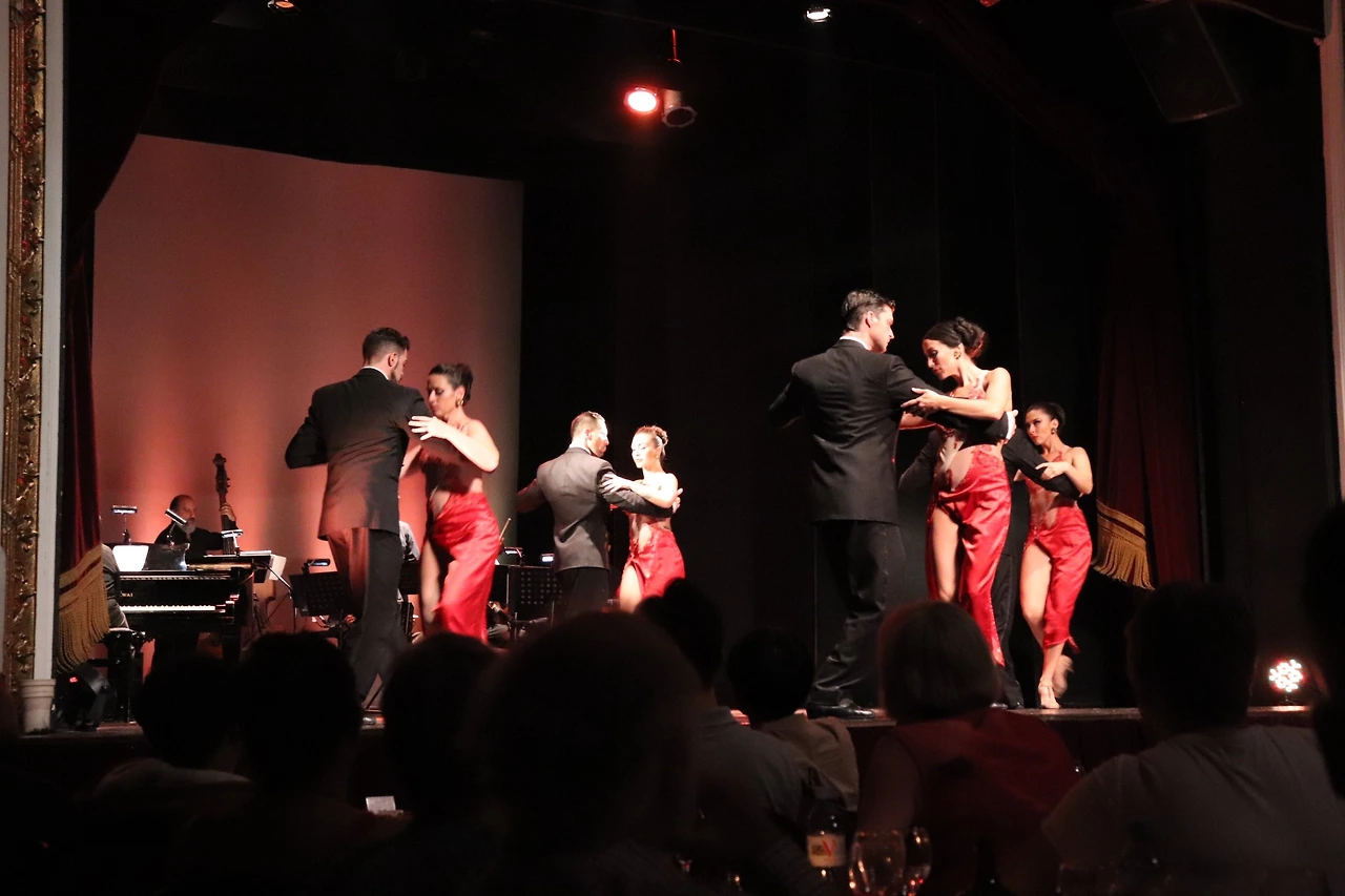 2층으로 되어 있는 무대의 위층 한 켠에서는 리드미컬한 탱고 음악 연주가 시작되고 아래층 무대에는 붉은빛의 조명과 함께 또다시 말끔히 차려입은 남성댄서들과 그들을 따라 반짝거리는 블랙 탑 드레스를 입은 여성댄서들이 한 명씩 나와 각자의 파트너와 함께 스텝을 시작한다.