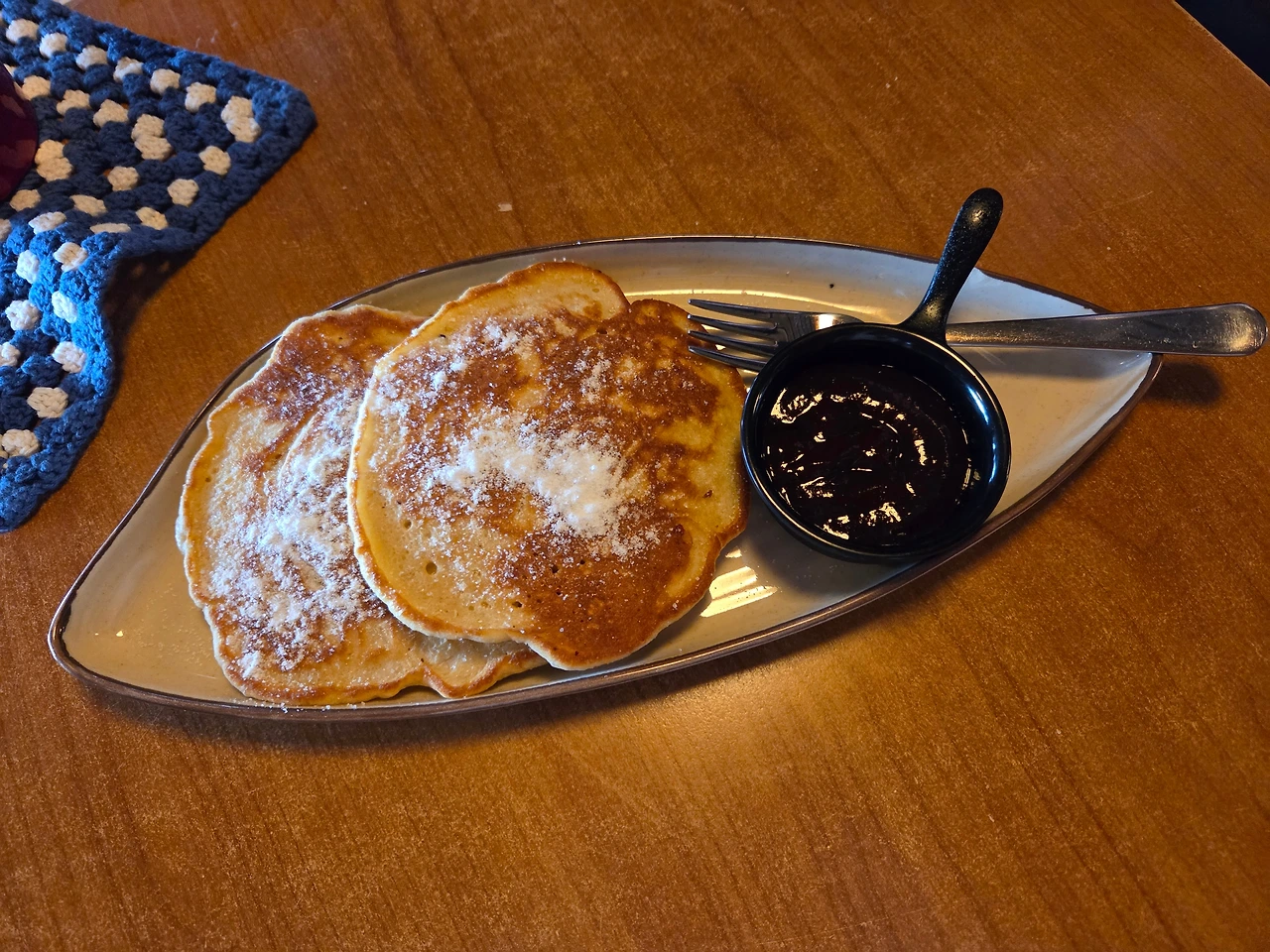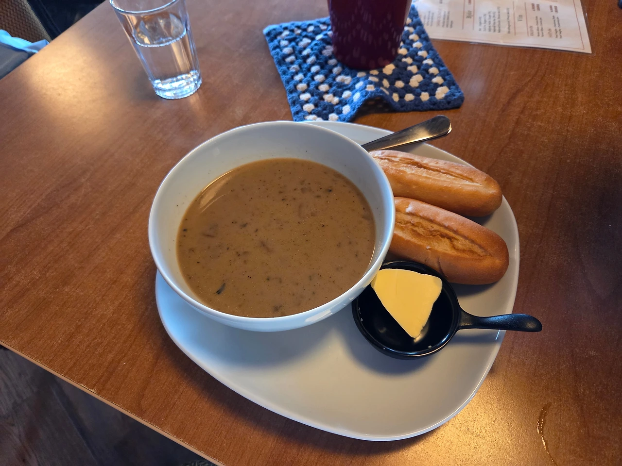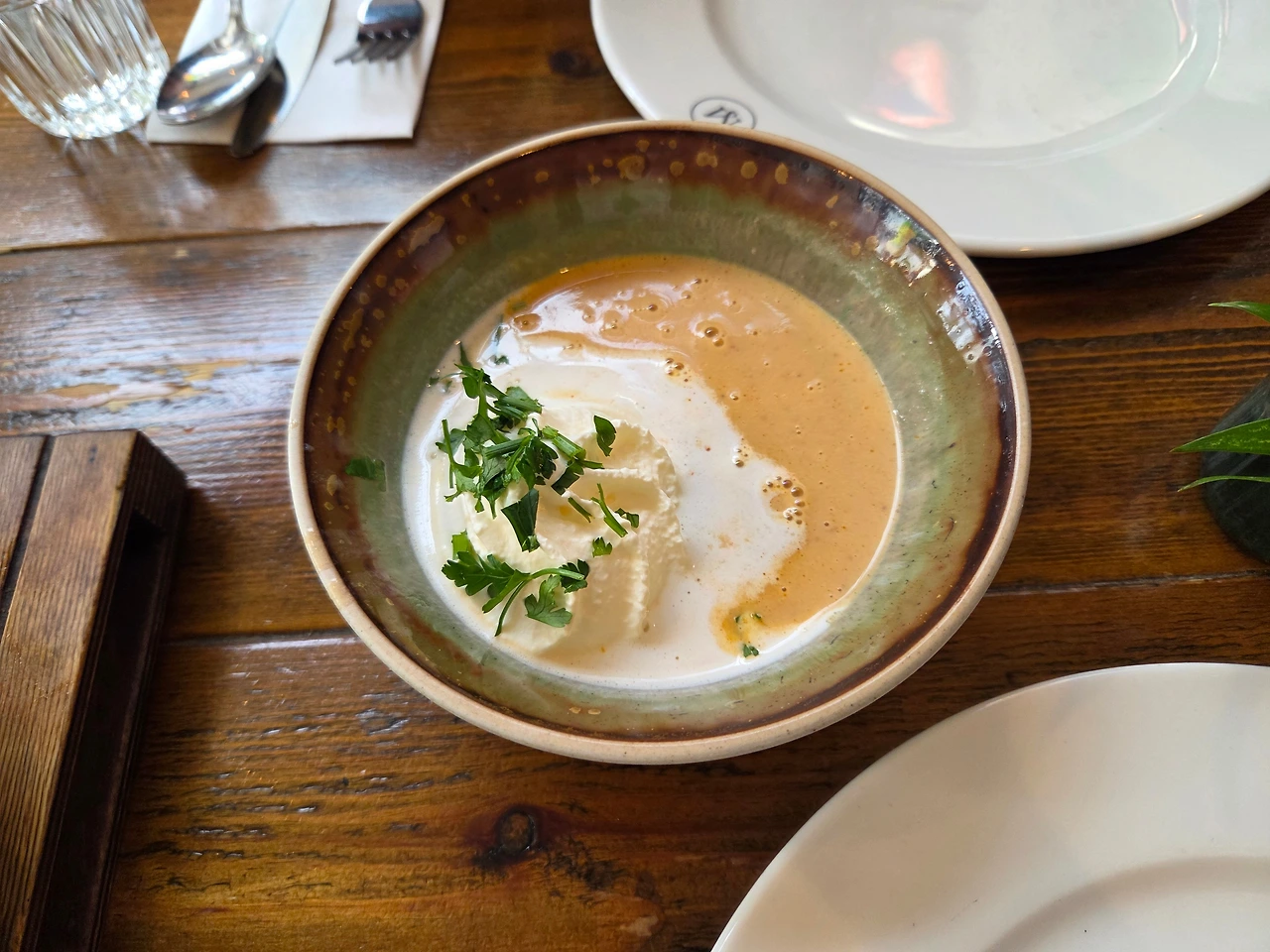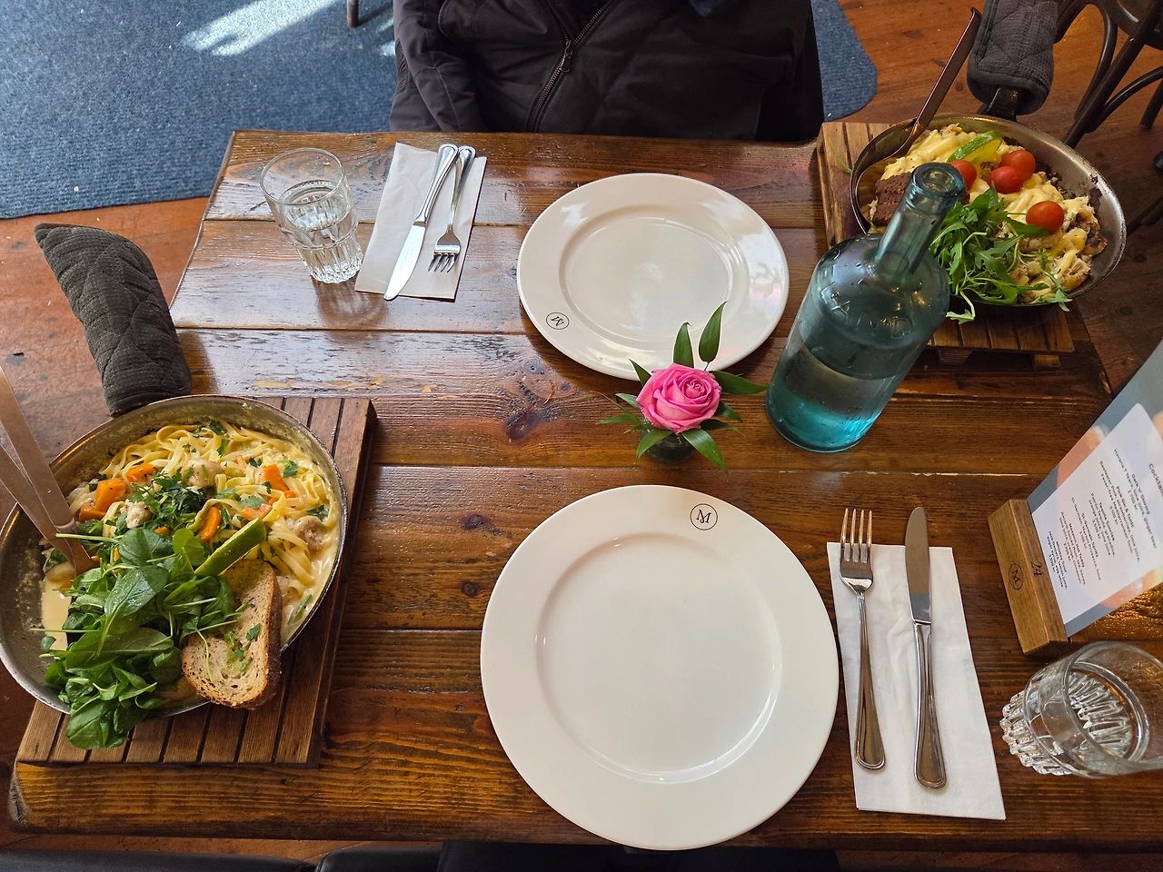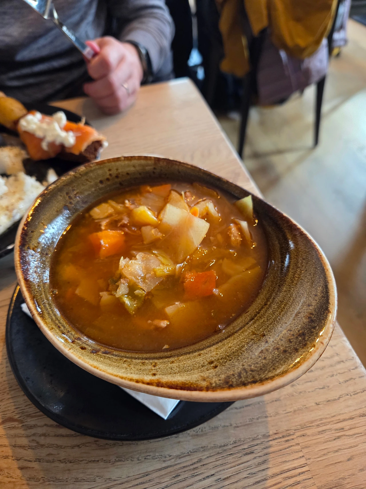 세트 메뉴 하나랑 메인 메뉴 하나를 시켰다. 세트 메뉴는 애피타이저+메인+디저트로 구성되어 있었다. 수프는 무난하게 맛있었고, 디저트는 그냥 흔하게 아는 팬케이크다. 아이슬란드식 홈메이트 팬케이크라고 써 있어서 뭔가 다를까 기대했는데, 다른 건 없었다.