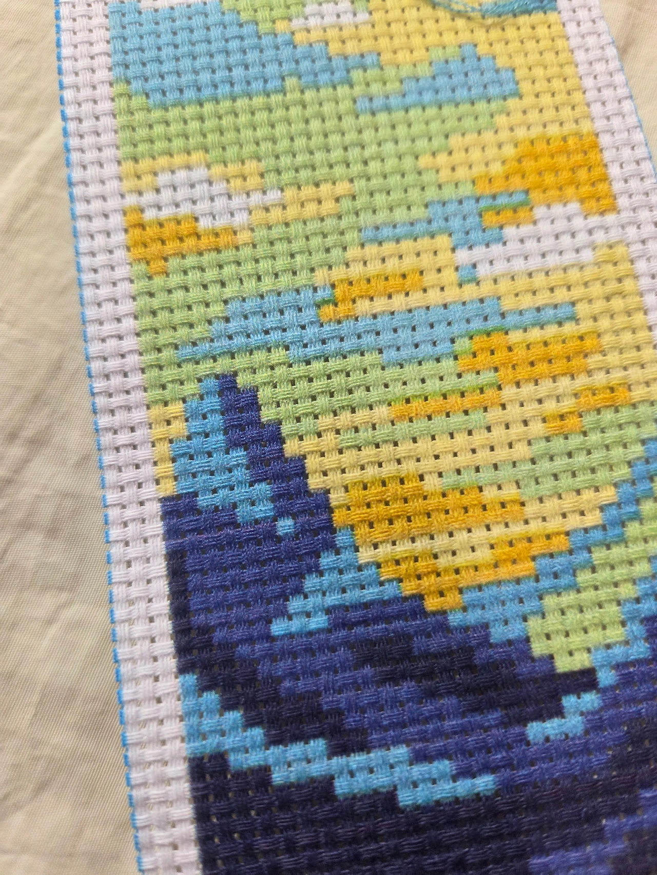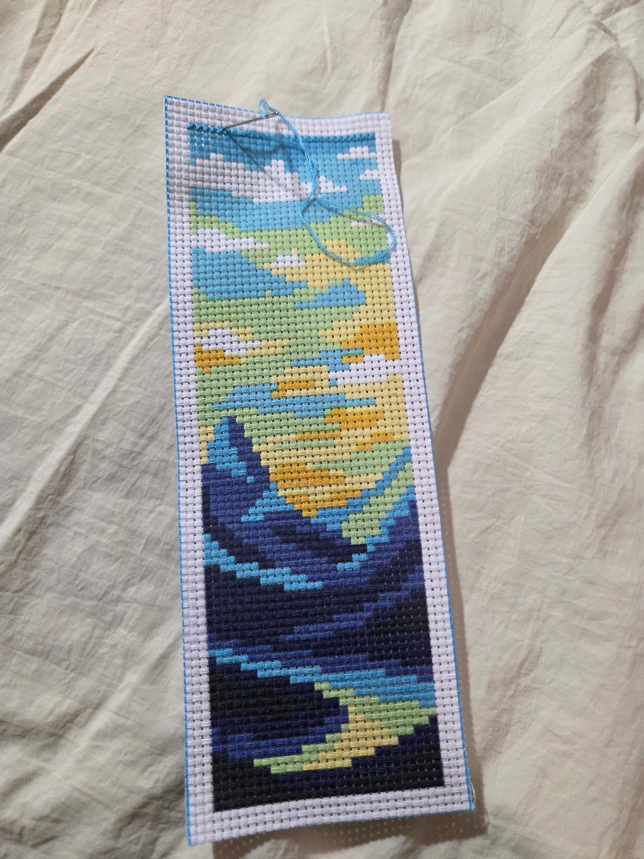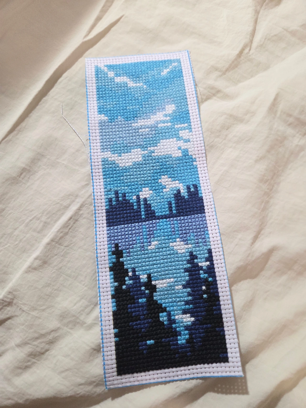 책갈피라고 해서 사이즈가 작을 줄 알았는데, 생각보다 컸다. 그리고 예전에 내가 십자수를 했을 때에는 흰 천을 줘서 도안을 보면서 칸 수를 잘 세어 가면서 했었는데, 이번에 보니 천 자체에 색을 칠해줘서 훨씬 편하게 할 수 있었다. 물로 비슷한 색이 붙어 있는 경우는 어떤 색이 맞는지 잘 봐가면서 해야되서 마냥 뇌 빼고 할 수 있진 않다.