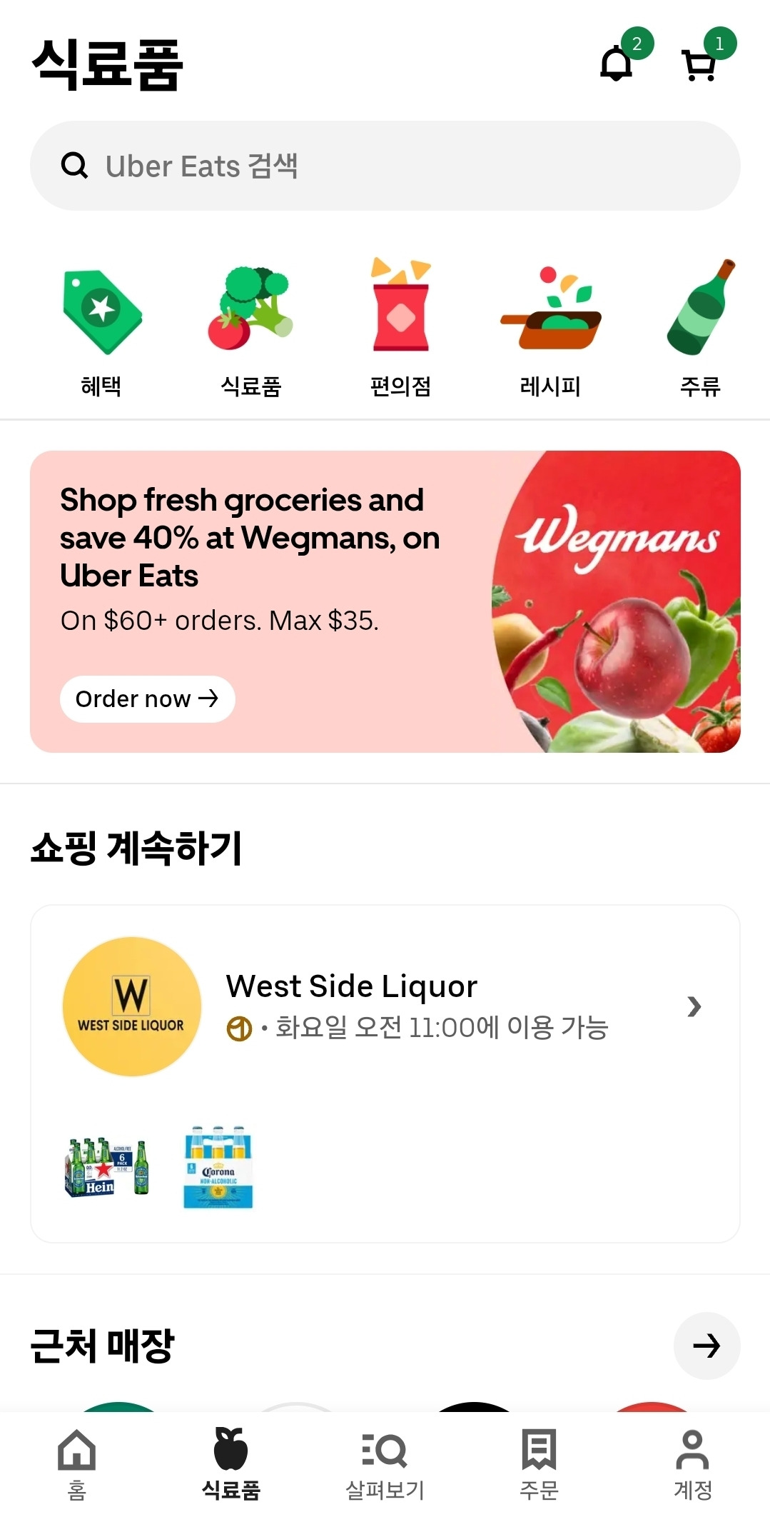 우버이츠에서 장을 볼 수 있는데 (마치 배민 B마트처럼) 꽤 괜찮다고 들었다. (실제로 써 본 적은 없다)