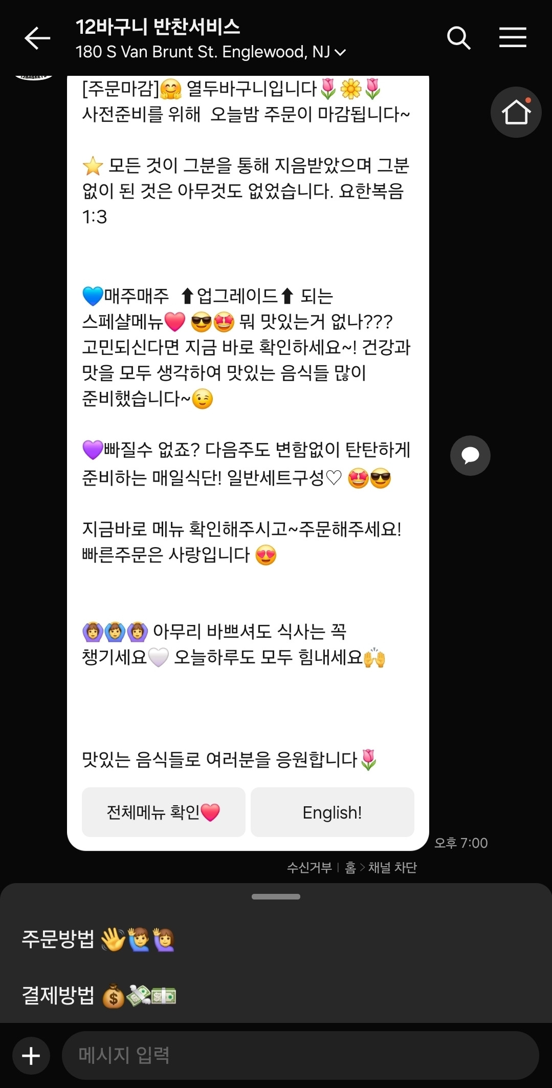 열두바구니라는 곳인데, 뉴욕+뉴저지 지역에 반찬을 배달해주는 서비스이다. (정기 구독 서비스는 아니고, 그냥 매주 구매하는 것이다) 매주 새로운 메뉴가 올라오고, 구매하면 된다. 주문할 수 있는 기간이 정해져 있고, 지역에 따라서 배송 날짜가 다르다. 카카오톡으로 운영하고 있다.
