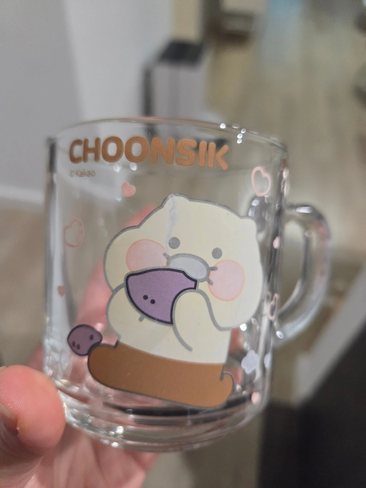 원래도 귀여운 캐릭터 상품을 좋아하기 때문에 선물 받고 아주 좋아했었다. 컵 가장자리에 끼울 수 있는 춘식이 피규어까지 세트로 있다. 컵 자체보다 피규어가 좀 더 귀엽다. 실제 컵을 사용할 때 피규어는 좀 귀찮아서 따로 치워놨다. (미국에 와서도 피규어를 한 번 본거 같아서, 아마 주방 서랍 어딘가에 있을 것이다...)