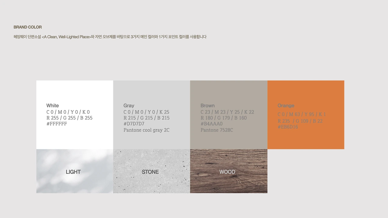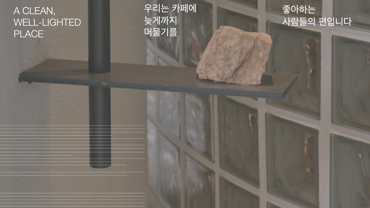 파주에 위치한 흔 커피바의 다양한 확장 어플리케이션을 제작하였습니다. 흔 커피바는 헤밍웨이 단편선의 <A CLEAN, WELL-LIGHTED PLACE>에서 영감을 받은 공간으로 일상에서의 비일상적인 공간을 지향하며 자연의 요소인 빛과 돌 혹은 철, 그리고 나무가 어우러지는 공간의 분위기를 바탕으로 작업한 결과물입니다.