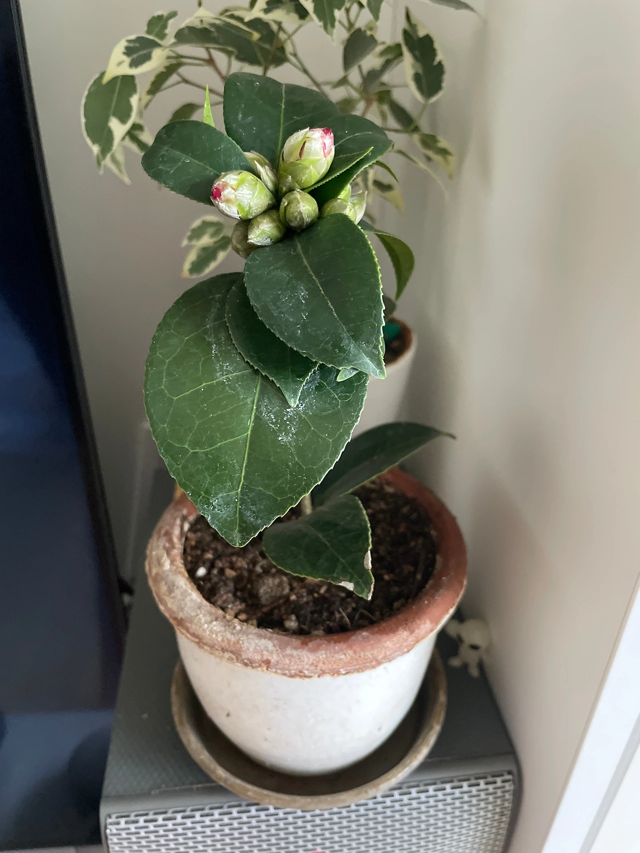 분갈이를 한 동백이 물고 있는 꽃봉오리들이