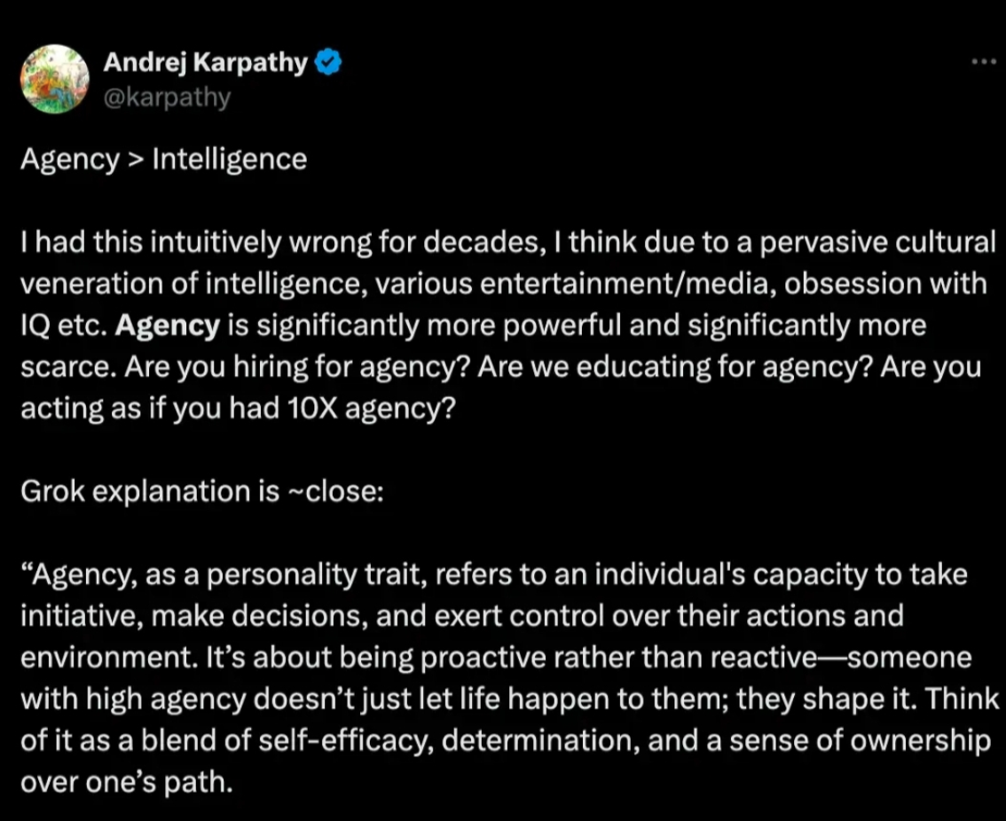 "나는 오랫동안 이 부분을 직관적으로 잘못 이해하고 있었다. 우리는 문화적으로 지능, IQ, 문제 풀이 능력 등을 지나치게 숭배해 왔다. 하지만 사실 진짜 중요한 것은 'Agency'다. Agency는 훨씬 더 강력하며, 훨씬 더 희소하다. 당신은 'Agency'를 기준으로 사람을 채용하고 있는가? 우리는 'Agency'를 기르는 교육을 하고 있는가? 당신은 10배 더 높은 Agency를 가진 것처럼 행동하고 있는가?"