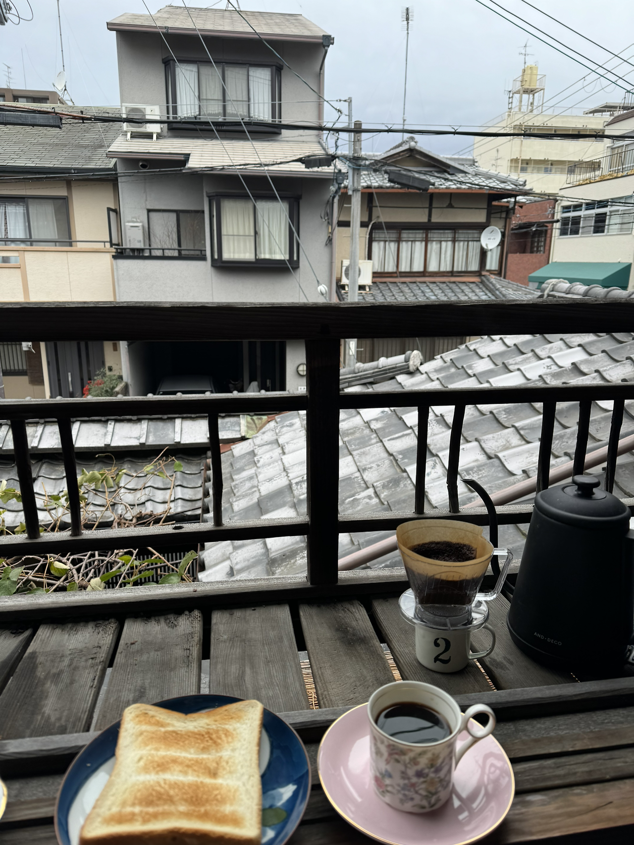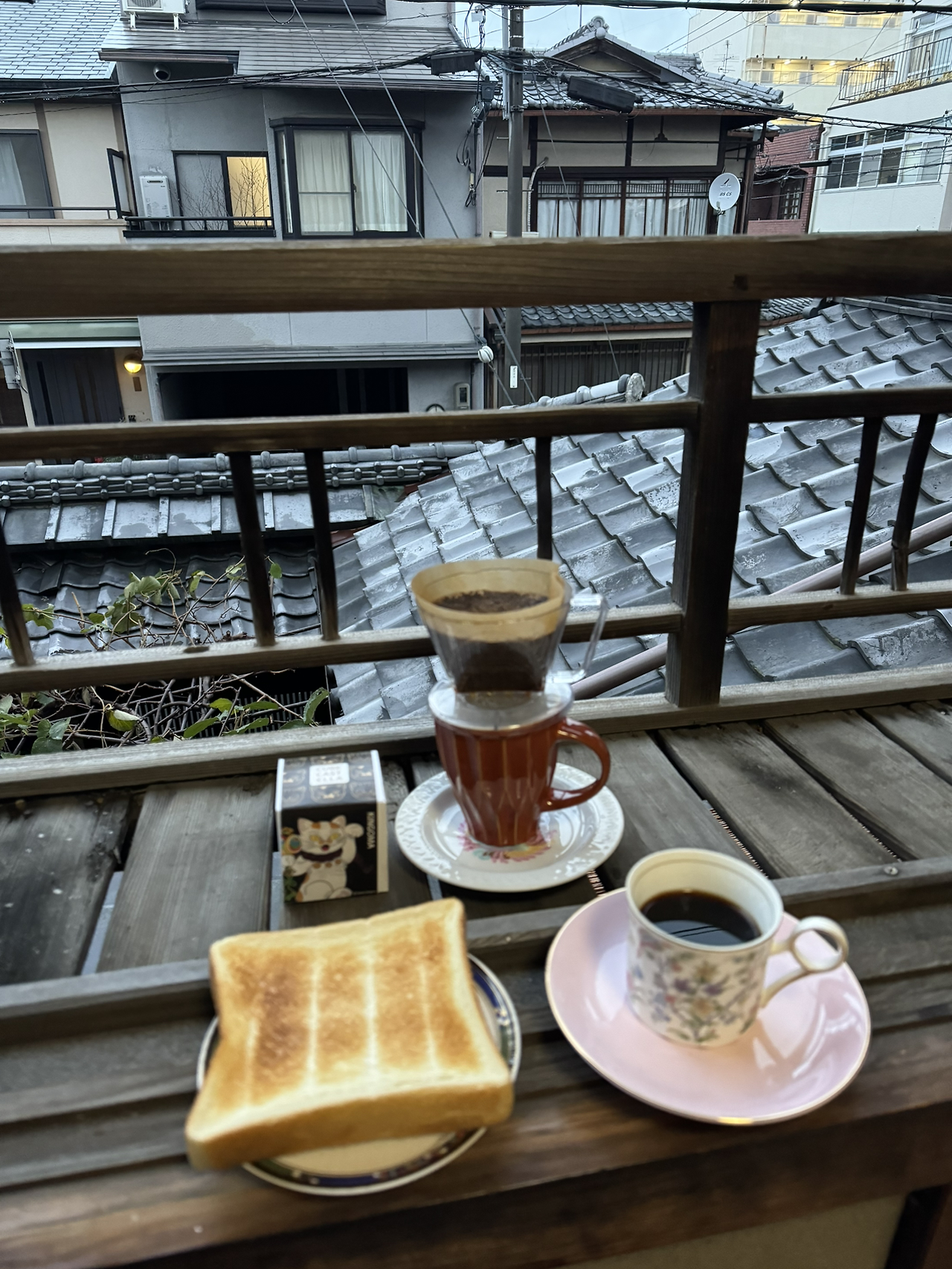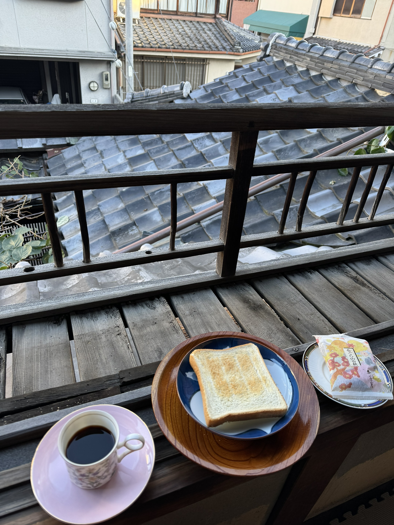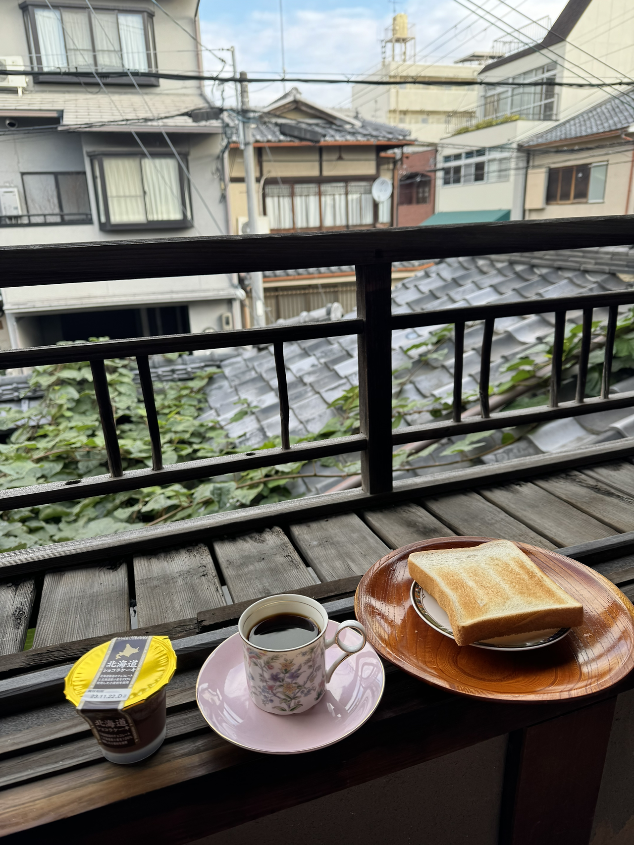 집에서나 교토 게스트하우스의 아침은 거의 변함이 없이 커피와 토스트, 크루아상 등으로 시작합니다.