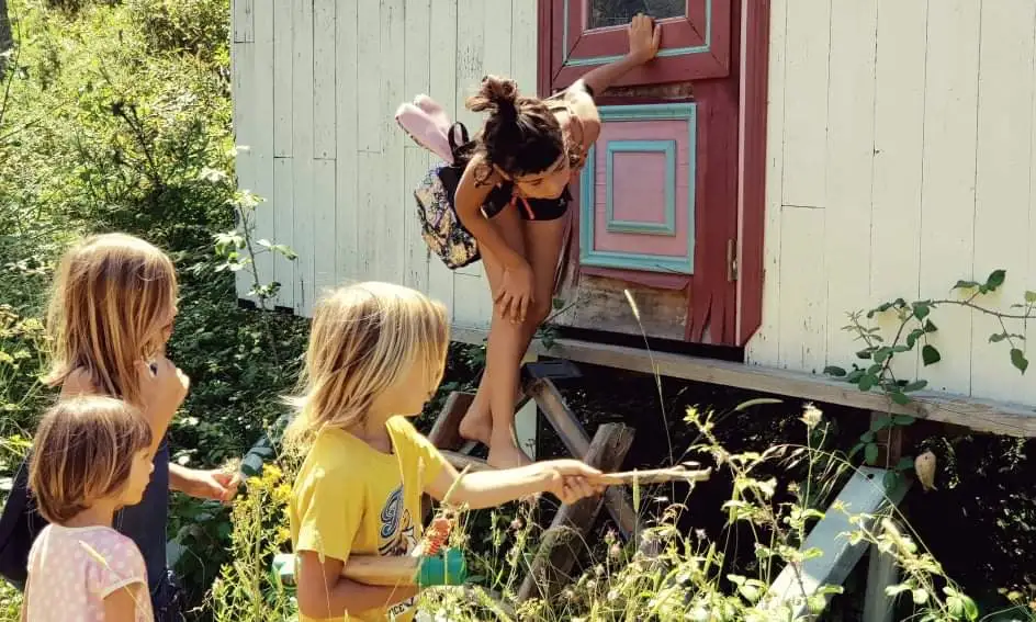 나무집 밑에 매달려 있는 작은 새를 관찰하는 아이들
