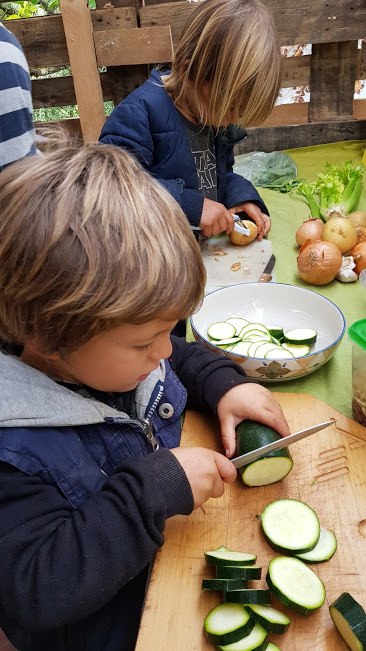 종강에는 뒤풀이가 있듯이, 마지막 주는 다 같이 음식을 만들어 함께 나누는 시간으로 정했다. 식물학 시간이었던 만큼, 메뉴는 바로 야채 수프! 먼저, 준비된 재료들을 샐러드, 과일, 콩, 뿌리 식물, 줄기 식물이라고 쓰인 푯말에 분류해서 놓는 간단한 놀이로 시작했다. 각자가 준비해 온 칼과 도마, 강판에 재료들을 잘게 자르는 작업이 시작되었다. 직접 자신의 손으로 만든 음식을 함께 먹는다는 것에 설레어하며, 고사리처럼 작은 손으로 야채들을 싹싹 잘도 잘라간다. 커다란 냄비에 잘게 썰은 야채들을 넣고 물과 소금, 후추, 약간의 올리브 오일을 넣고 30분을 끓였다. 아이들은 스스로 직접 요리해서 모두 함께 나눠 먹는다는데에 상당히 뿌듯해했다.