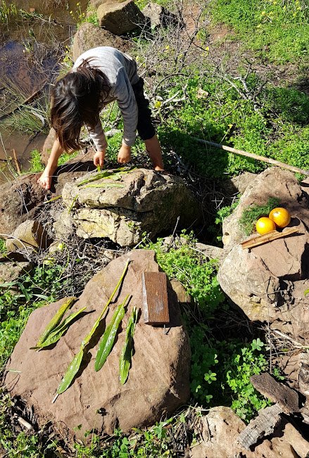 직접 뾰족한 돌을 이용해 만든 창으로 물고기를 사냥중인 아이들