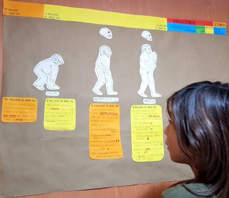 사자 가면을 제작하여 불이 발견되기 이전의 상황을 재현해 보기로 했다. 율이가 자진해서 사자 가면을 쓰고 아이들을 쫒아다니기 시작했다. 사자를 본 아이들은 여러 방향으로 도망가기 시작했고, 몇몇은 나무 위로 올라가거나 도망가다 못해, 돌을 던지거나 기다란 나뭇가지로 방어 공격을 시도하기도 했다. 또한, 사자가 다가오는 것을 보고 위험을 알리기 위해서 우리가 보통 쓰는 언어가 아닌 알 수 없는 언어지만 톤으로 위급하다는 것을 알리기도 했다. 그러던 중, 빨간 셔츠를 나무 위에 던져 천둥 번개로 인해 우연히 나무에 불이 붙었다고 이야기가 전개되었다. 역사적인 순간이다! 불을 본 율이는 자신이 사자인 것도 잊어버리고 불이 붙은 나뭇가지를 가지고 뛰어다니기 시작했다. 그렇게 사자와 원시인이 바뀌어버리는 웃지 못할 상황이 생기긴 했지만, 그래도 원시인들이 불을 이용해 사자로부터 자신을 방어하기 시작했었다는 것을 아이들은 놀이를 통해 체험하면서 익혀갔다. 이렇게 약 15~20분에 걸쳐서 재현된 상황 놀이 속에서 아이들은 많은 것들을 건져갔다. 사자가 왔음을 알리는 위험 신호를 알수 없는 언어를 사용해서 다른 이들에게 알려주었다. 또한, 방어 공격으로 사용한 돌 Amigdale이 주는 의미가 아주 크기도 했다. 이는, 그들이 도구를 사용하기 시작했음을 의미한다. 이 당시로 추정되어 발견된 돌 Amigdale은 손에 쉽게 쥐어지는 크기로, 쉽게 깎여지는 돌 Selce을 이용해서 만들어졌다. 짐승들로부터 방어나 공격을 하기 위한 무기로써, 또는 자르기 위한 도구로써 사용되기도 했었다. 마지막으로, 불의 발견과 불의 사용이 주는 커다란 의미가 하이라이트였다고 할 수 있다.