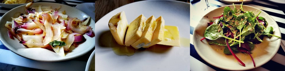 반찬처럼 내놓은 요리들은, 치뽈리네 Cipolline, 치즈, 샐러드이다. 치뽈리네 Cipolline는 길게 생긴 양파로, Timo, Salvia, Rosmarino와 함께 올리브 오일에 볶았다. 치즈 위에는 일본 참기름을 뿌렸다. 왜냐하면, 도통 한국에선 참기름 향이 강해야 좋은 참기름인데, 유럽에선 보통 향이 너무 강하면 좋아하지 않는다. 음식의 고유의 향을 없앤다고나 할까? 음식에 기름을 사용하는 방식이 달라서 라고 이해하면 될 것이다. 한국에선 참기름은 아주 조금만 약간의 향을 내기 위해서 2방울 넣는데 비해, 유럽에서 기름을 음식 위에 뿌릴 때에는 꽤 많이 뿌린다.( 물론, 내가 요리할 때에는 그런 거 신경 안 쓰고, 한국 참기름이 최고라 여기고 쓴다. 하하하!) 마지막으로 샐러드는 해바라기 씨와 볶은 메밀을 뿌려 발사믹 소스와 올리브 오일을 뿌렸다.