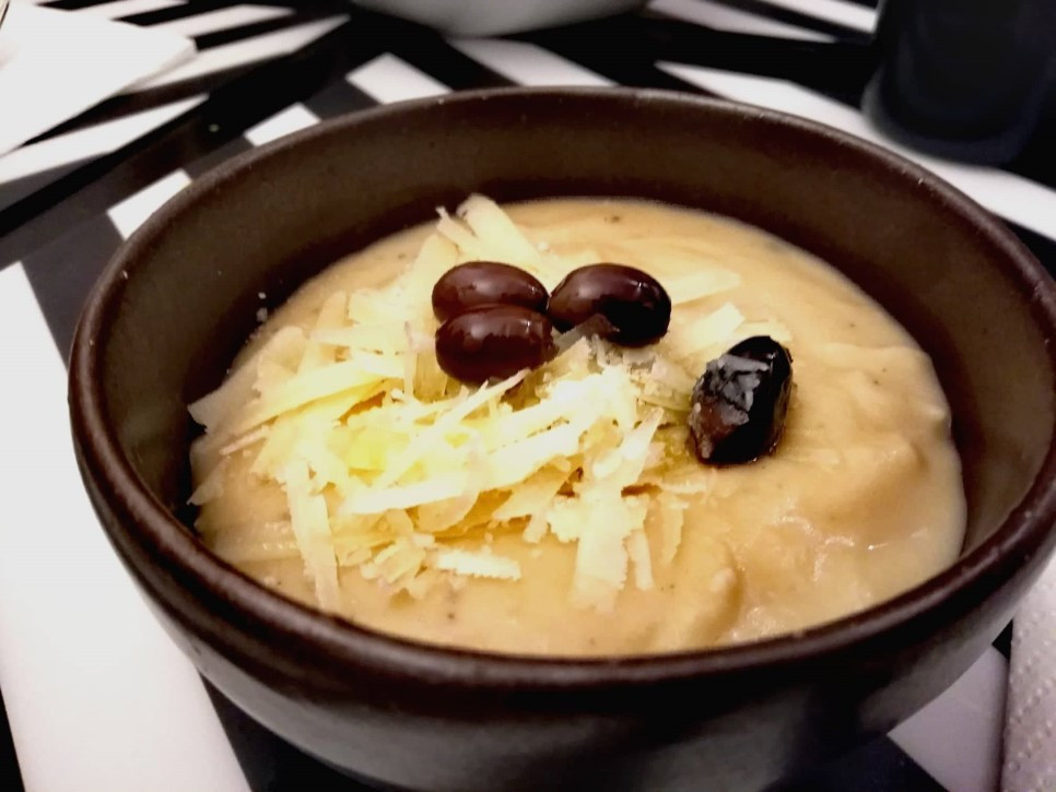콩 스프(fave) : 큰 냄비에 콩(fave), 양파, timo, rosmarino를 물에 익혀서 믹서기에 갈아 그릇에 담고, 염소 치즈를 갈아 위에 살짝 얹고, 올리브를 올려 마무리 한다.
