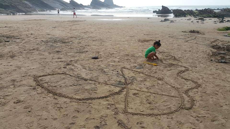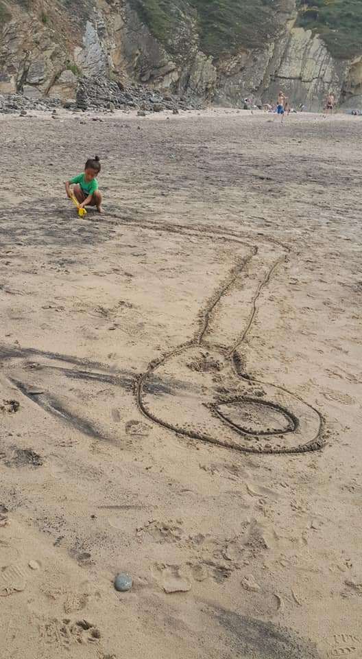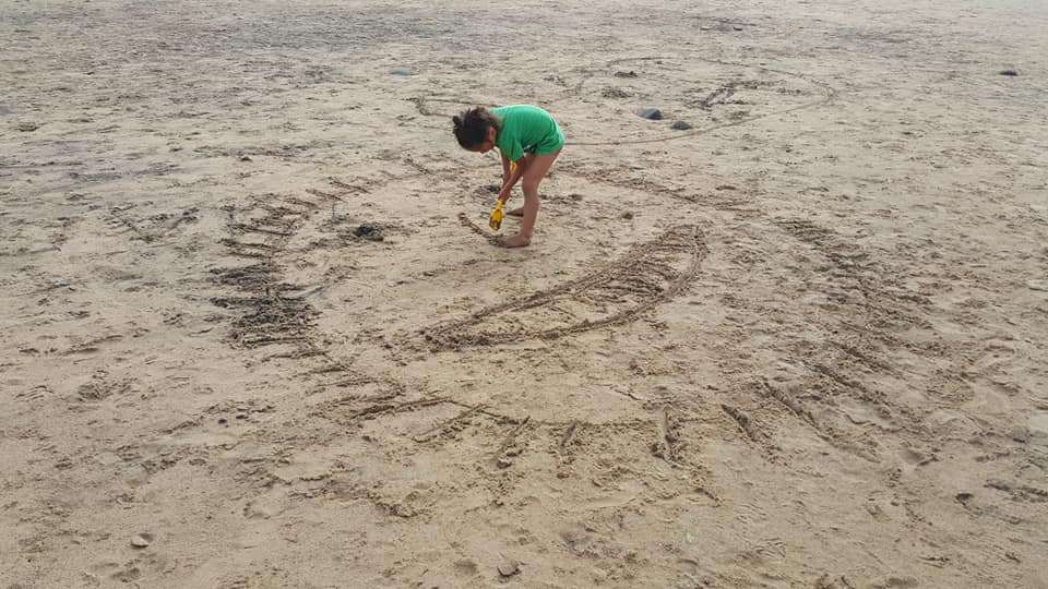나스카라인에 관련된 책과 도큐멘터리를 본 뒤, 어느날 갑자기 미친듯이 커다란 그림을 그리더니, 하늘에서 본 것처럼 위에서 보고싶었다고 한다. 이 바닷가는 위에서 내려볼 수 있는구조